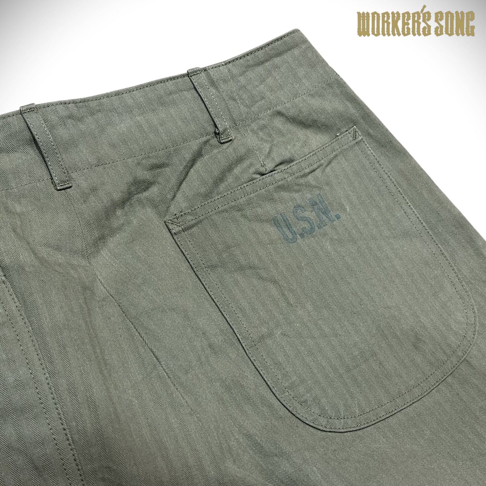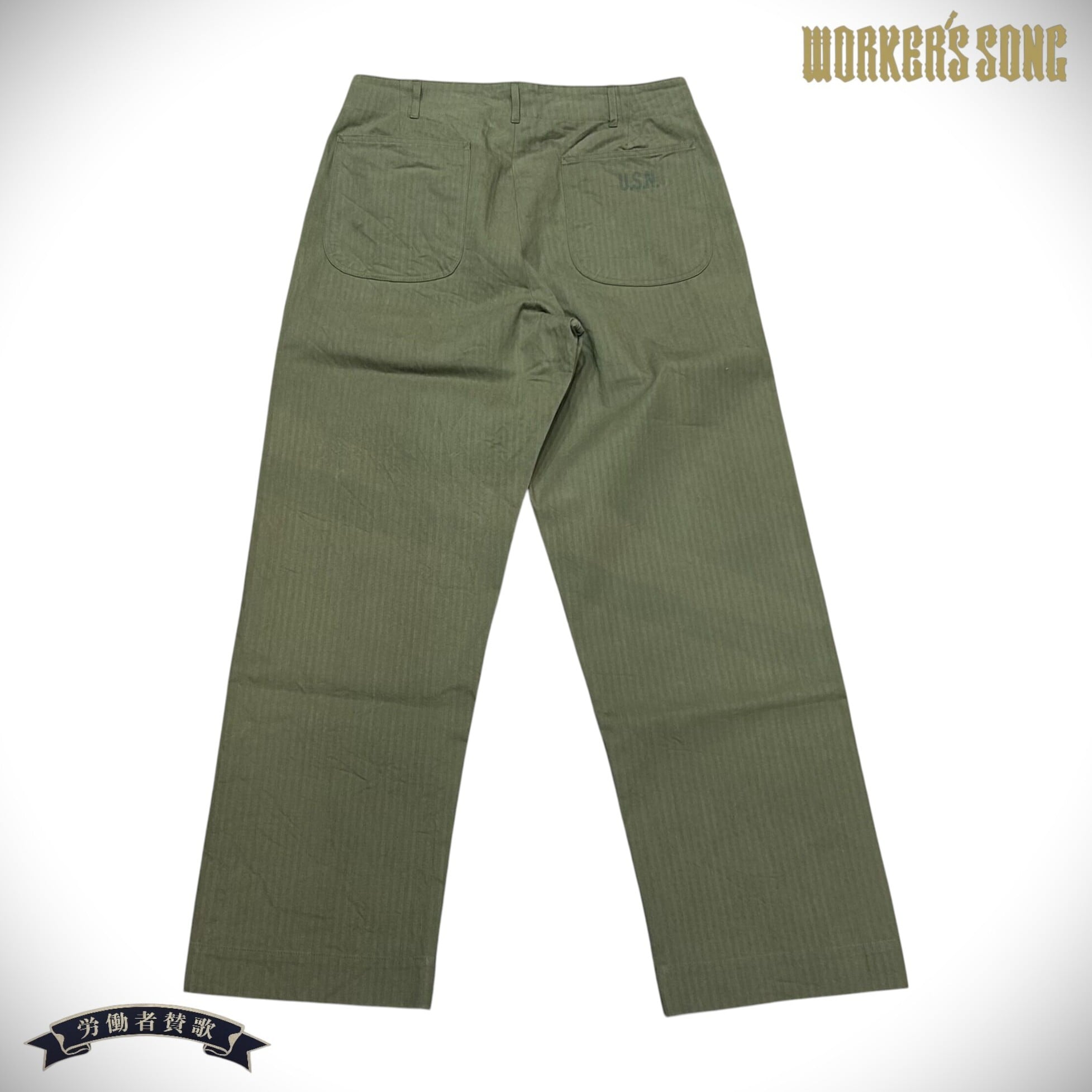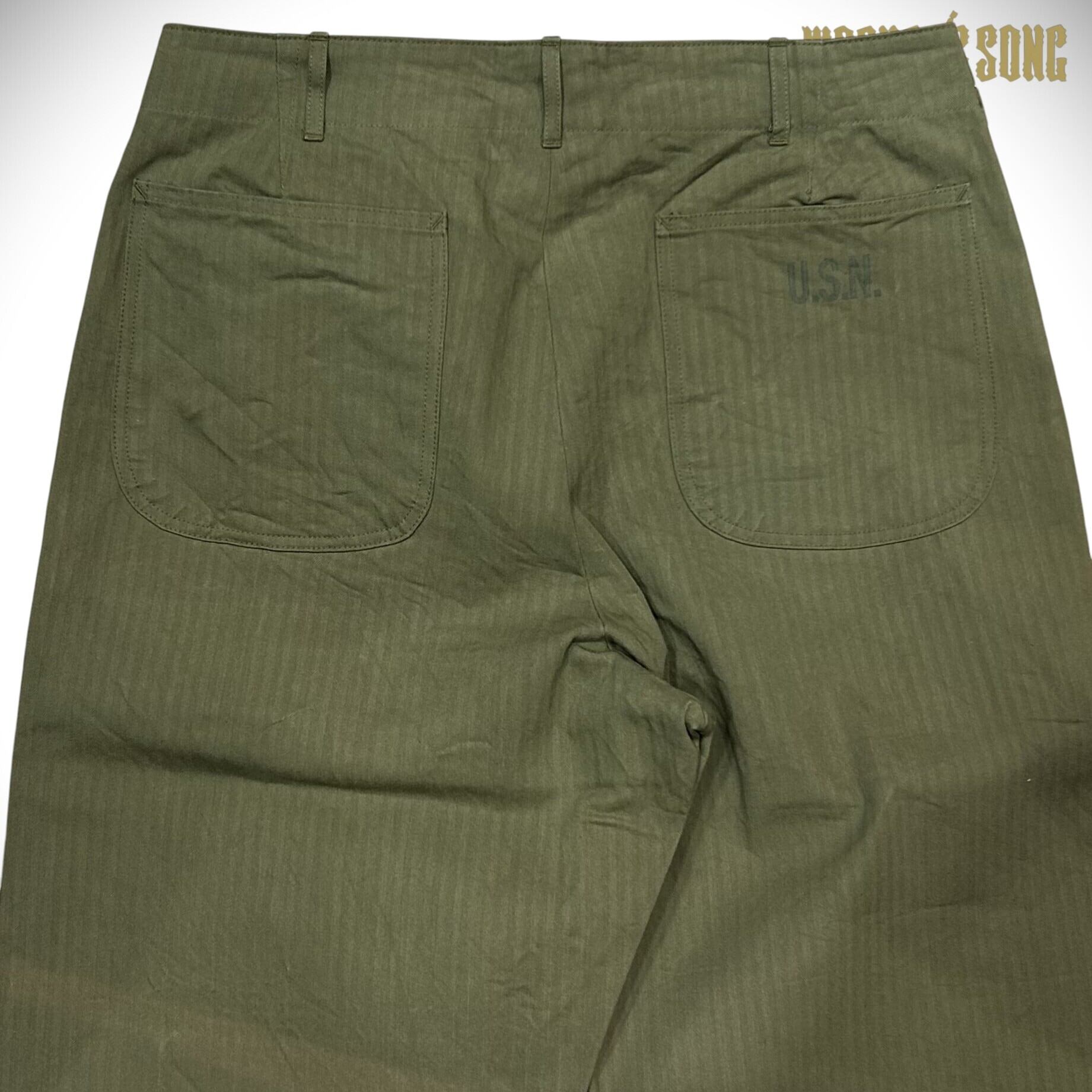 米海軍が1940年代初頭に採用したN-3ユーティリティーパンツ。シンプルにヒップポケットが2つ付いた仕様は同時期に米海兵隊が採用したパンツM-41と同じ外観を持つ。ヒップポケットにマーキングされた「USN」でN-3ユーティリティーパンツと判別する。ボタンは大戦期に使用された黒塗りのドーナツ型タックボタンで月桂樹の刻印が施されている。第2次大戦が勃発し兵士が増員されると装備品の追加生産が急がれ、このN-3のように1つの素材で裏素材からポケット地までを形成したパンツで対応し、量産性に備えた。