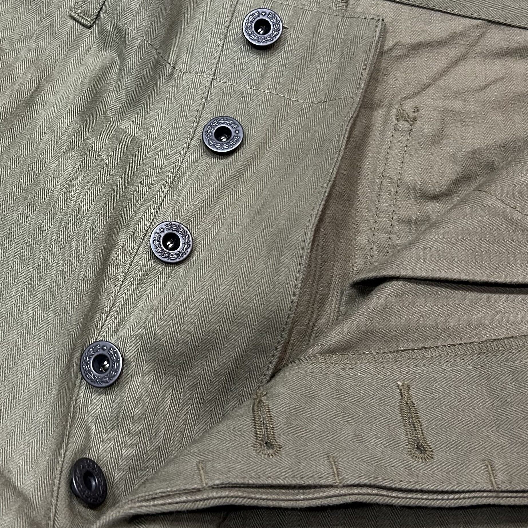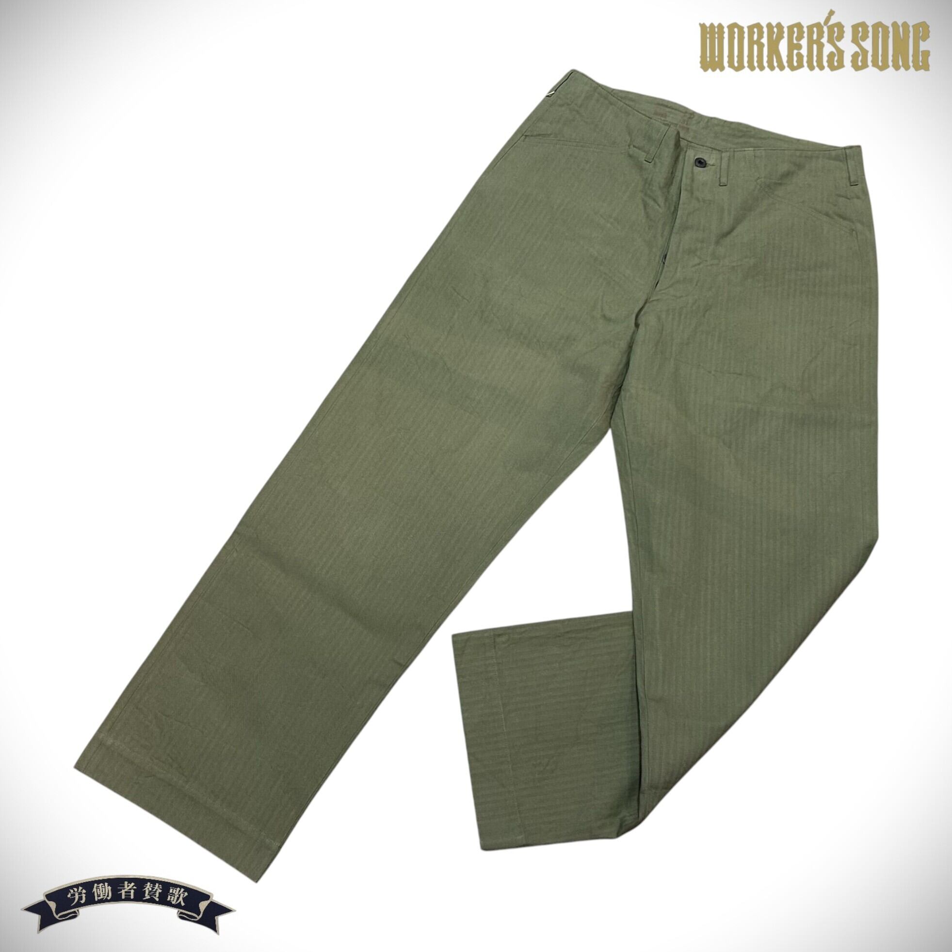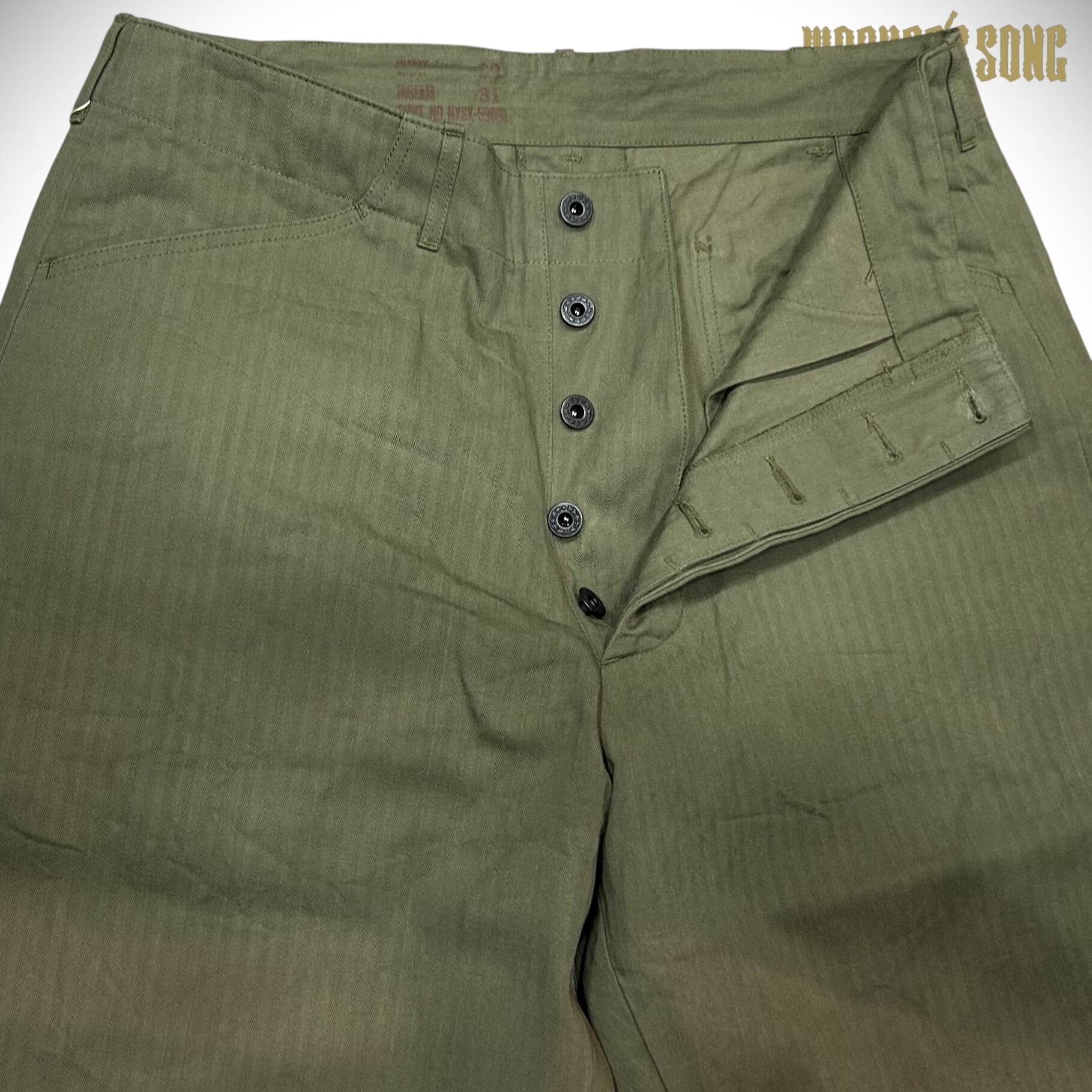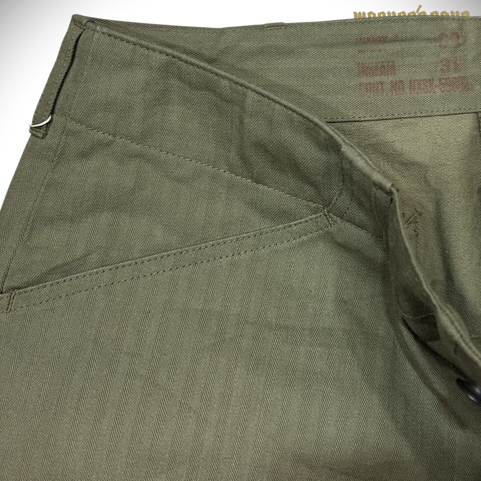 米海軍が1940年代初頭に採用したN-3ユーティリティーパンツ。シンプルにヒップポケットが2つ付いた仕様は同時期に米海兵隊が採用したパンツM-41と同じ外観を持つ。ヒップポケットにマーキングされた「USN」でN-3ユーティリティーパンツと判別する。ボタンは大戦期に使用された黒塗りのドーナツ型タックボタンで月桂樹の刻印が施されている。第2次大戦が勃発し兵士が増員されると装備品の追加生産が急がれ、このN-3のように1つの素材で裏素材からポケット地までを形成したパンツで対応し、量産性に備えた。