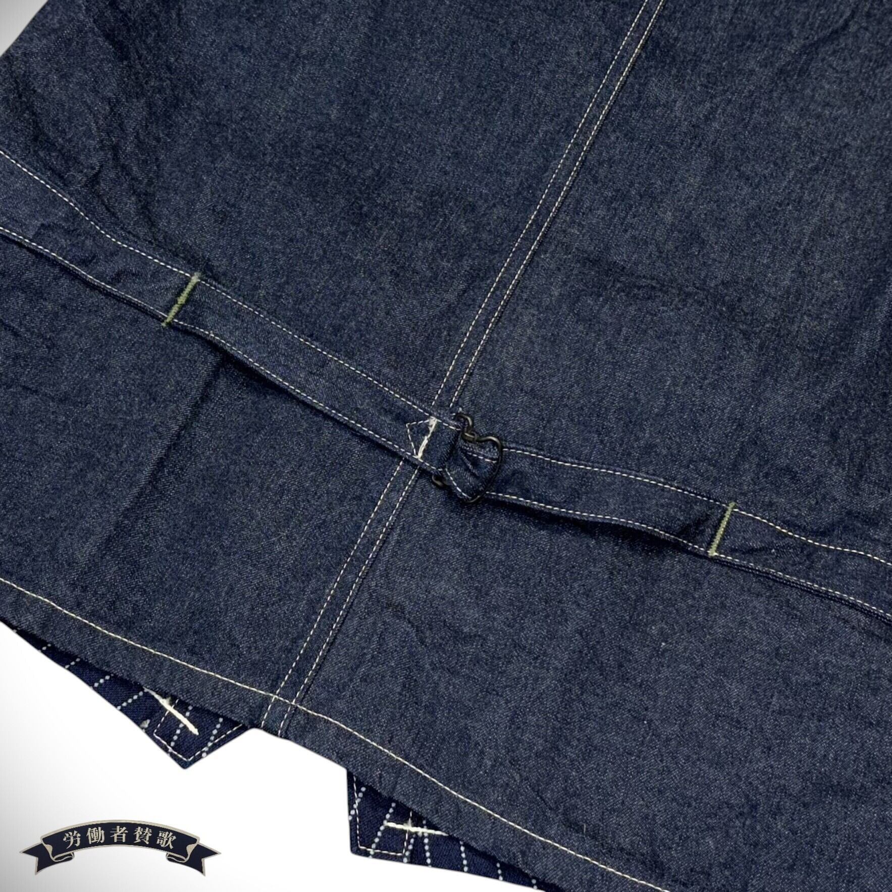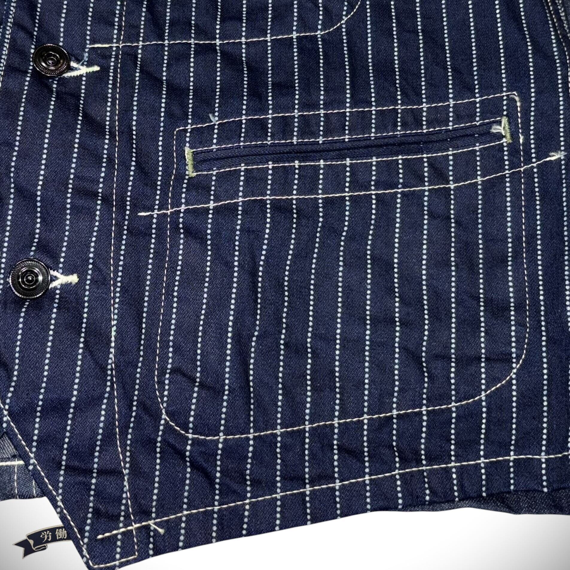 9オンスのウォバッシュストライプ生地で仕立てたワークベスト。 後身頃には11オンスのデニム生地を使用している。