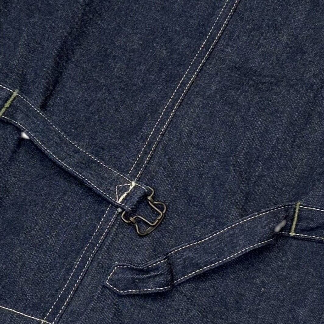 身頃に打ち付けられたタックボタンはワークウエアならではの高い強度を誇るディテール。 胸ポケット横には懐中時計のチェーンを留めるためのホールが設けてある。 ポケットは高度な技術を要する極細の両玉縁仕様で、セルビッジを配している。 右胸には内ポケットも装備。