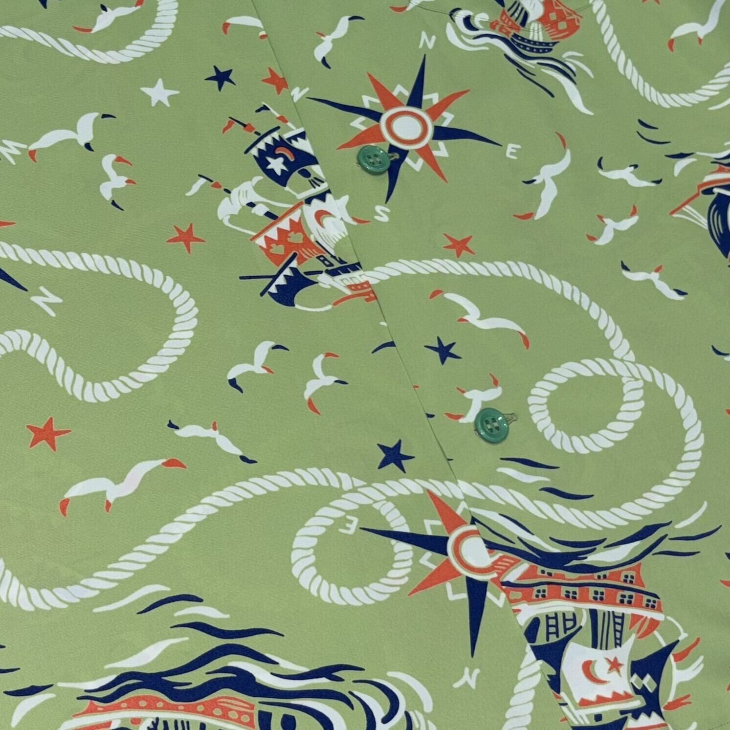 大型の帆掛け船による大海への航海がシャツ一面を使い表現された作品。ロープに羅針盤、夜空に輝く星、船の周りを飛び交うカモメが絶妙なバランスで配置されている。手がけたのはアメリカ本土で数多くのアロハシャツを生み出したブランド「メイド・イン・カリフォルニア」。同ブランドはアメリカ本土でのアロハシャツの爆発的な流行が起こるきっかけを作ったと言っても過言ではなく、人々を引きつける魅力的な作品を次々と世に送り出した。