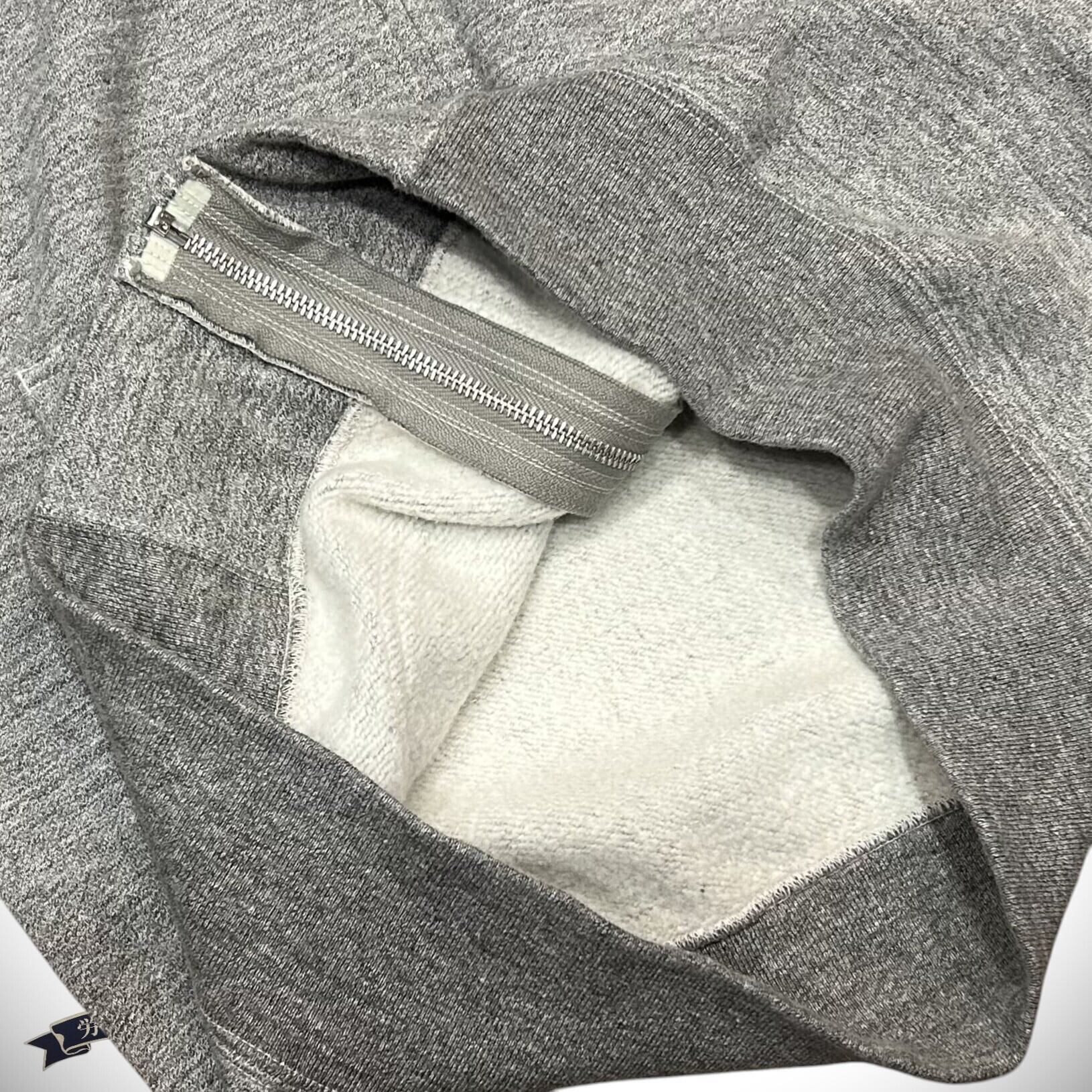 現代主流のポケットとは形状が違い、クラシカルな印象を持つラウンド型のパッチポケットを採用したスウェットパーカ。このラウンド型は生産時に置いて型を整えて縫合する必要があり、非常に手間の掛かるリスキーな仕様。肩の縫い合わせから袖付けを一周する2本針の仕様はヴィンテージを踏襲している。