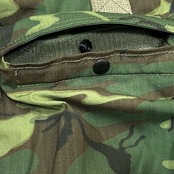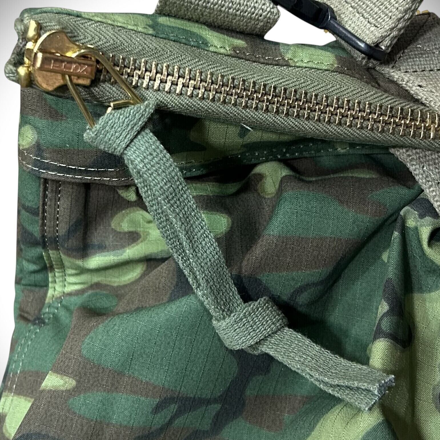『ERDL』の生地を使用したバズりクソンズ・オリジナルのヘルメットバッグ。1965年頃になると米軍は本格的カモフラージュ『ERDL』を完成させた。ジャングルに生い繁った葉をイメージしたデザインは別名『リーフパターン』とも呼ばれている。初期の『ERDL』はコットンポプリンを使用していたが、後期モデルは引き裂きに強いコットンリップストップに変更した。『ERDL』とは米軍の『Engineer Research and Development Laboratory』(技術研究試験所)が開発したため、その頭文字を取って略称されている。外側と内側で計5つものポケットが収納力にも優れ、中綿があるため中に入れたものを外部の衝撃から守ってくれる。