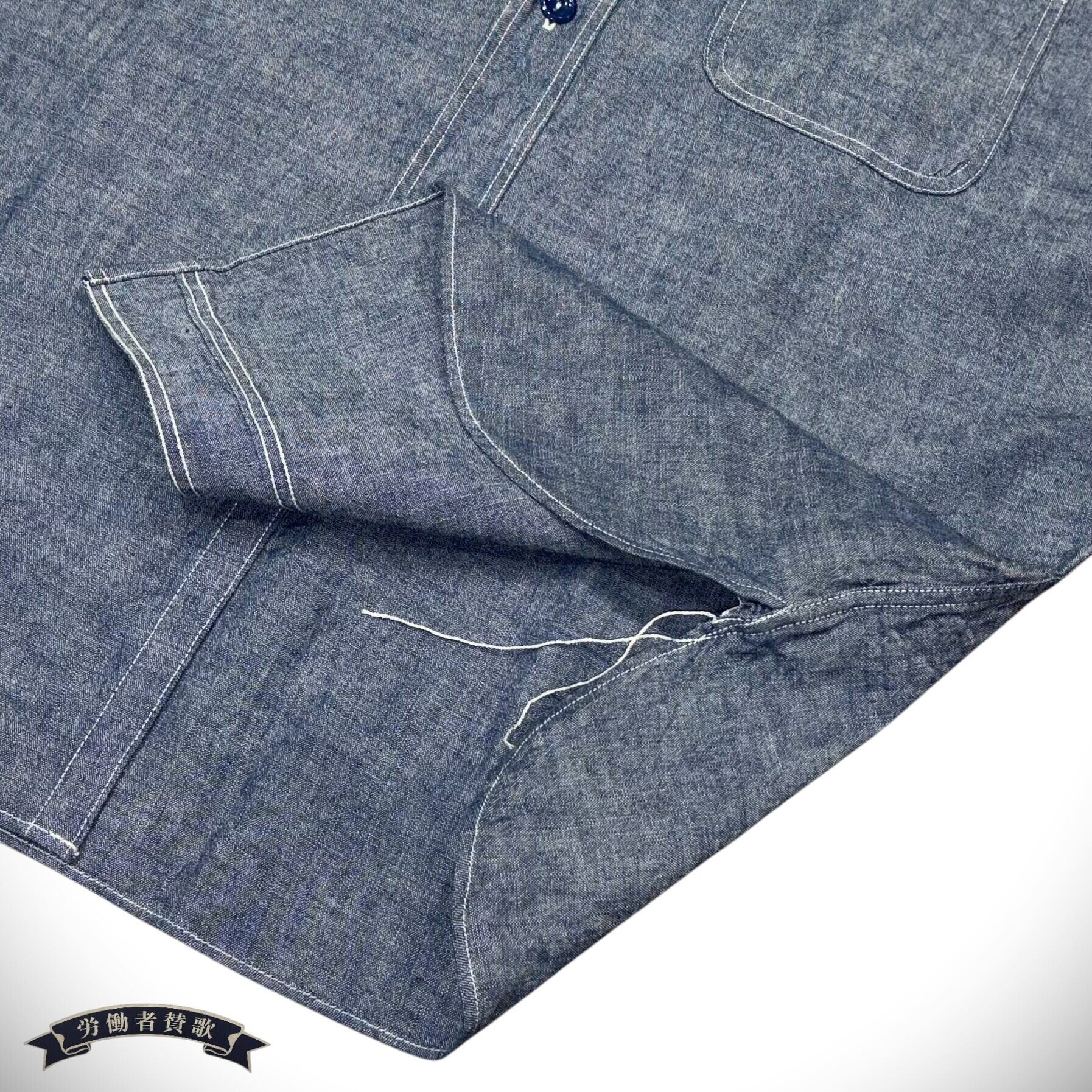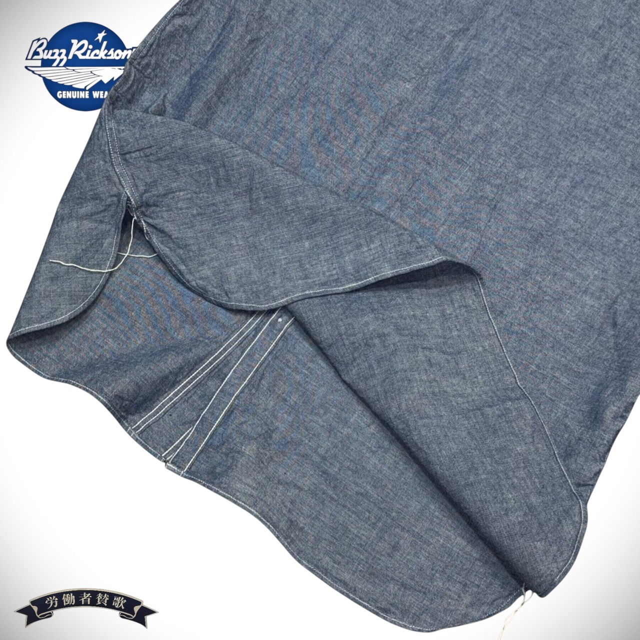 米海軍が採用したシャンブレーシャツは1930年代から現在まで支給が続く息の長いユーティリティーシャツである。このシャンブレーシャツは1950年代に採用したシャツのリプロダクション。時代の移り変わりと共に型や仕様に変化が見られたが、採用当初から1950年代に採用されたシャツは裾の両サイドはマチ付きが付き、台襟のある襟に前立てが付いた古き良き時代の仕様。この時代のシャンブレーの生地はテンションがあまく、洗濯を繰り返すことで縮みが生じて特有の風合いとなるのが特徴。
