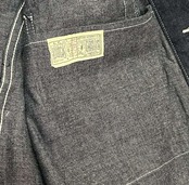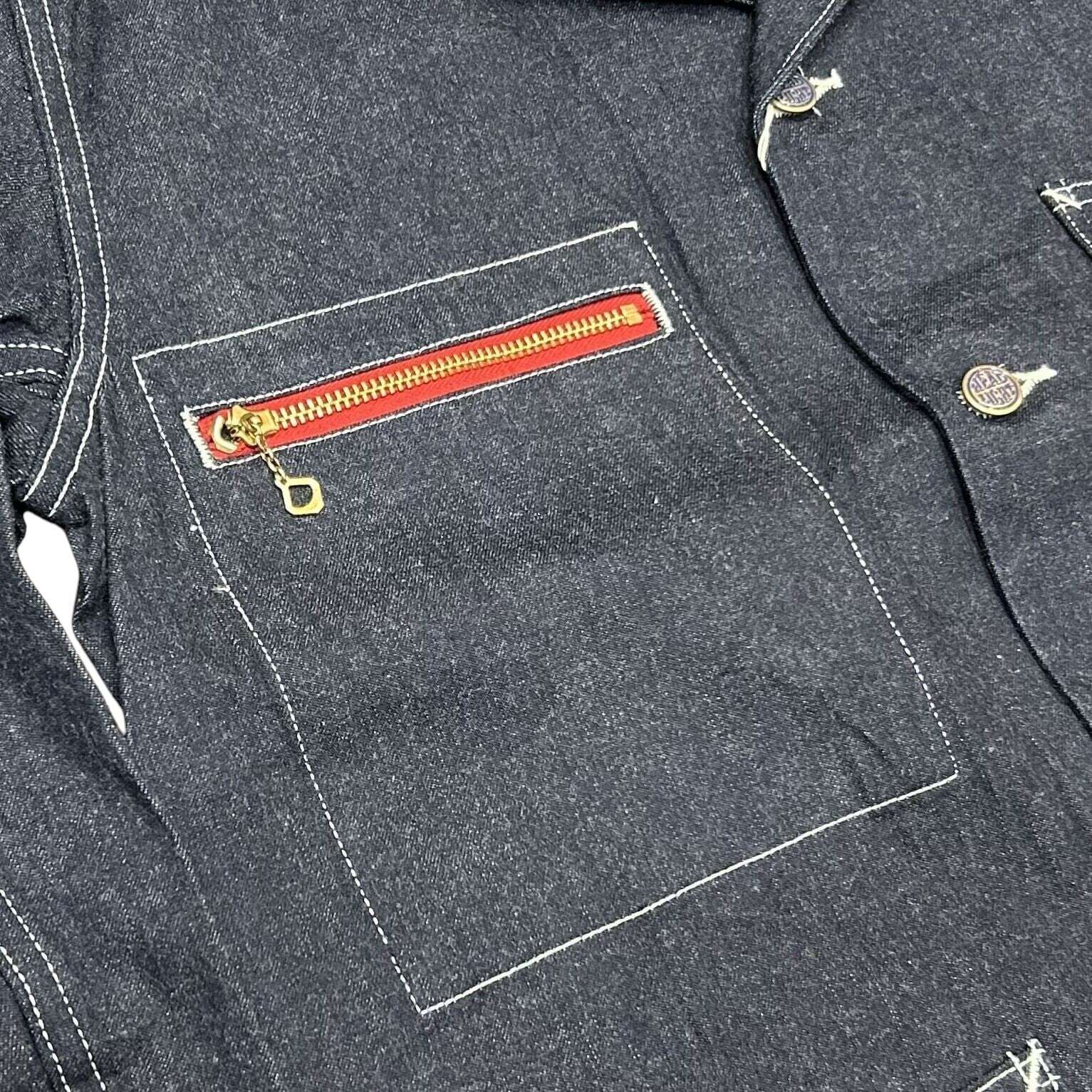 右胸にファスナーポケットの付いた非常に珍しい1950年代のワークコート。中でもレッドのファスナーテープ仕様のものは、まず見かけることのないレアなタイプで当時のスペシャルオーダーモデルと推測される。生地は緯糸がグレーのブルーデニム、襟は台襟が無いためボタンで閉じてもフィットするコンバーチブルカラー。腰には左右に大型の当て布付きポケットを持ち、左胸には内ポケットも装備している。レッドのファスナーテープはコットン製のため、デニムと同様に褪色などの経年変化に期待できる。