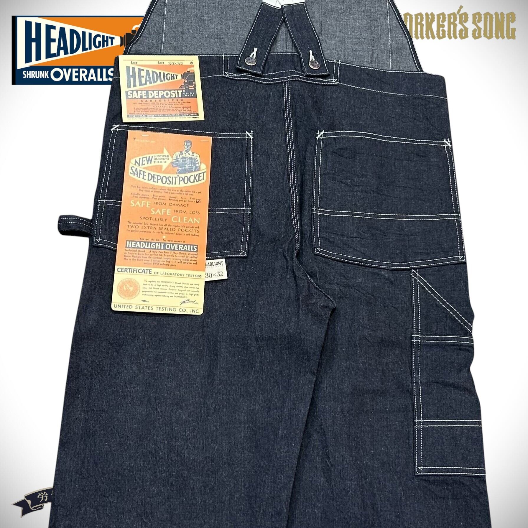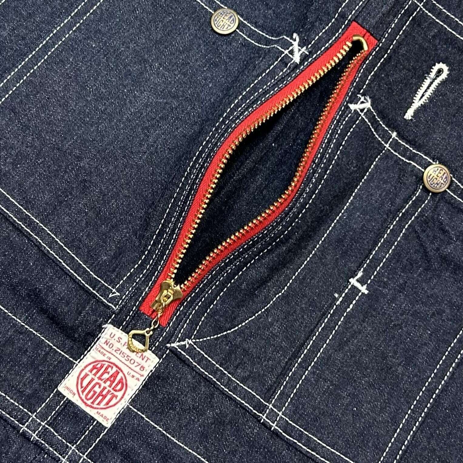 1936年11月24日に申請し、1939年4月18日に特許を取得したものの、大戦後にようやく実用化となる「セ―フデポジットポケット」を搭載した1950年代のオーバーオール。胸当ての中心にあるファスナーの内側に大型のポケットがある仕組みで、当時の広告には「収容物のダメージや紛失が少なく、汚れからも保護できる」と謳われていた。ローバックタイプのオーバーオールで、バックストラップがエラスティックパーツで編み込まれたサスペンダーのため、動きやすさに特化した仕様。通常ではネイビーのファスナーテープなのに対し、今回は遭遇率が1割にも満たない非常に珍しいレッドのファスナーテープが付けられたスペシャルモデルとなっている。