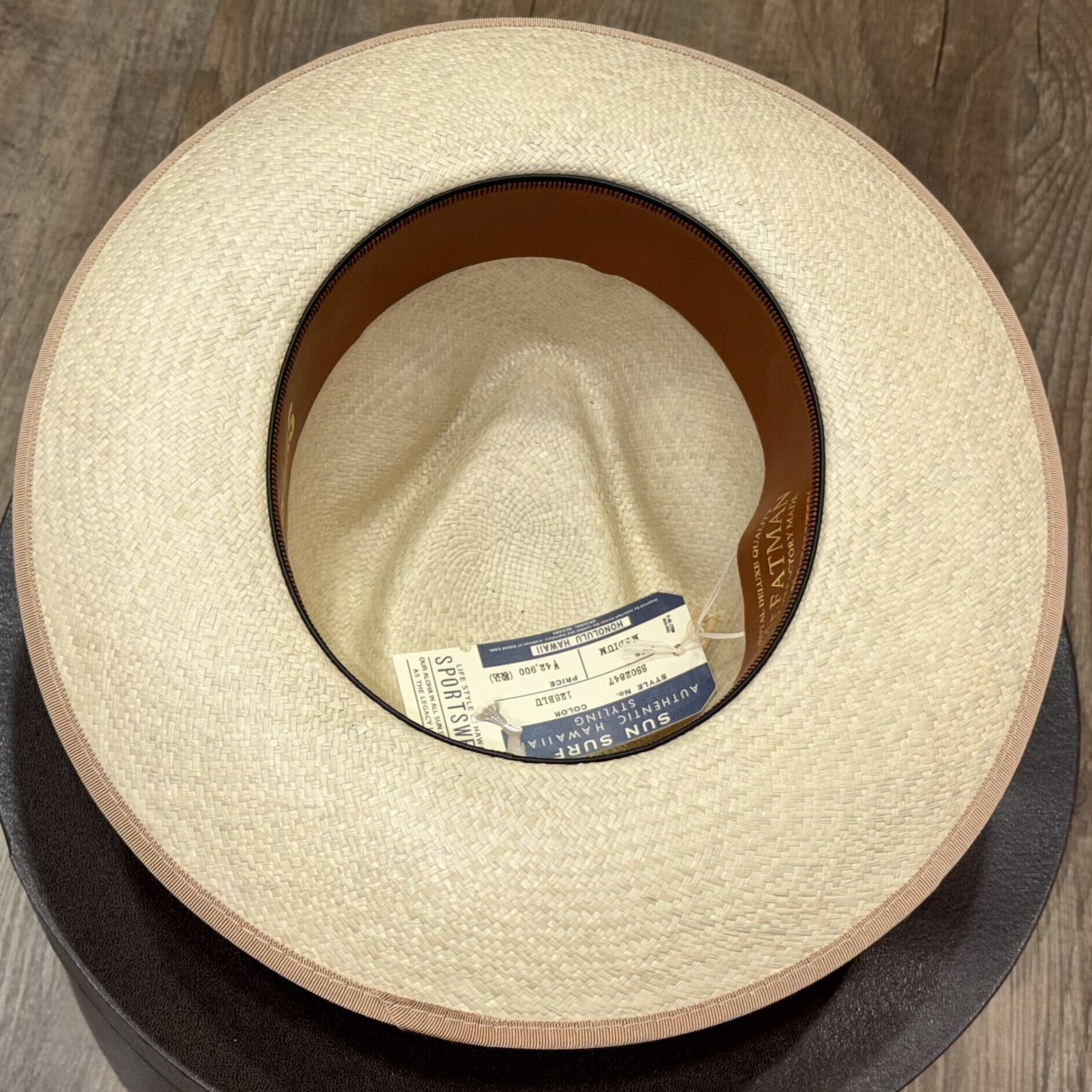ファインラフィア(ラフィア椰子)を使い、石目編みで仕立てられたアイランドハット。スベリには牛革を使用し、当時の流れそのままに、ハットを手がけたMr.FATMANとオーダーをしたSUN SURFの箔押しがスベリに施されている。(Sサイズのみ、サイズ調整に特化した仕様のため、ナイロン素材のアジャスター付きのスベリを使用。) ブリムの広さは主張しすぎず、どのスタイリングにも合わせやすい80mm。クラウンの高さは110mmと最も使いやすく、クラウントップはティアドロップ型となっている。SUN SURFオリジナルのレーヨン生地を使い、丁寧に製作された50mm幅の段巻きリボンが付けられる。