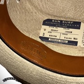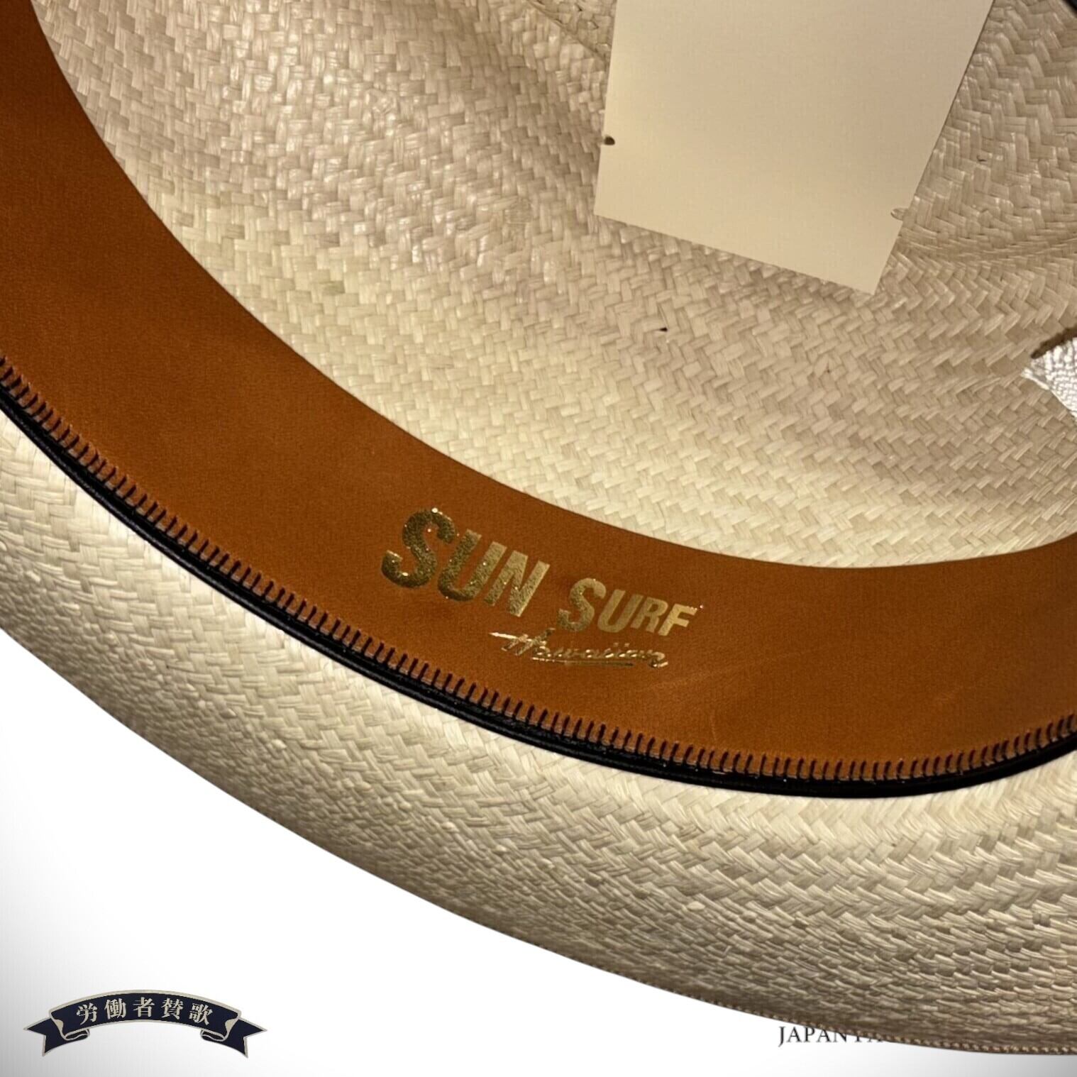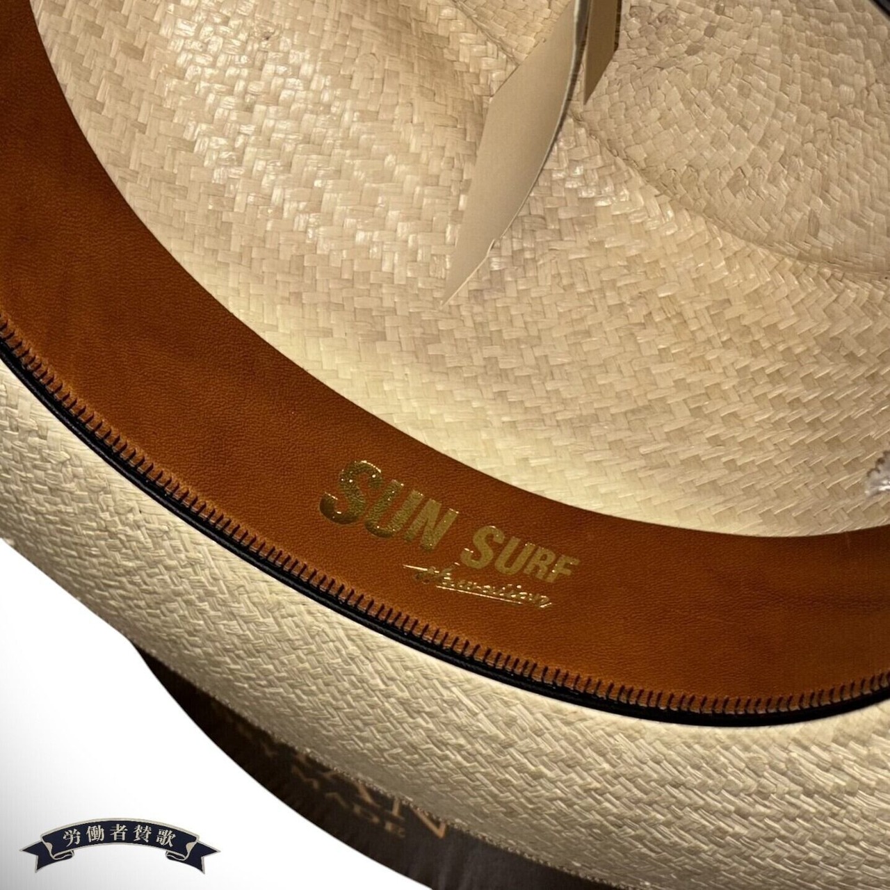 ファインラフィア(ラフィア椰子)を使い、石目編みで仕立てられたアイランドハット。スベリには牛革を使用し、当時の流れそのままに、ハットを手がけたMr.FATMANとオーダーをしたSUN SURFの箔押しがスベリに施されている。(Sサイズのみ、サイズ調整に特化した仕様のため、ナイロン素材のアジャスター付きのスベリを使用。) ブリムの広さは主張しすぎず、どのスタイリングにも合わせやすい80mm。クラウンの高さは110mmと最も使いやすく、クラウントップはティアドロップ型となっている。SUN SURFオリジナルのレーヨン生地を使い、丁寧に製作された50mm幅の段巻きリボンが付けられる。