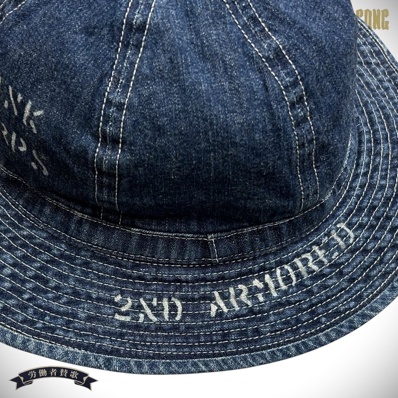 米陸軍が1934年に開発したデニム製のハットは、デニムのジャケットとトラウザースのセットアップで着用を前提として採用された。こちらは1940年に創設された“Hell on Wheels”(地獄の車輪)というニックネームを持つ第2機甲師団のステンシルを施し、経年変化を再現したモデル。陽除けとなる幅広のブリムは、生地をドーナツ状にくり抜いた用尺の掛かる贅沢な仕様。外周に走った無数のステッチは手間のかかる“一筆書き”で行われている。