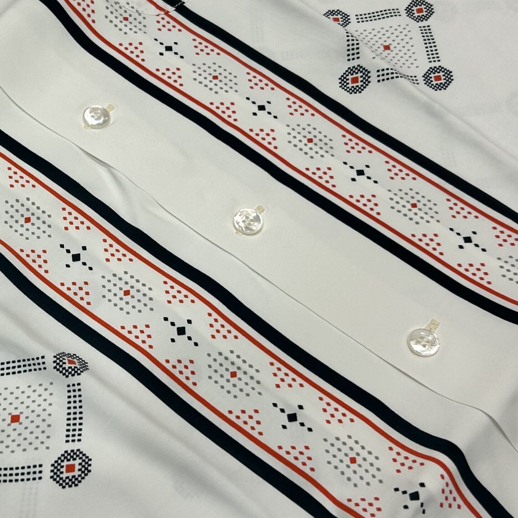 アメリカ本土での流行を意識し、洗練されたデザインを多く輩出したブランド、デューク・カハナモク。中でも西海岸の若者達をはじめとしたサーフカルチャーの世界にも受け入れられ、人気のアイテムとなっていった。1950年代後半に発表されたこのデザインも、アメリカ全土で流行となっていたアトミックパターンを取り入れた完成度の高い柄で、後のデューク・カハナモクを象徴するデザインとなっていく。