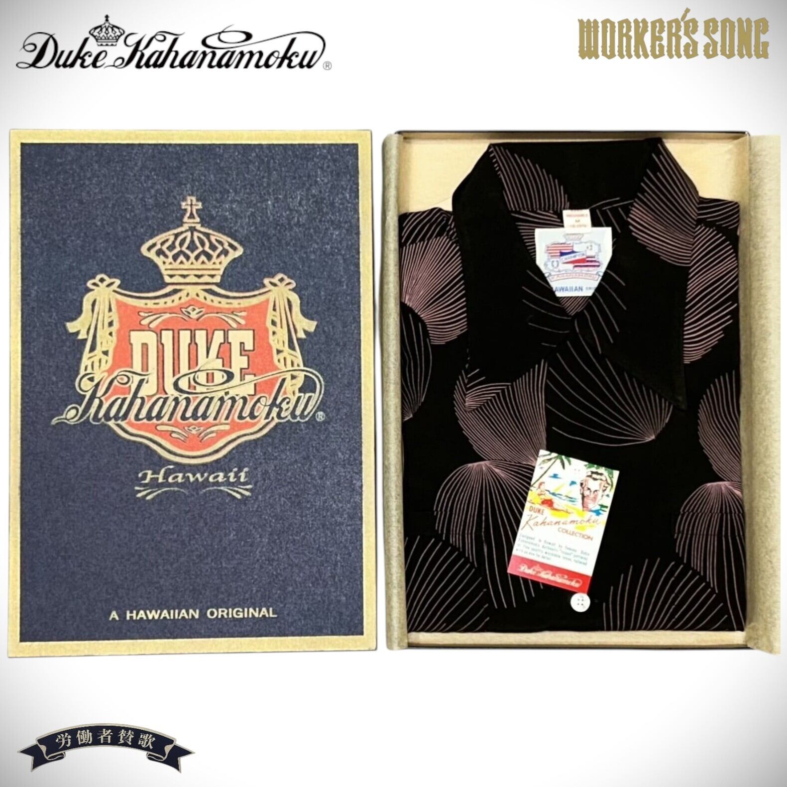 全米で巻き起こったリゾートブームも追い風となり、ハワイへ多くの観光客が訪れるようになると、ギフト需要も一気に高まった。中でもアロハシャツの人気は高く、多くのアパレルブランドが個性溢れるデザインで競い合うようになる。1949年にはデュークも自らのブランドをスタートさせ、様々なメディアにオリジナルのシャツを着て登場。この「デュークス・シェル」もデューク本人が愛用し、その姿が幾度となくフィルムに収められている。