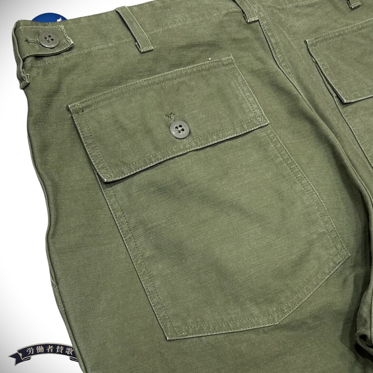 シンプルな外観を持つOG-107はシャツとトラウザーとのセットアップで戦闘にも作業にも対応したユーティリティーユニフォームとして1950年代中頃から採用された。トラウザーは前期型と後期型に大別され、前期型にはウエストに調節タブが設けてある。一般的にベイカー(パン職人)パンツなどと呼称されているが、厳格なミルスペックに基づいて製作された紛れもないミリタリーパンツなのである。