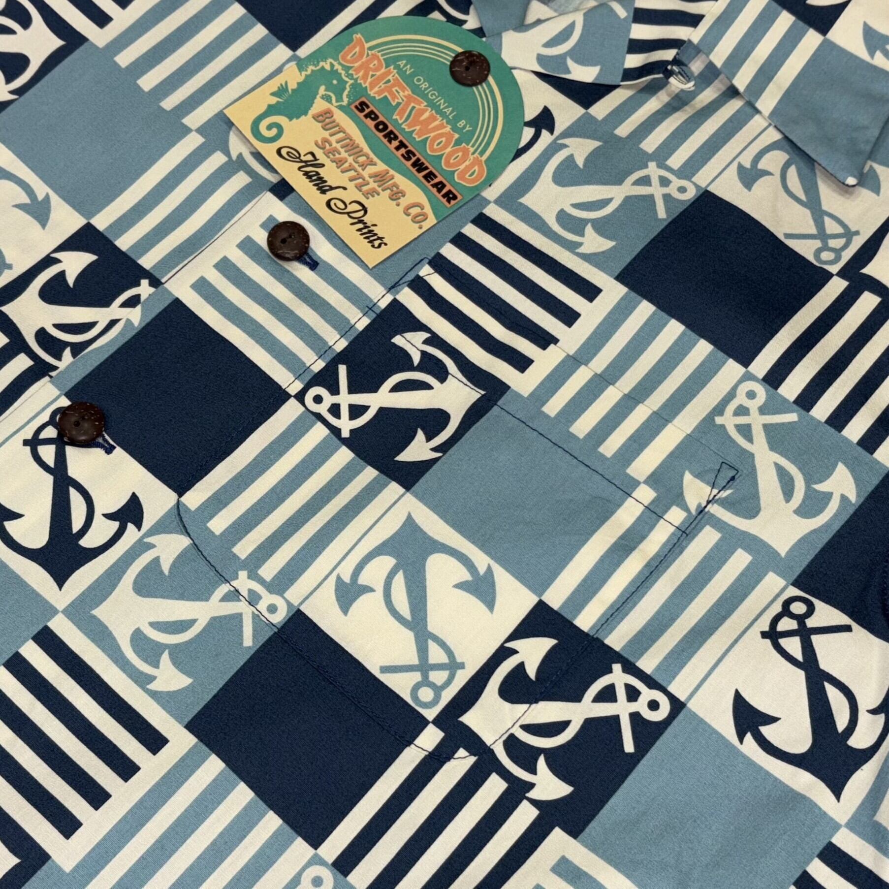 1900年代初頭に創業したボタニック・マニュファクチャリング社のブランド、ドリフトウッドが1950年代中期に手掛けた一枚。同社はシアトルに本拠地を置き、ワークウェアをはじめとする様々なアイテムを展開していた。当時、アメリカ本土でのポリネシアン・カルチャーの人気が高く、リゾートシャツとして海やビーチを連想させるモチーフで構成されたシャツが多く作られていた。