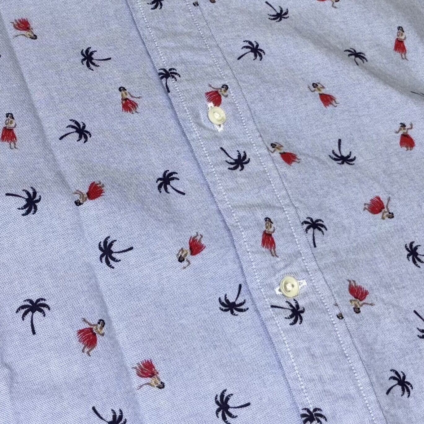 2本針巻き縫い仕様で裾のサイドにスリットの入った1960年代のボタンダウンシャツをベースに、楽園ハワイを象徴する「フラダンサー」と「パームツリー」をプリント。厚いシェル素材のトリプルホールボタンを使用するなど、ヴィンテージを意識したスタンダードな作りゆえ、流行に左右されず長年愛用できるシャツに仕上がっている。