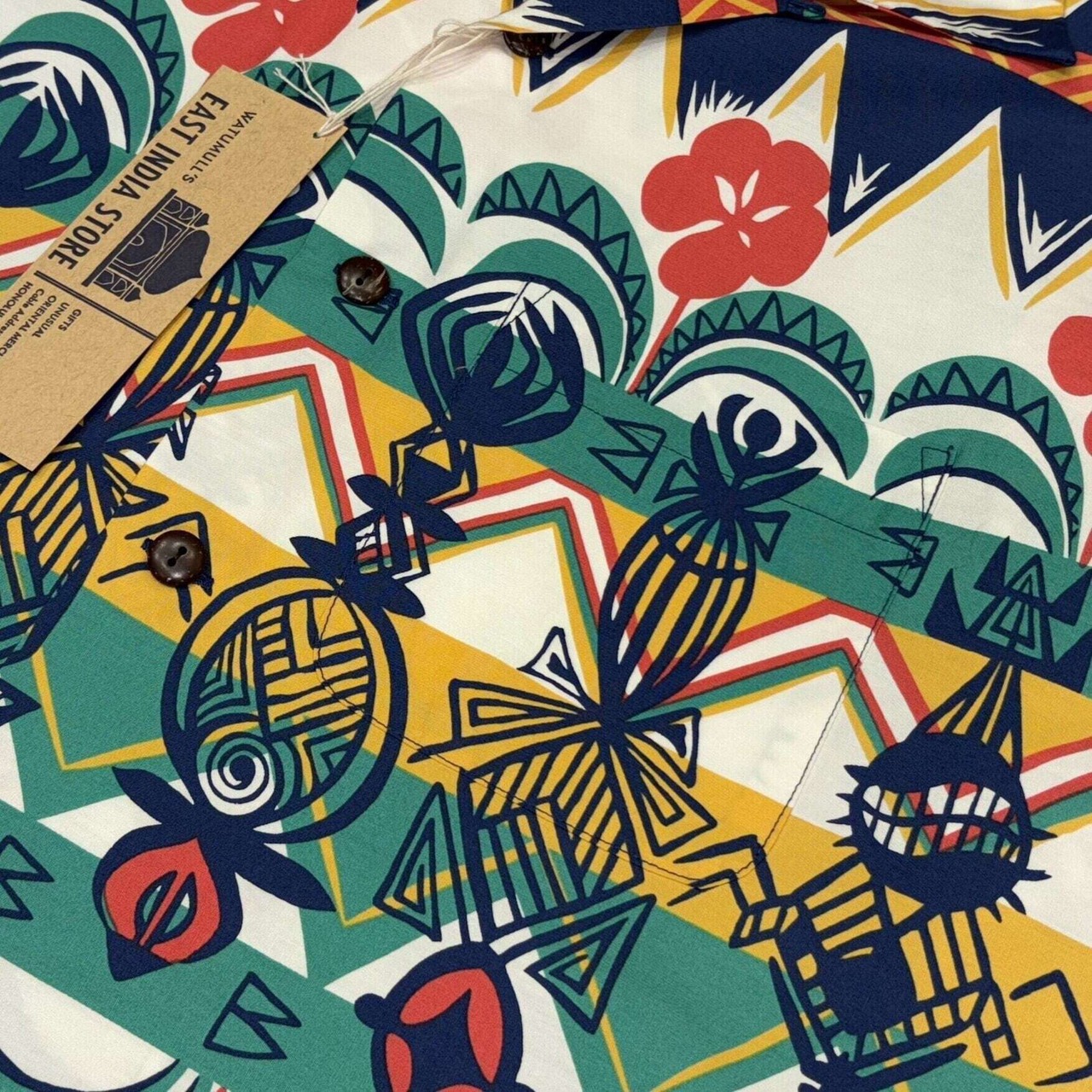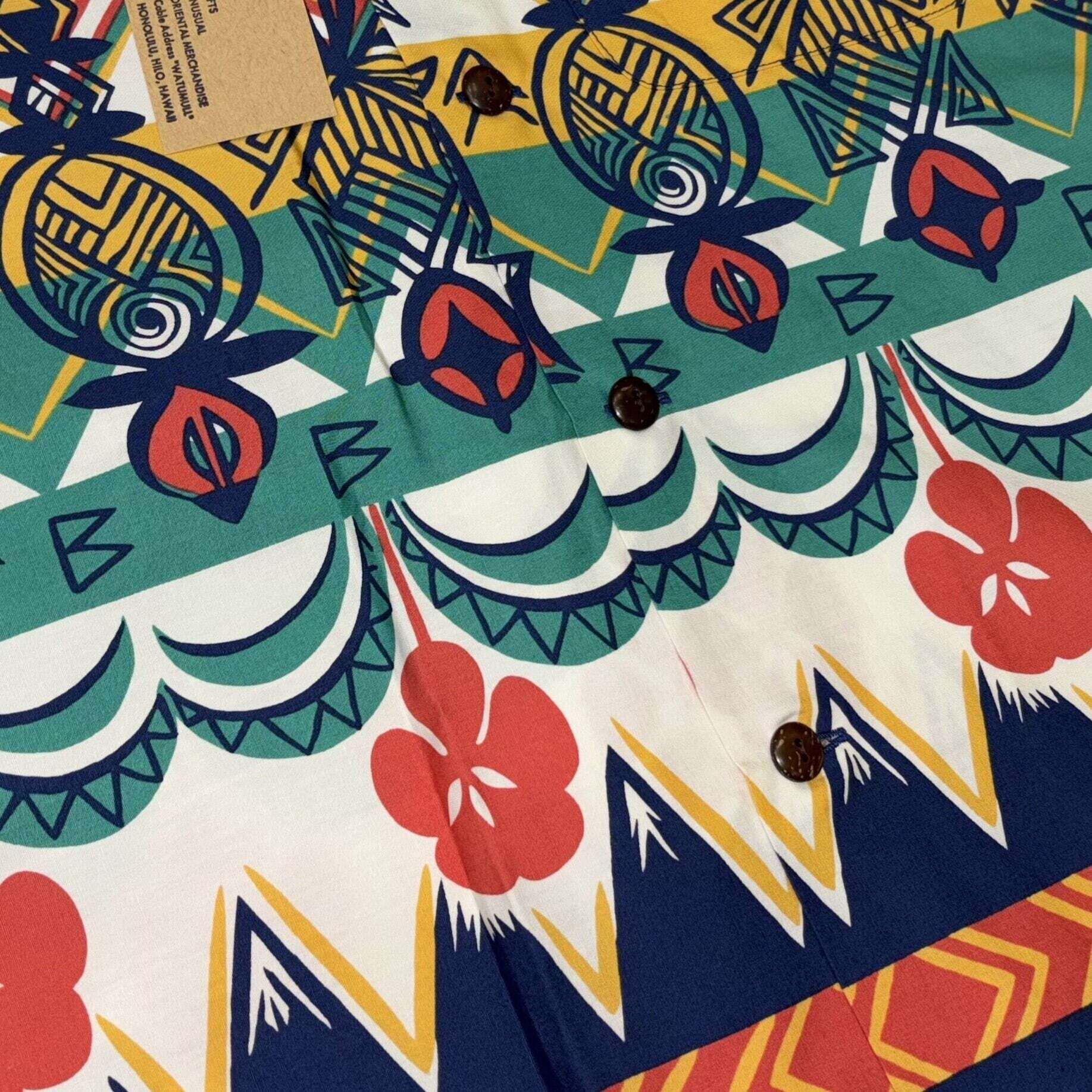 1950年代後期に製作されたコットン素材のシャツを現代に蘇らせた一枚。オリジナルを手掛けたのは、ハワイアンシャツの全盛期を築き上げたブランド、ワットムルス。異色かつ大きな成功も収めたとして有名な、インド系移民のG・J・ワットムルが1913年に創業したイースト・インディア・ストアが展開していたブランド。ティキやヤシの木などをデフォルメして描いたモチーフがボーダー状に配された珍しい一枚。