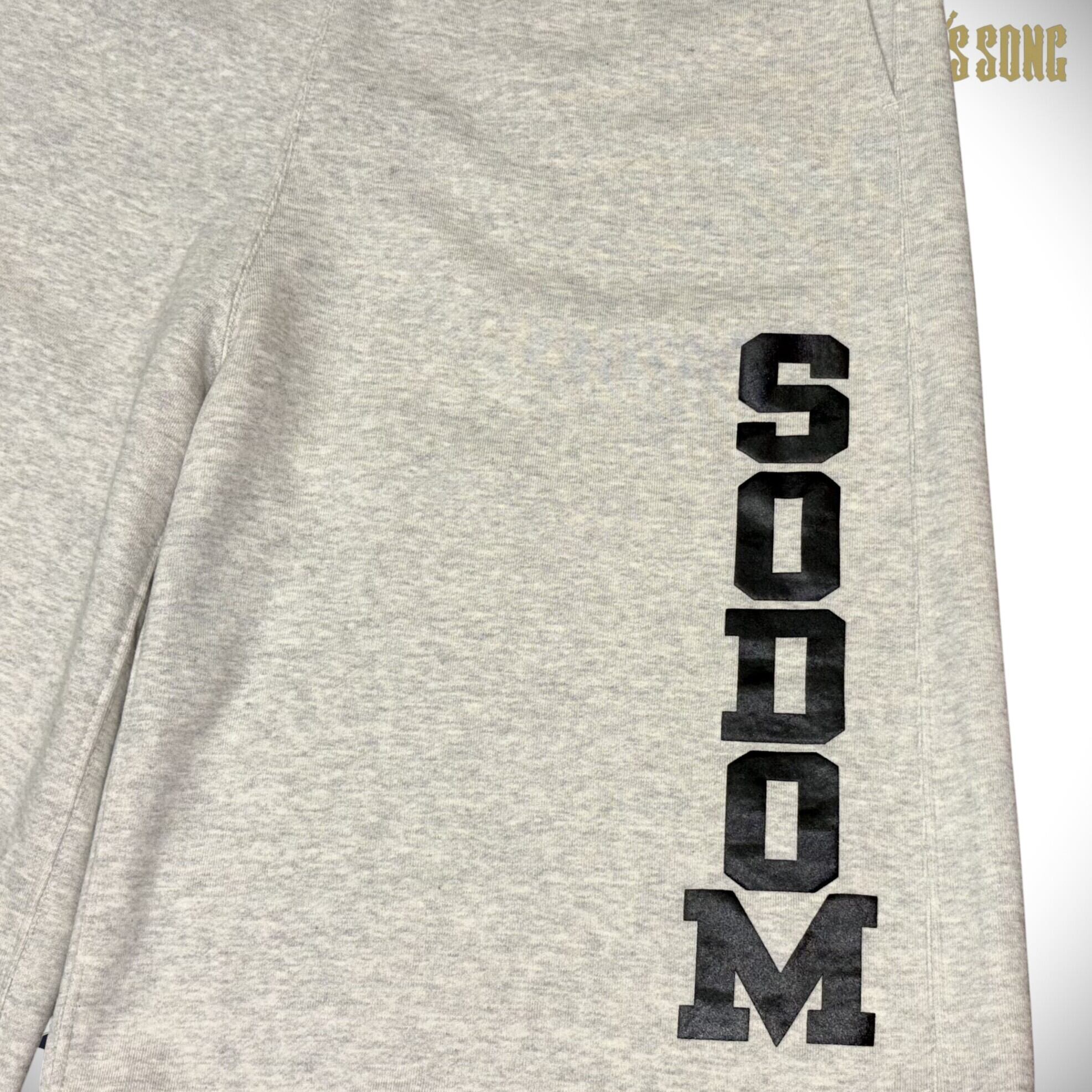 ヴィンテージのカレッジプリントスウェットパンツから着想を得たスウェットバギーショーツ。広い裾幅と長い丈感により独特なシルエットに仕上がっている。左裾には古代都市「SODOM」を厚塗りの(二回刷り)ラバープリントで表現。