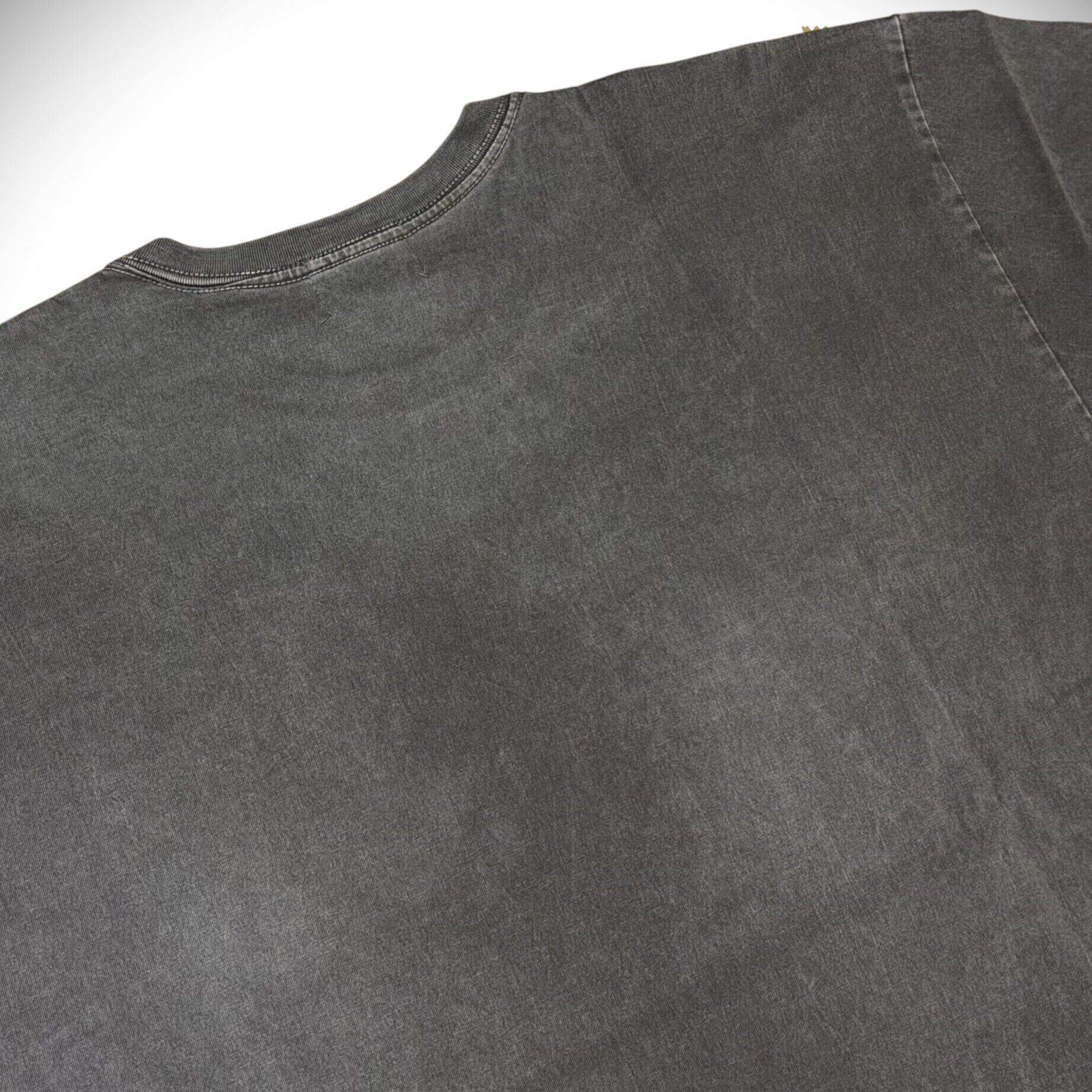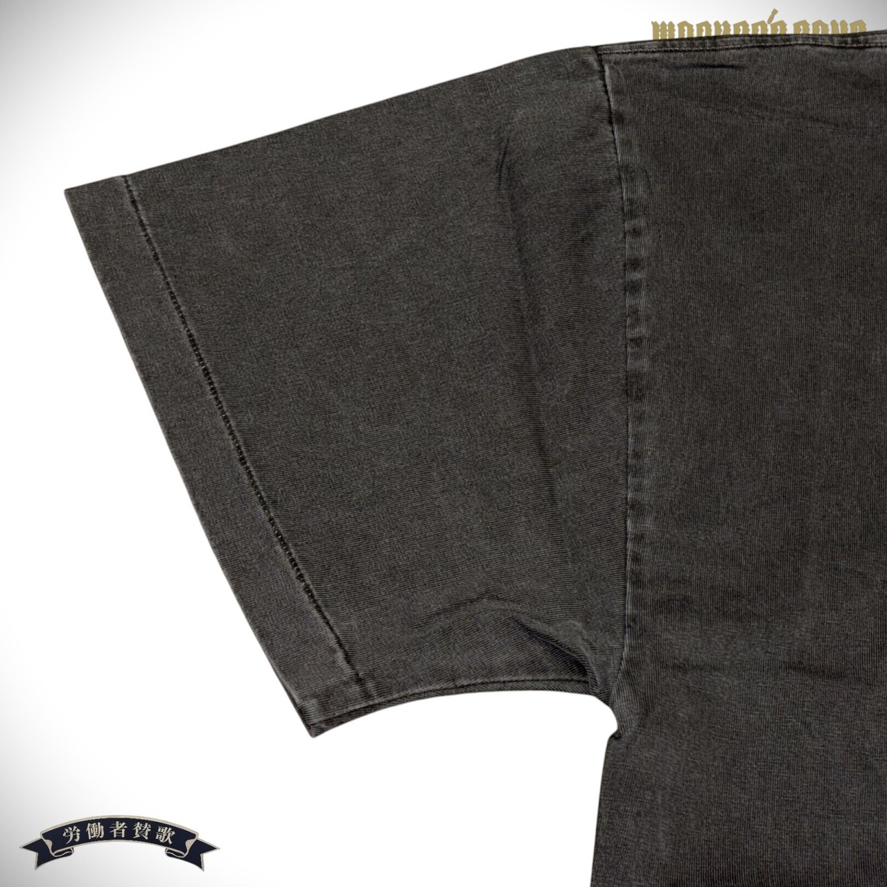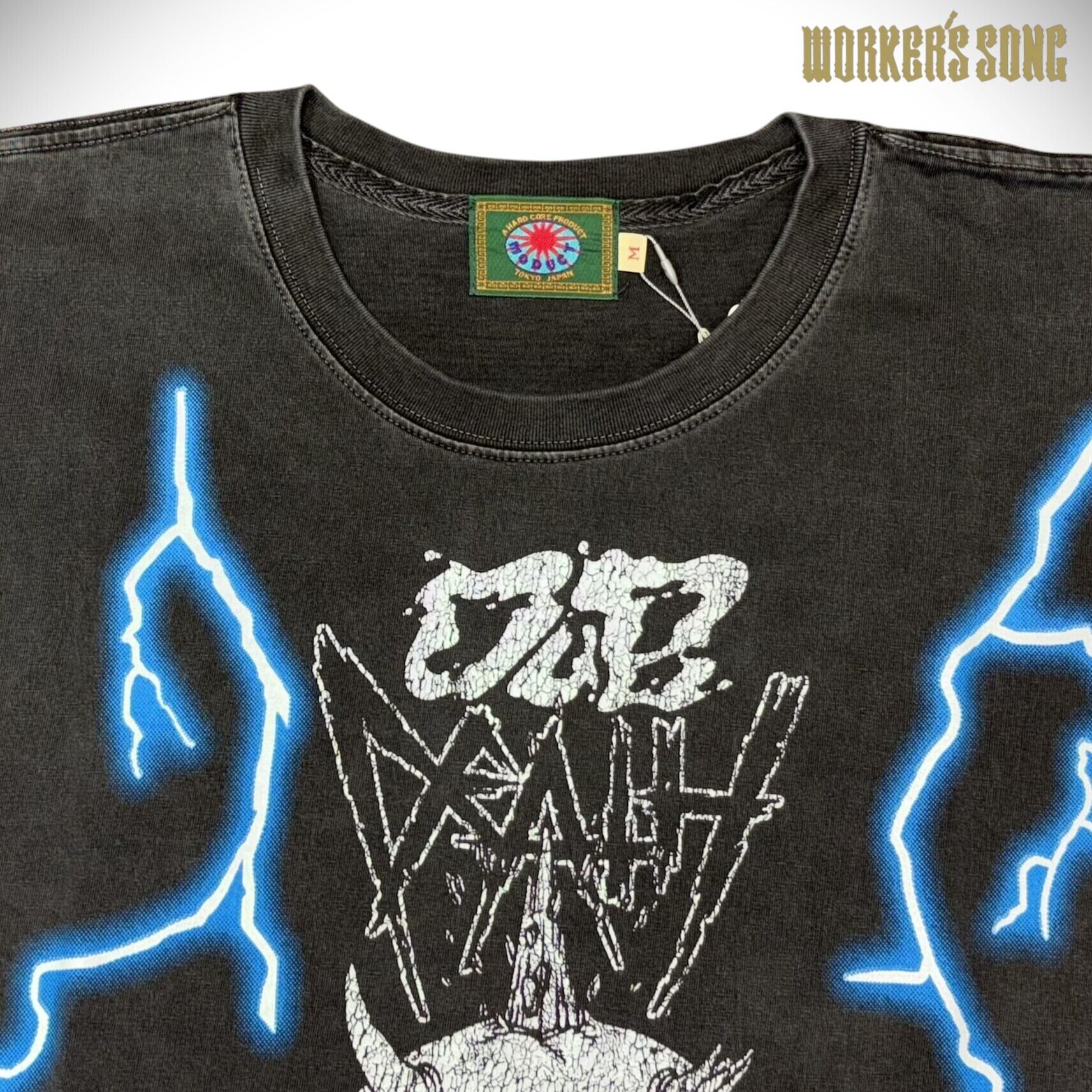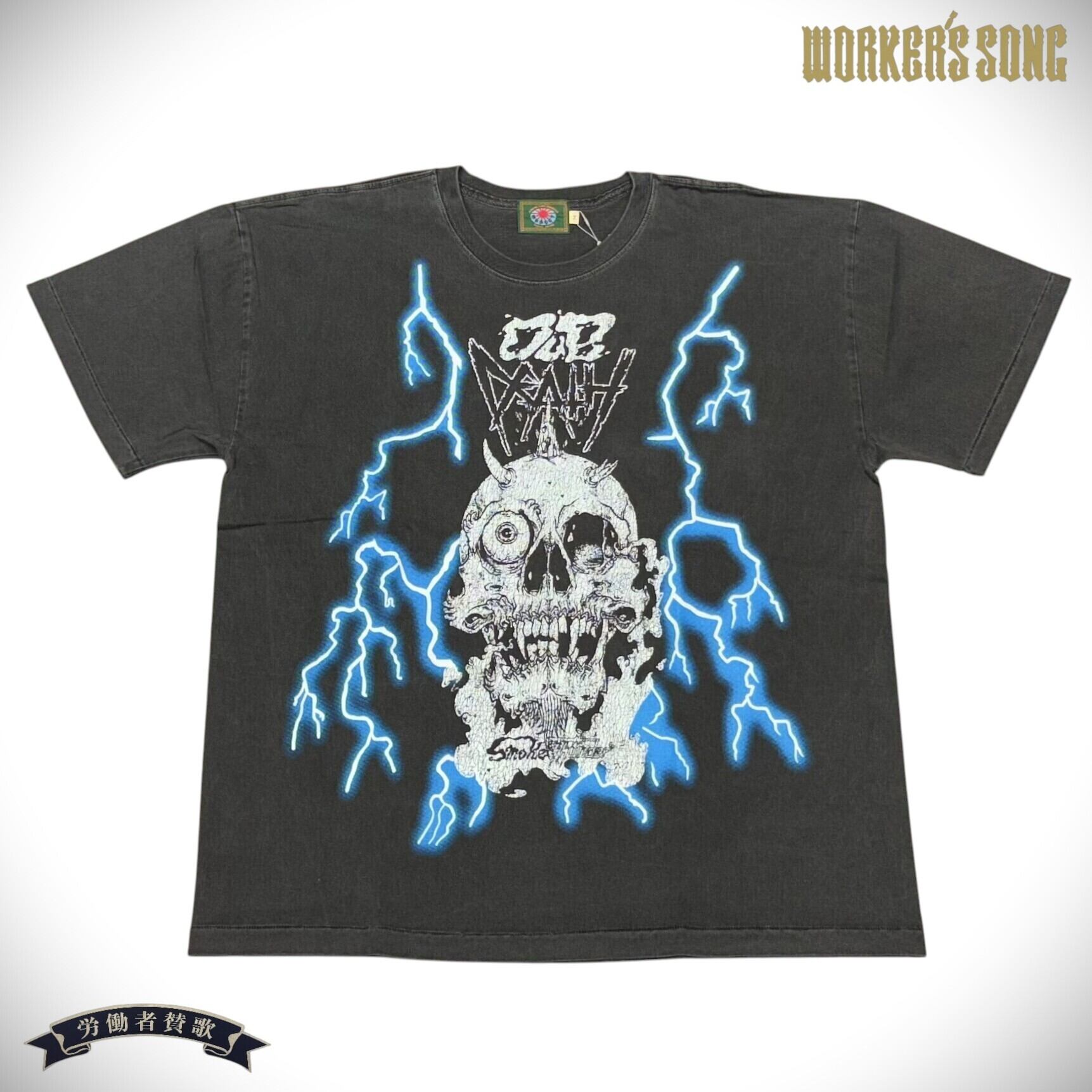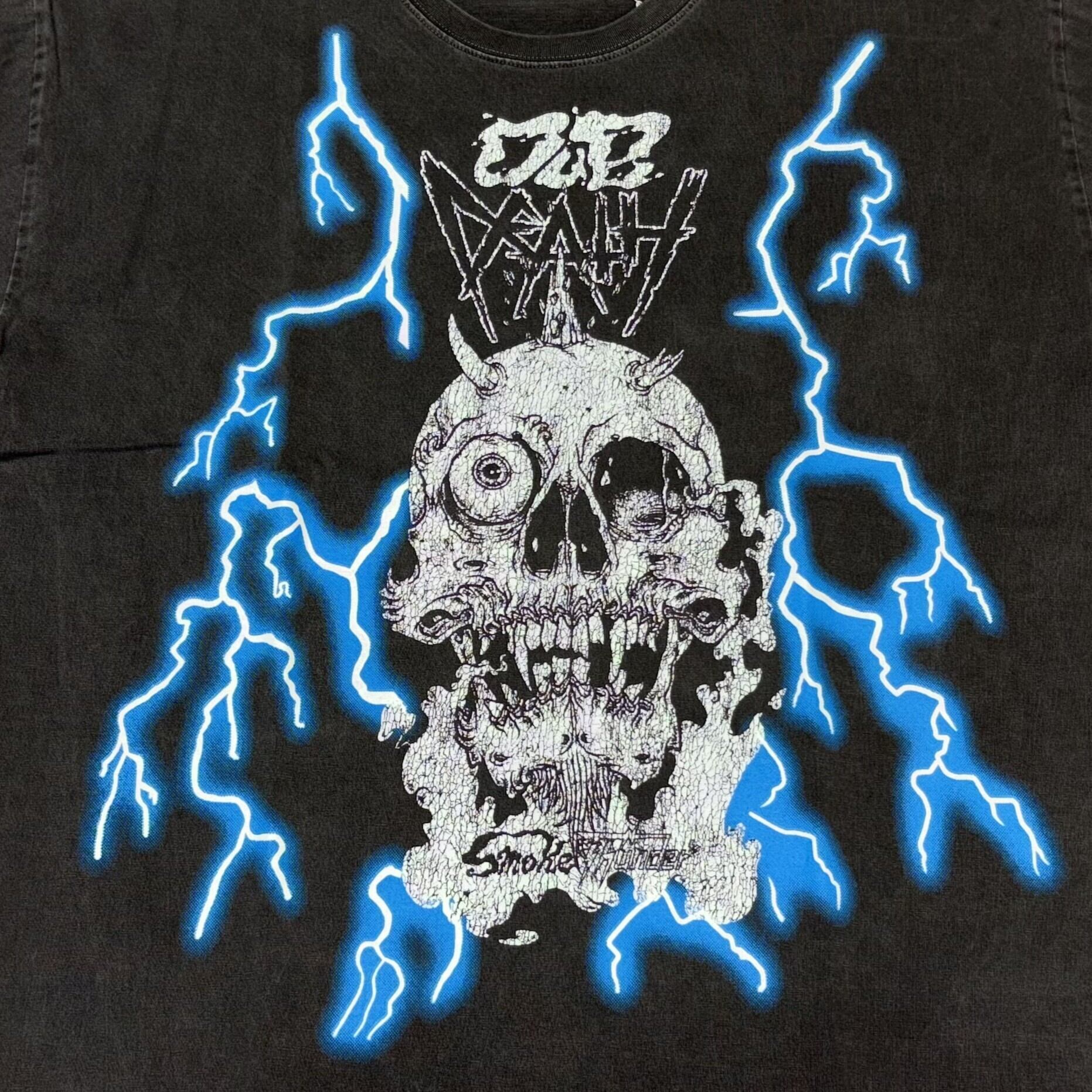 架空のメタルダブバンド「DUBDEATH」のオフィシャルTシャツ。1980~90年代の古着のTシャツに見られる雷柄(アメリカンサンダー)をマイクロメッシュプリント、スカル部分はクラックプリントで古着のような風合いを表現している。30番単糸で編み上げたオリジナルボディで袖口、裾ともにシングルステッチ縫製。ピグメント加工を施しているため、経年変化にも期待できる一枚。