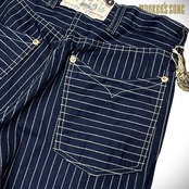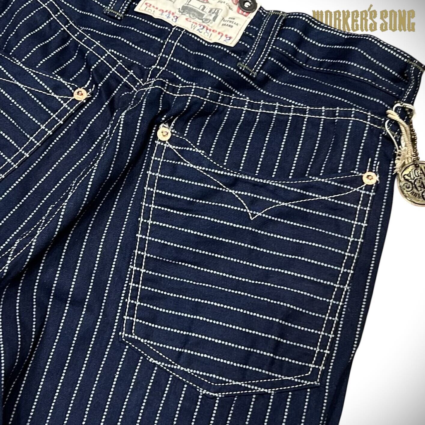 9オンスのウォバッシュストライプ生地を使ったショートパンツ。カーブしたポケットの形状やポケット口のステッチワークなど、20世紀初頭のワークパンツに見られる手間のかかった豪華なディテールが特徴。フロントはボタンフライではなくジッパー。ベースとしたヴィンテージにジップフロントのタイプは実在しないが、同年代のヴィンテージジャケットなどに使われていた HOOKLESS ファスナーを採用し、時代考証の整合性を確保している。ポケット口の端はリベットで補強。サスペンダーボタンを使用しない場合は取り外せるよう、打ち込みではなく縫い付けている。ヒップポケットは1930年代以前にみられるヨコ使いの裁断。右脇のツールポケットは当時、キャンドル入れとして使われていた。