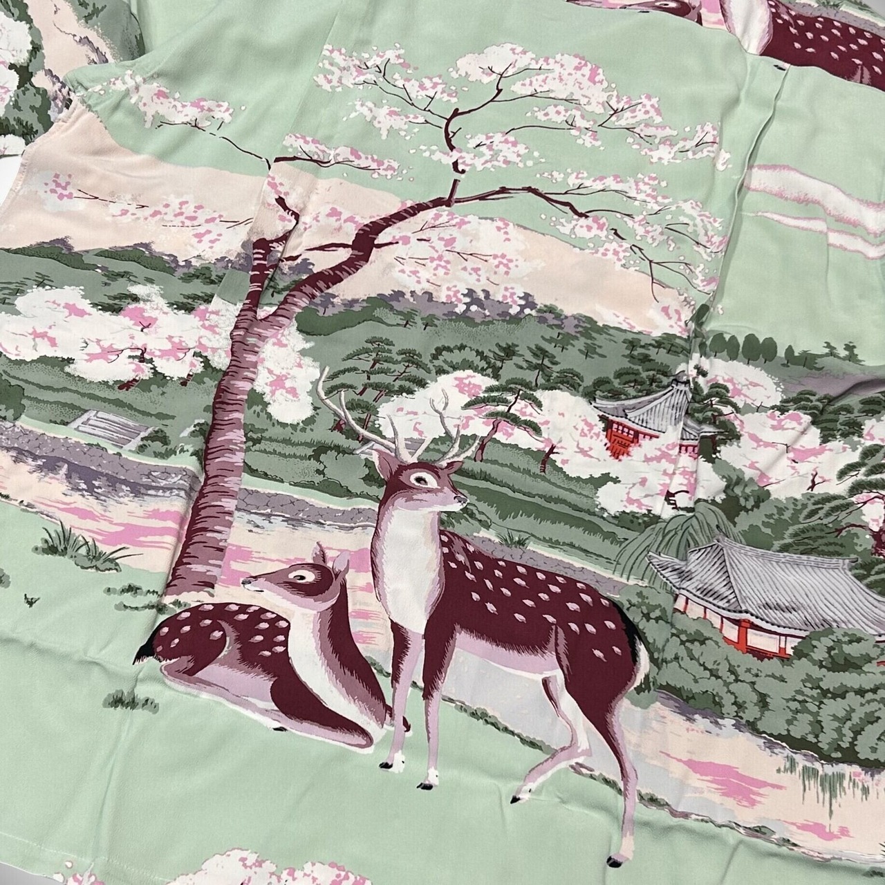 この作品は、満開の桜の下に佇む鹿、興福寺の五重の塔、猿沢池から眺める奈良の風景が生地幅いっぱいに描かれている。縫製に関してもオリジナル同様、細いミシンステッチで折り伏せ縫いをし、当時のテーラーメイドの味わい深い魅力を再現。