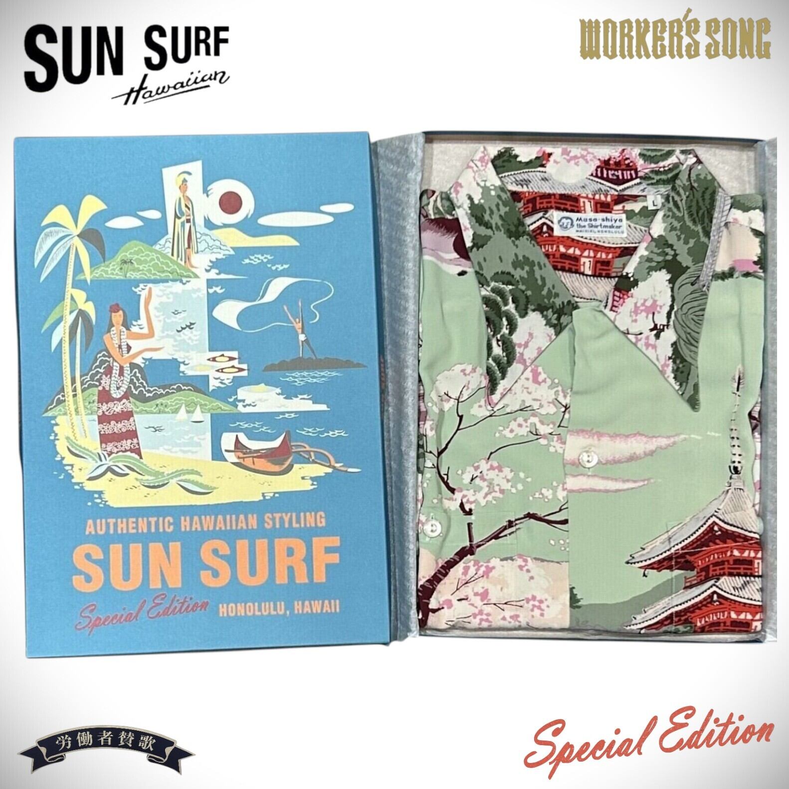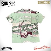 その発祥には日系移民が深く関わっており、トロピカルな柄だけでなく和柄もヴィンテージとして存在する。ハワイが観光地として確立した20世紀半ばには、土産物としてのアロハシャツの需要が一気に増加。デザインやパターンが多様化し、多くの作品が生まれた。ヴィンテージのアロハシャツを収集する過程で、ごく稀に出会える特別な逸品。時代の流れとともに失われつつあるそれらの名作を生み出したテキスタイルデザイナーに敬意を表し、多色の贅沢なプリントや迫力のデザイン、メーカーや年代によって異なる各部のディテールまでその魅力を余すところなく完全再現する。それがサンサーフ・スペシャルエディション。