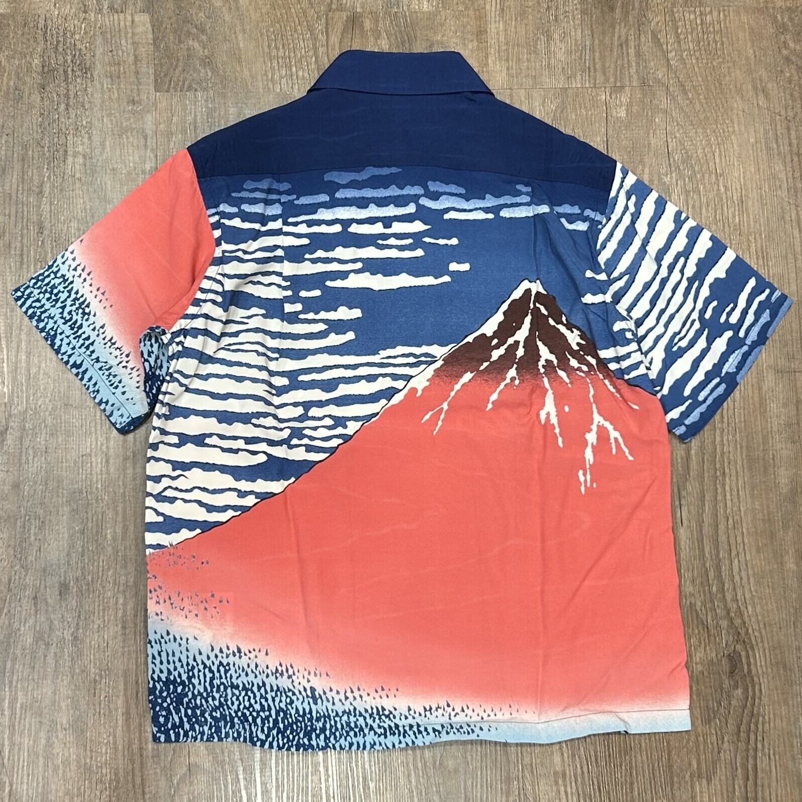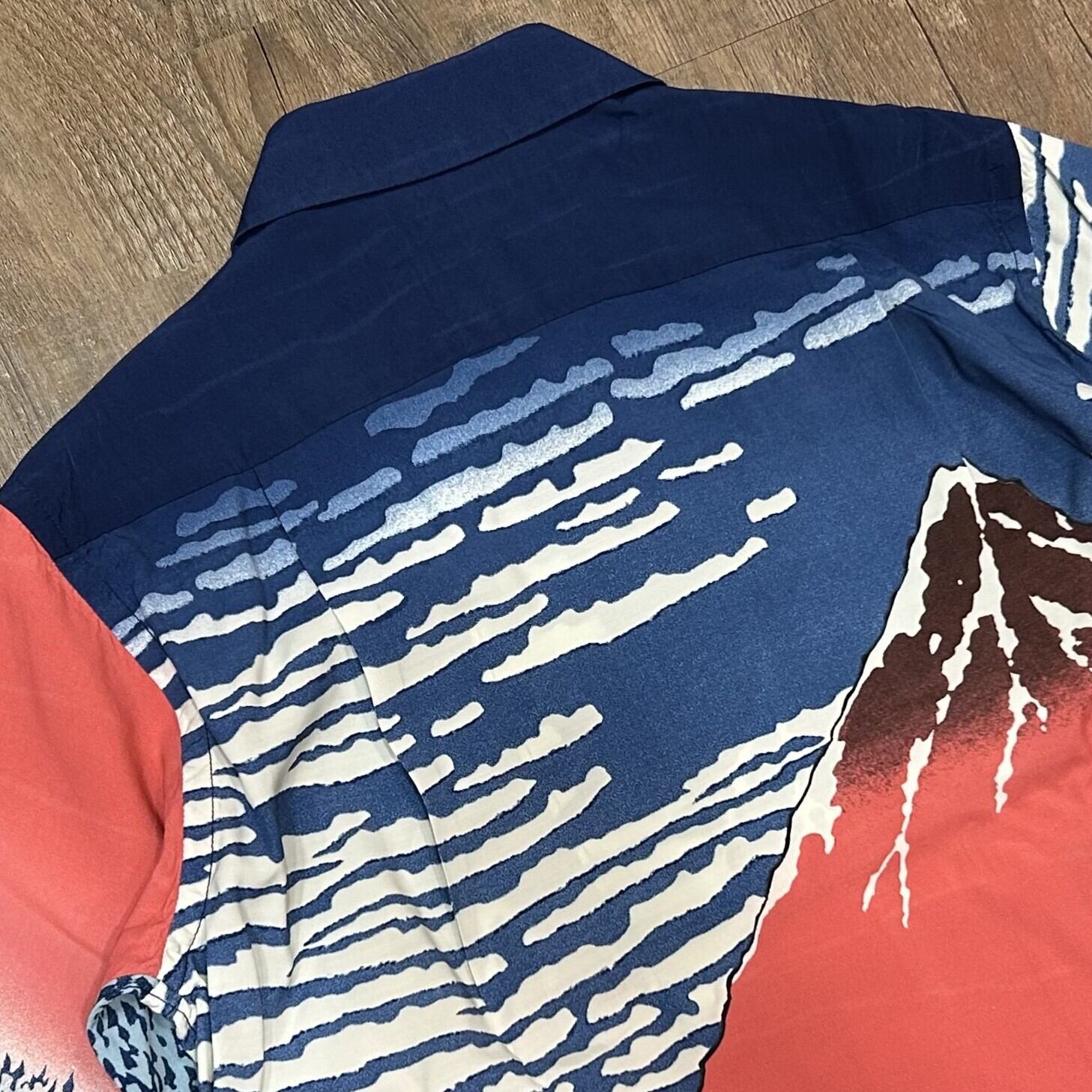 この作品を手掛けた頃から、北斎は舶来の顔料であるベロ藍を使い始めていた。その発色に魅了された北斎は、ベロ藍の深い青と植物から採れる藍を複合的に使って独自の色味に仕上げ、冨嶽三十六景を完成。このアロハシャツのプリントには藍顔料を使用し、版木(錦絵の摺りに使われていた木の版)の「木目」まで生地に表現することで、北斎作品の魅力を余すところなく再現している。