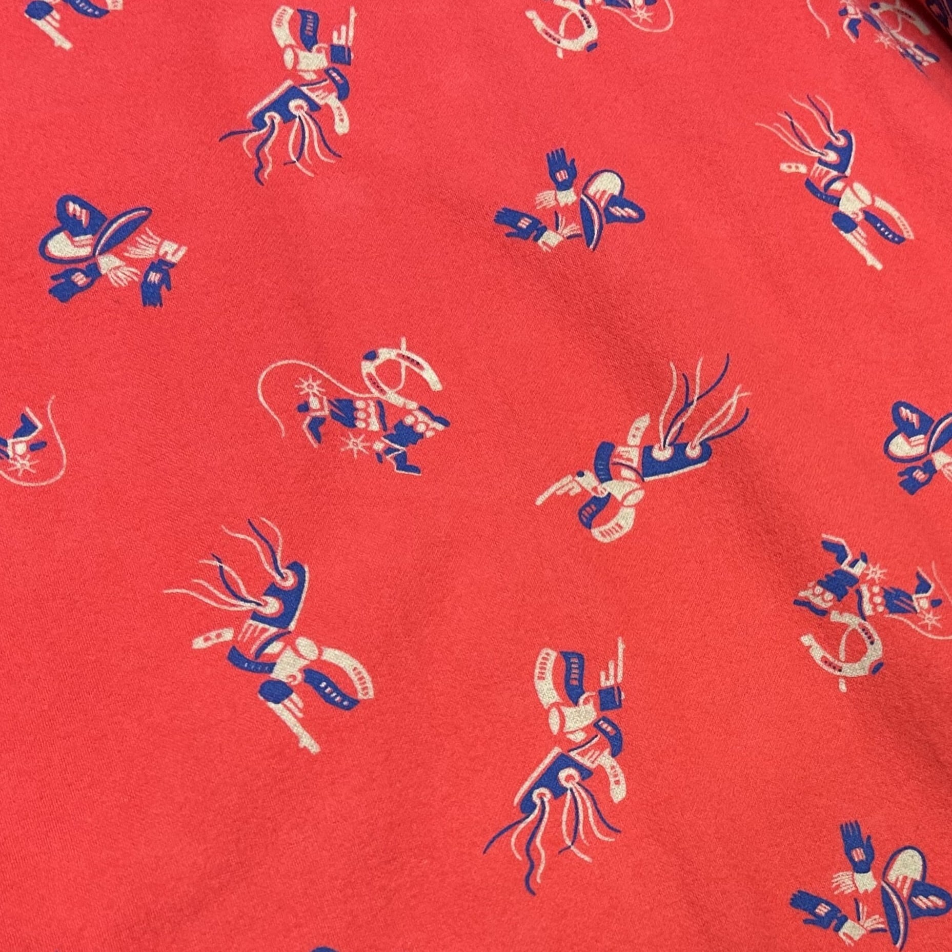 1950年代のウェスタンジャケットをベースとし、シャトル織機で織り上げたサテン生地で仕立てたモデル。ライニングに張られている生地はヴィンテージシャツから再現したコットンのプリントネル。ウエスタンモチーフの総柄を抜染(ばっせん)で色鮮やかにプリントしている