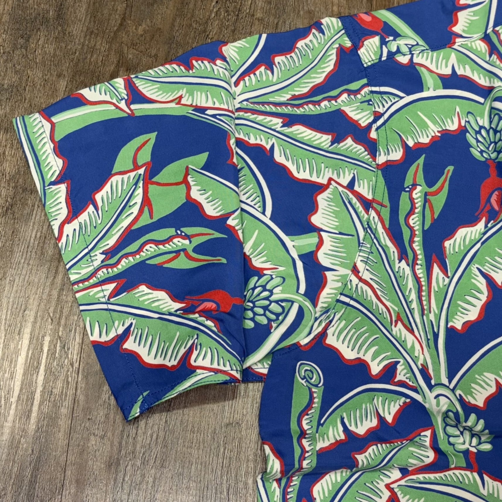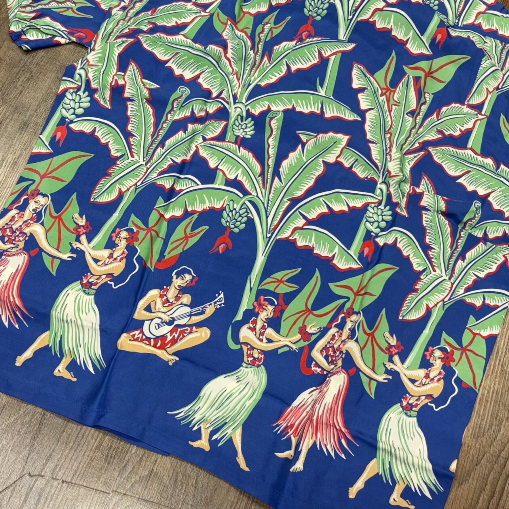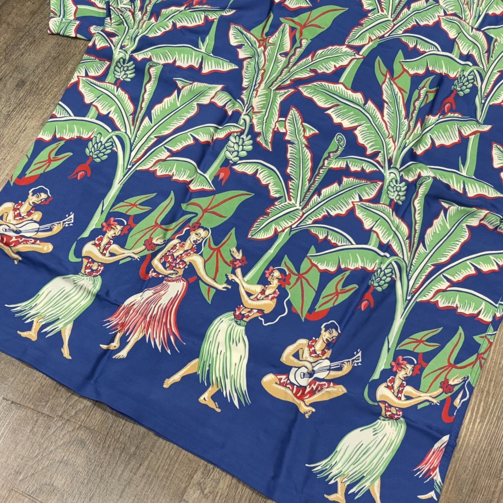 シャツ全体に青々と生い茂るバナナツリー。その下で踊るフラガールたちは裾部分に連なり、見事なホリゾンタルパターンを形成している。オリジナルを手がけたのは1940年代後半に創業し、サンフランシスコを拠点にしていたアパレルメーカー、アートヴォーグ・オブ・カリフォルニア。同社のレーベルのひとつであった、アロハ・カナカ(親愛なるハワイの人々という意味)の織りネームが使われている。