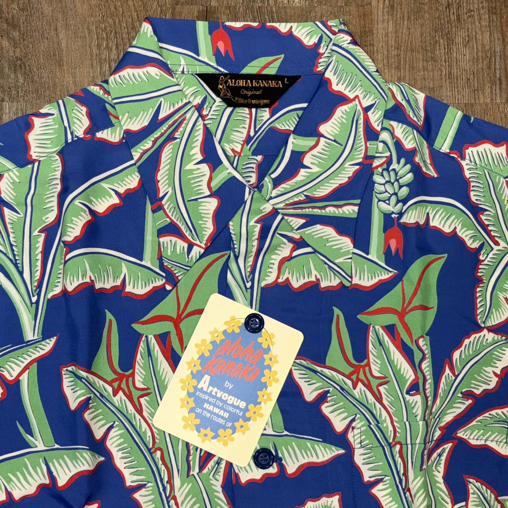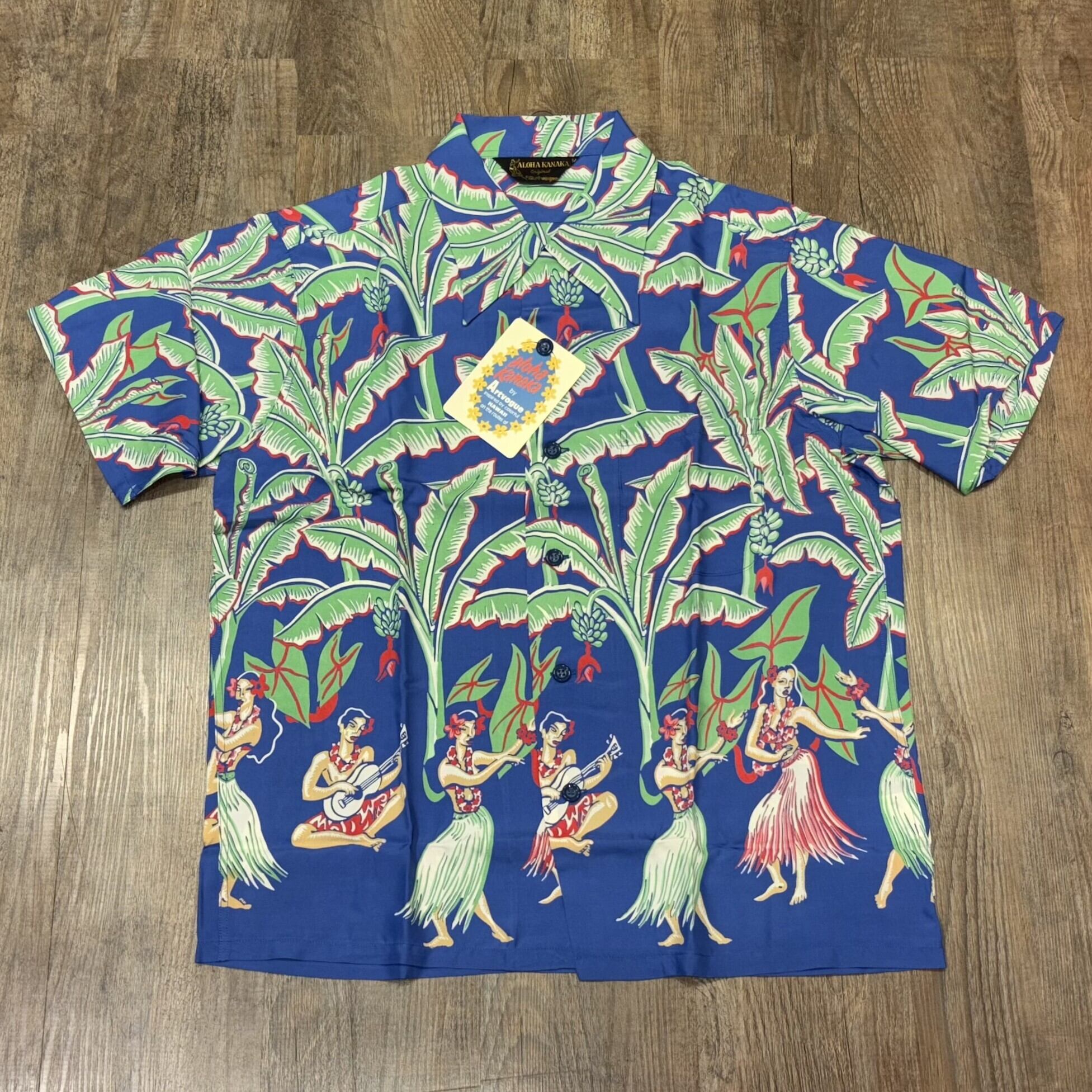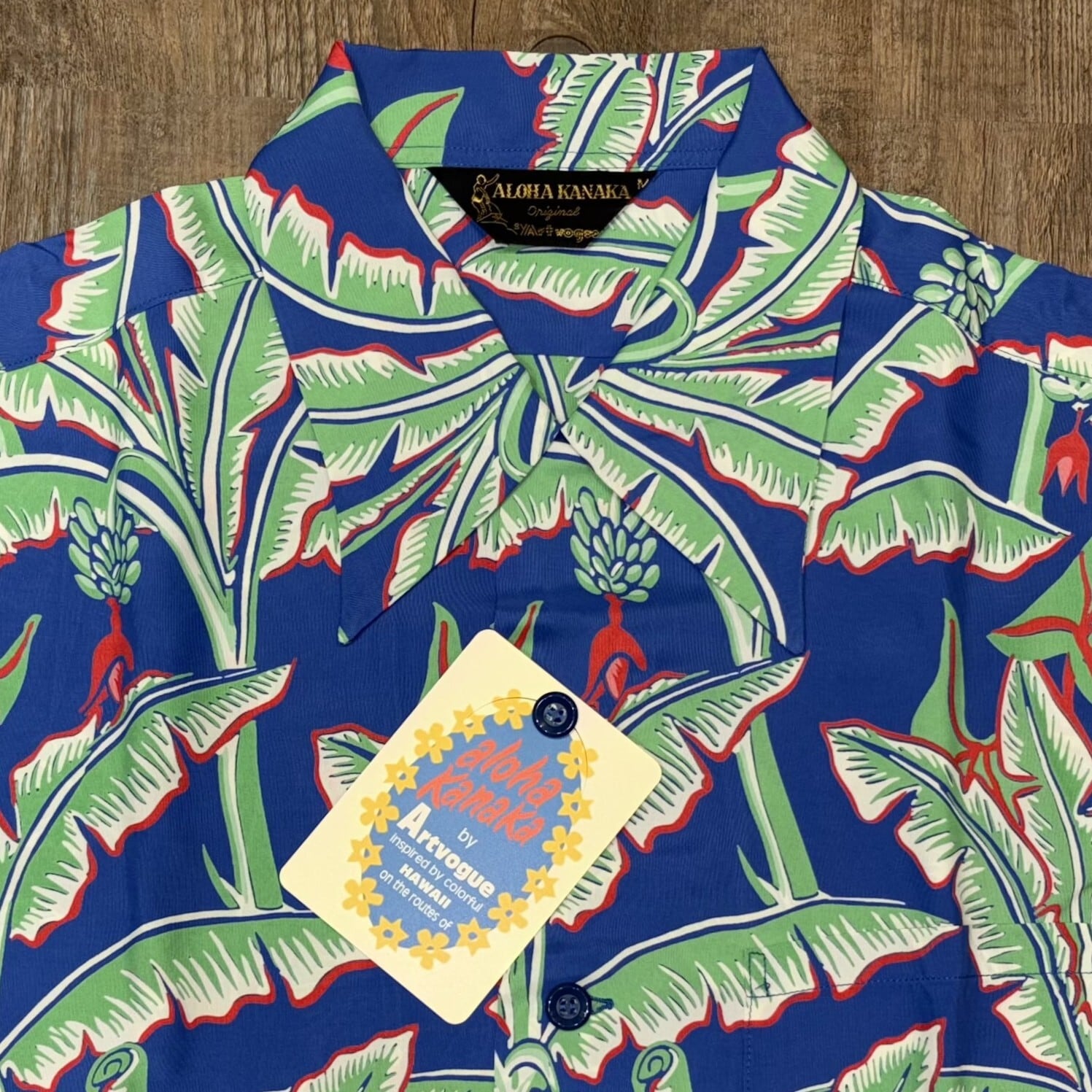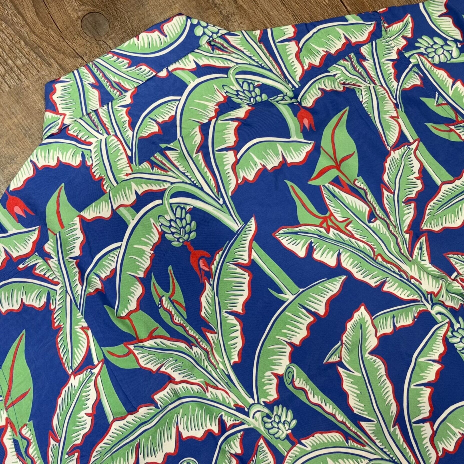 シャツ全体に青々と生い茂るバナナツリー。その下で踊るフラガールたちは裾部分に連なり、見事なホリゾンタルパターンを形成している。オリジナルを手がけたのは1940年代後半に創業し、サンフランシスコを拠点にしていたアパレルメーカー、アートヴォーグ・オブ・カリフォルニア。同社のレーベルのひとつであった、アロハ・カナカ(親愛なるハワイの人々という意味)の織りネームが使われている。