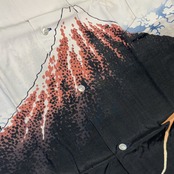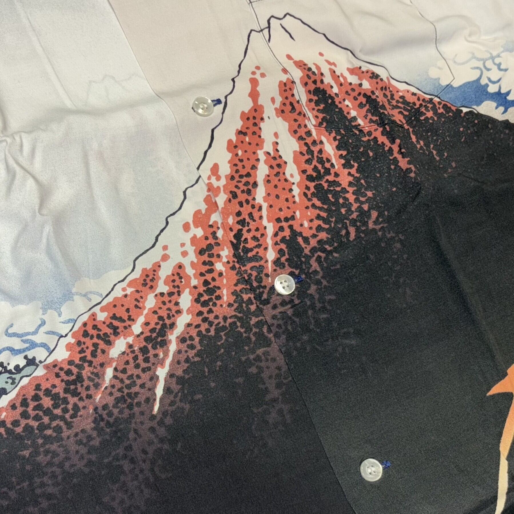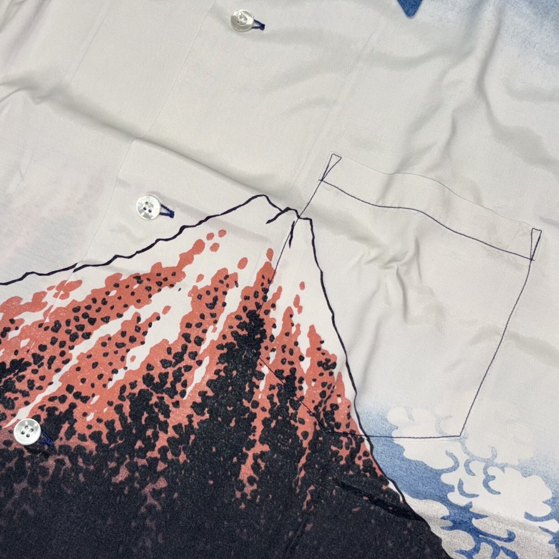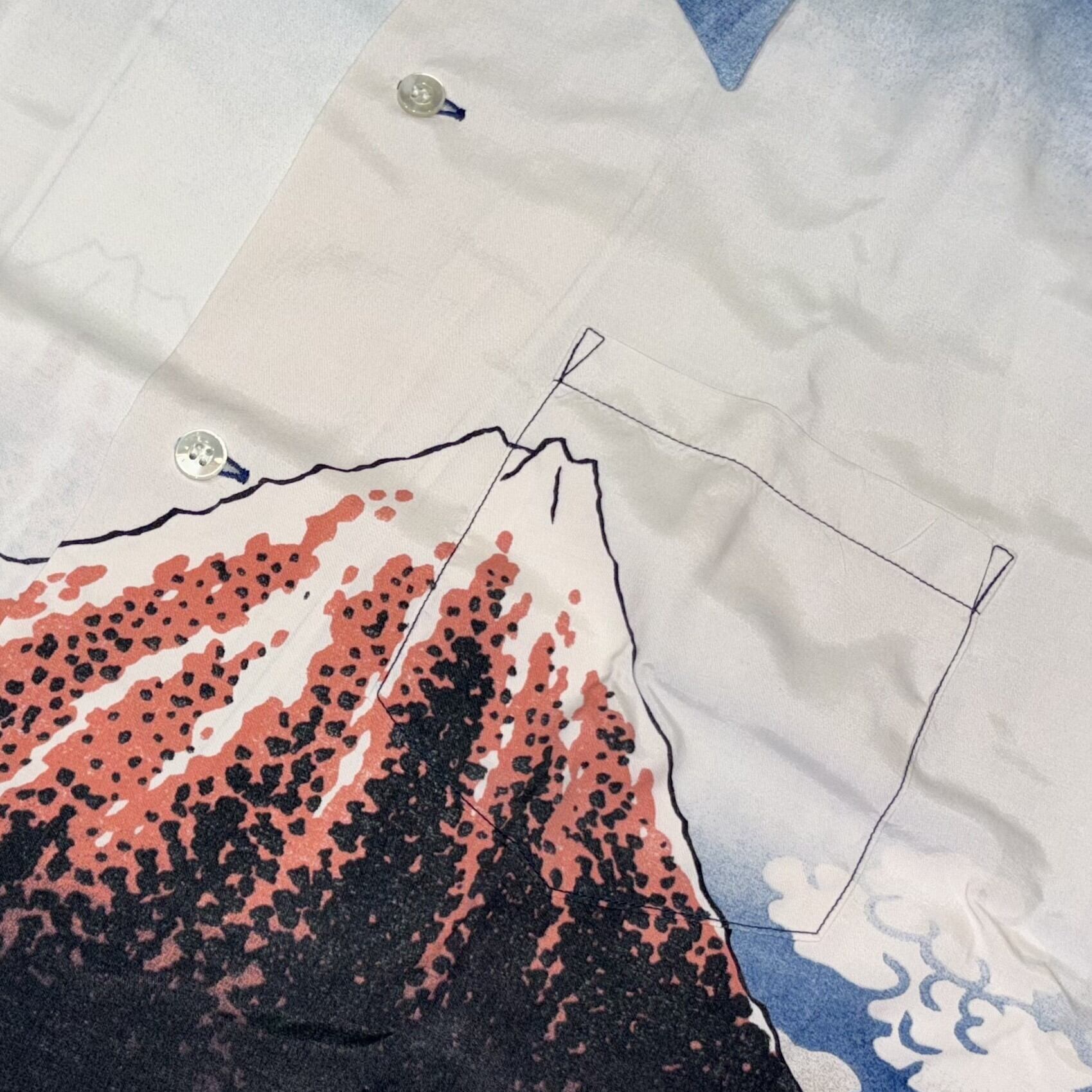 こののアロハシャツのプリントも、青い部分には当時の色に近い本藍顔料、黒い部分には墨を使い、北斎の色に対するこだわりを継承している。