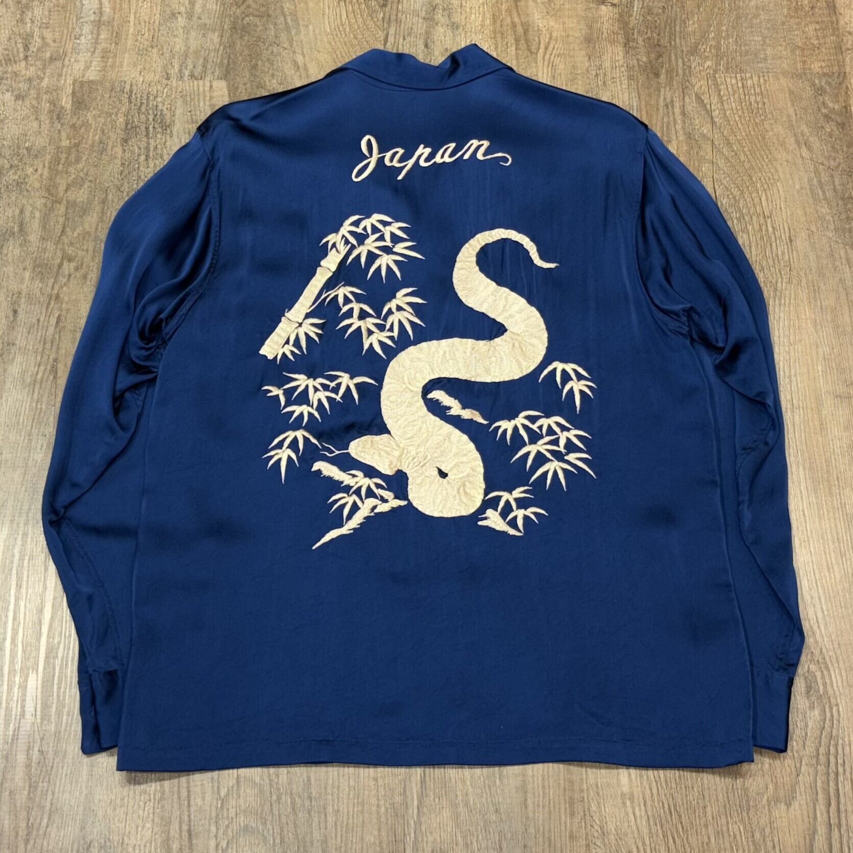 ヴィンテージではシャツに横振り刺繍を施した通称「スカシャツ」も存在する。多くは軍のユニフォームをベースとしたシャツジャケット型で、このような開襟シャツのスタイルは珍しく、評価も高い。今回、スペシャルエディションとして再現したのは1950年代中頃の作品で、胸に富士、背中には竹藪に潜むマムシを描いた衝撃的な一着。スペシャルエディションのスカジャン同様にアセテートサテンを使用し、襟元にはループ、袖には剣ボロが付く凝った仕上がり
