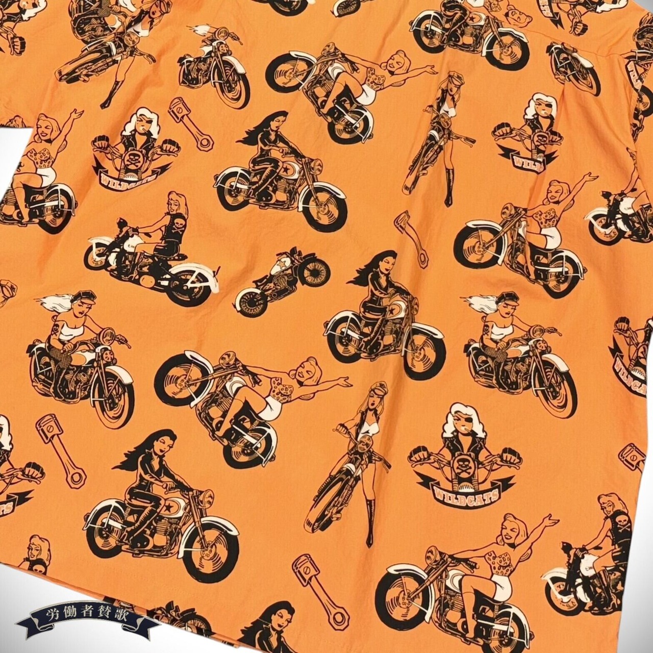 "STAR OF HOLLYWOOD"のためにヴィンス・レイが描き下ろしてくれたデザイン。ヴィンテージバイクに跨り男勝りで乗りこなすワイルドなセクシーガールの絵柄。マットな質感のブロードコットン生地を鮮やかに染め上げ、ブラックを基調としたモチーフを抜染プリントで染め抜くことで、ひと際眼を惹く仕上がりに。ヴィンス・レイの独創的な世界観が見事に反映されている。