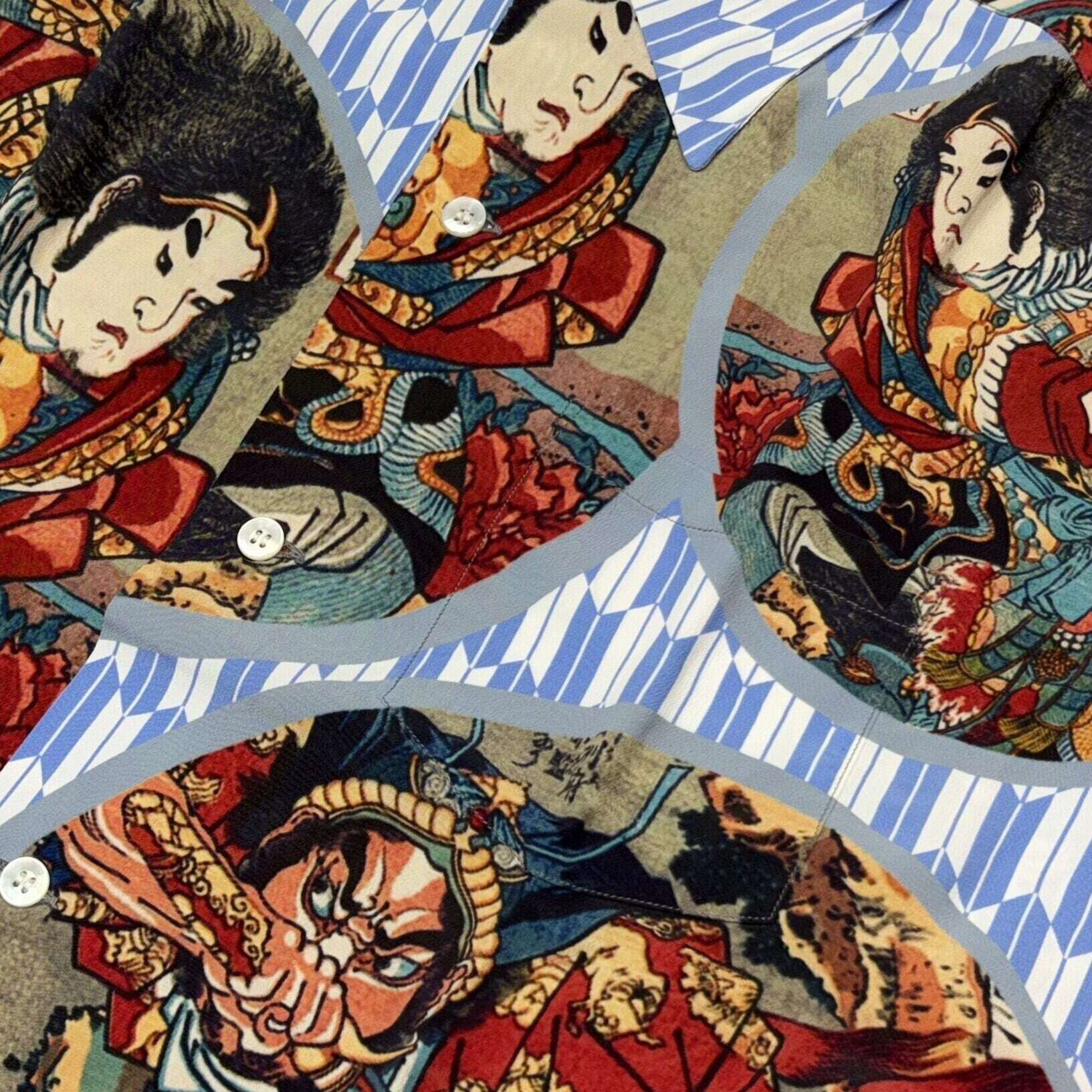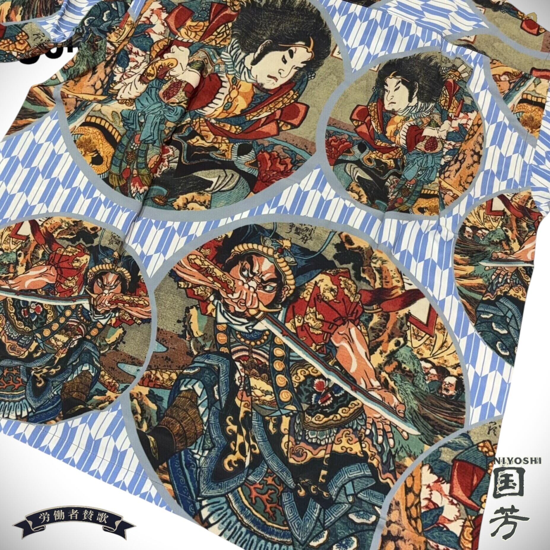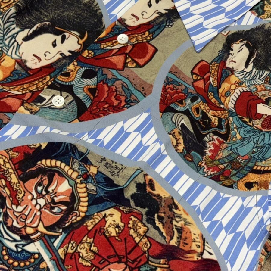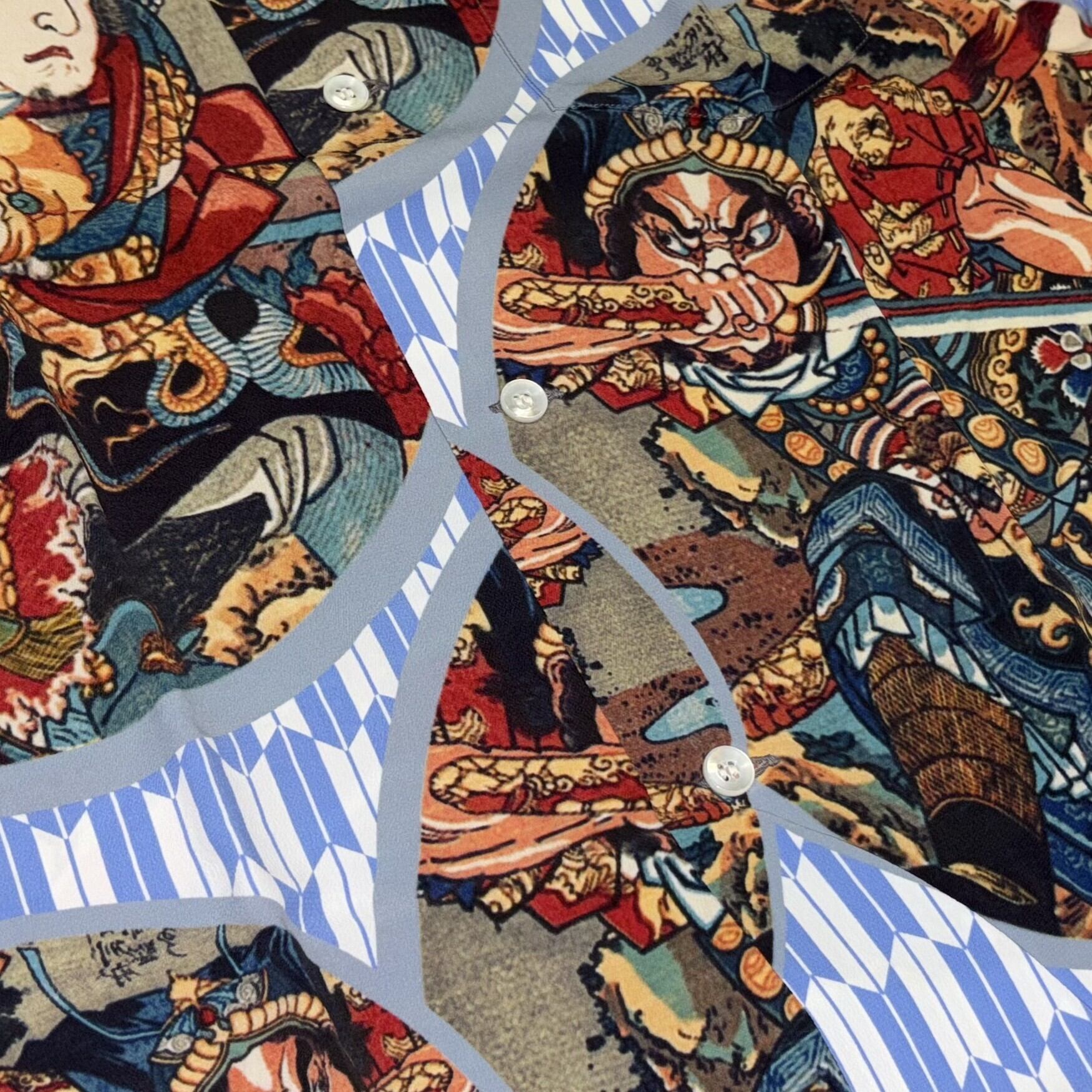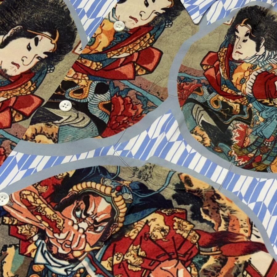 サンサーフはヴィンテージアロハシャツにみられるデザインパターンを参考に、矢絣(やがすり)の文様をシャツの地にデザインし、国芳の作品を円形に切り抜いてレイアウトすることで図案の持つ迫力をより強く引き出している。