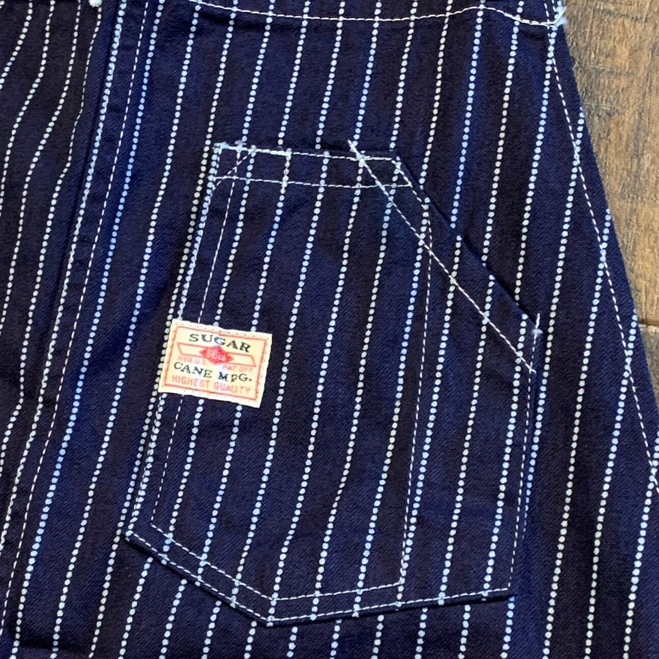 シュガーケーンのトレードマークである機関車がプリントされたメインラベルは布製。生地の裏面にはランダムにブーツマークロゴがプリントされている。今回のモデルは背面もしっかりとホールドするハイバックタイプのもの。剥げるとニッケル色が覗く黒塗りのタックボタン。鮮やかなイエローのキャッチ―な紙ラベル。懐中時計ポケット口に付けられた織りラベル。シンプルなツールポケット。金鉱ではキャンドルポケットとして使用されていた。