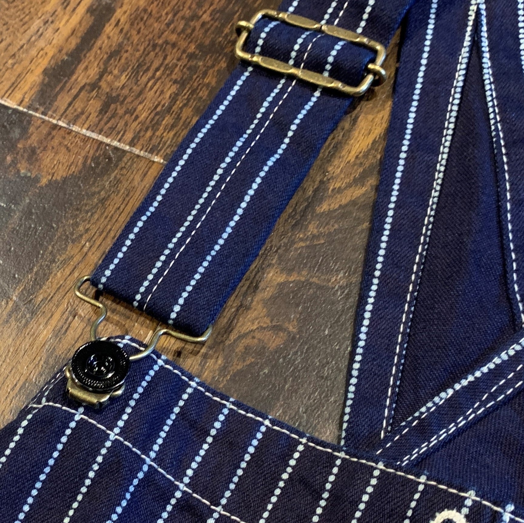 ウォバッシュストライプ生地を使用したハイバック仕様のビブオーバーオール。ビブ(胸当て)は1ポケットの一見シンプルな作りだが、ウォッチポケットとペンシルポケットを兼ねた複雑なステッチワークが目を引く戦前の仕様。この時代は右腰のツールポケットもまだバックポケットと離れている。
