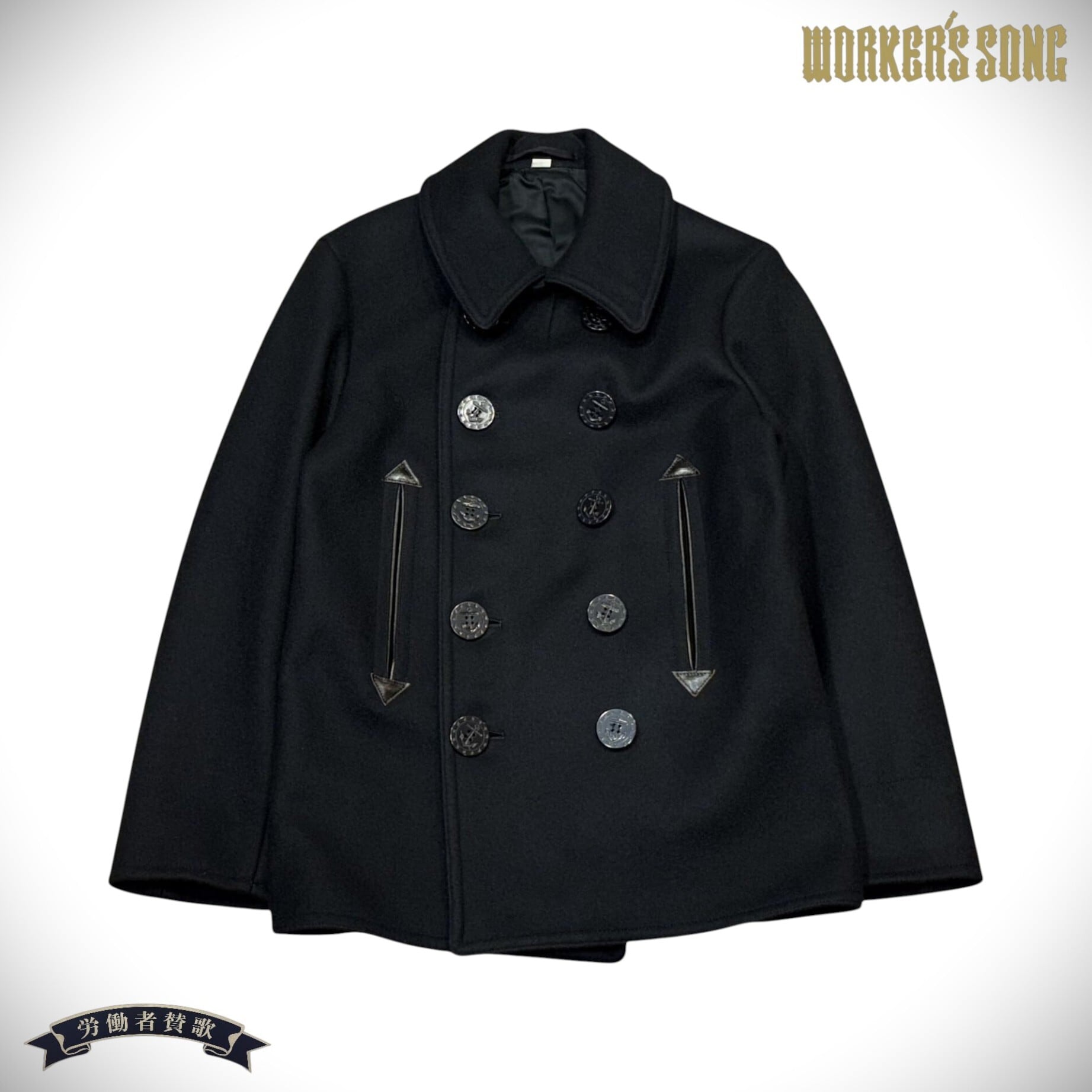 俗に“ピー・コート”と呼ばれるコートの原型は、18世紀には存在していたとも言われている。名称は、オランダ語の“Piijekker(ピーイエッケル)”を英語にした物で“Pii”が粗い毛織り物、“jekker”がジャケットから由来している。ヨーロッパ諸国でもピー・コート型のコートが幾つかの軍で採用されてきたが、今回のこのピー・コートは、アメリカ海軍が下士官用コートとして採用した1910年代のものである。1910年代のピー・コートの特徴は、高密度の分厚いメルトンウール素材を用いていることと、アメリカの国章を表す13個の星が彫刻されたアンカーボタンが付くことである。この13個の星は、1777年にアメリカが合衆国として独立した時の州の数が13であったことに由来している。アメリカ海軍がピー・コートを採用した正確な時期は不明だが、第一次大戦当時の服装規定には既に下士官用コートとしてオーバーコートが掲載されていた。襟が大型なのは海上で作業する際、襟を立てて顔を覆い、強風対策を十分に確保出来るよう設計されている。また、ポケットはスリット式のものが垂直に付けられているが、これは凍えた手を暖めるためのハンド・ウォーマーポケットである。1930年代以降になると生産性やコスト面が見直され、生地の軽量化が進み、13スターボタンも廃止される。このピーコートは官給品よりも着丈を若干短くして運動性を持たせ、強度面を意識してポケットの玉縁にはレザーを使用している。