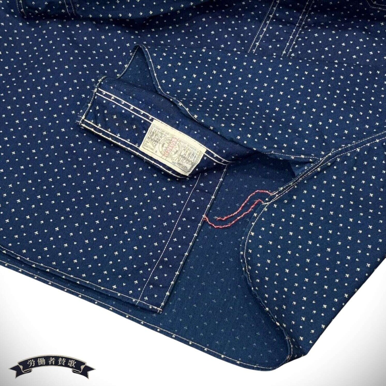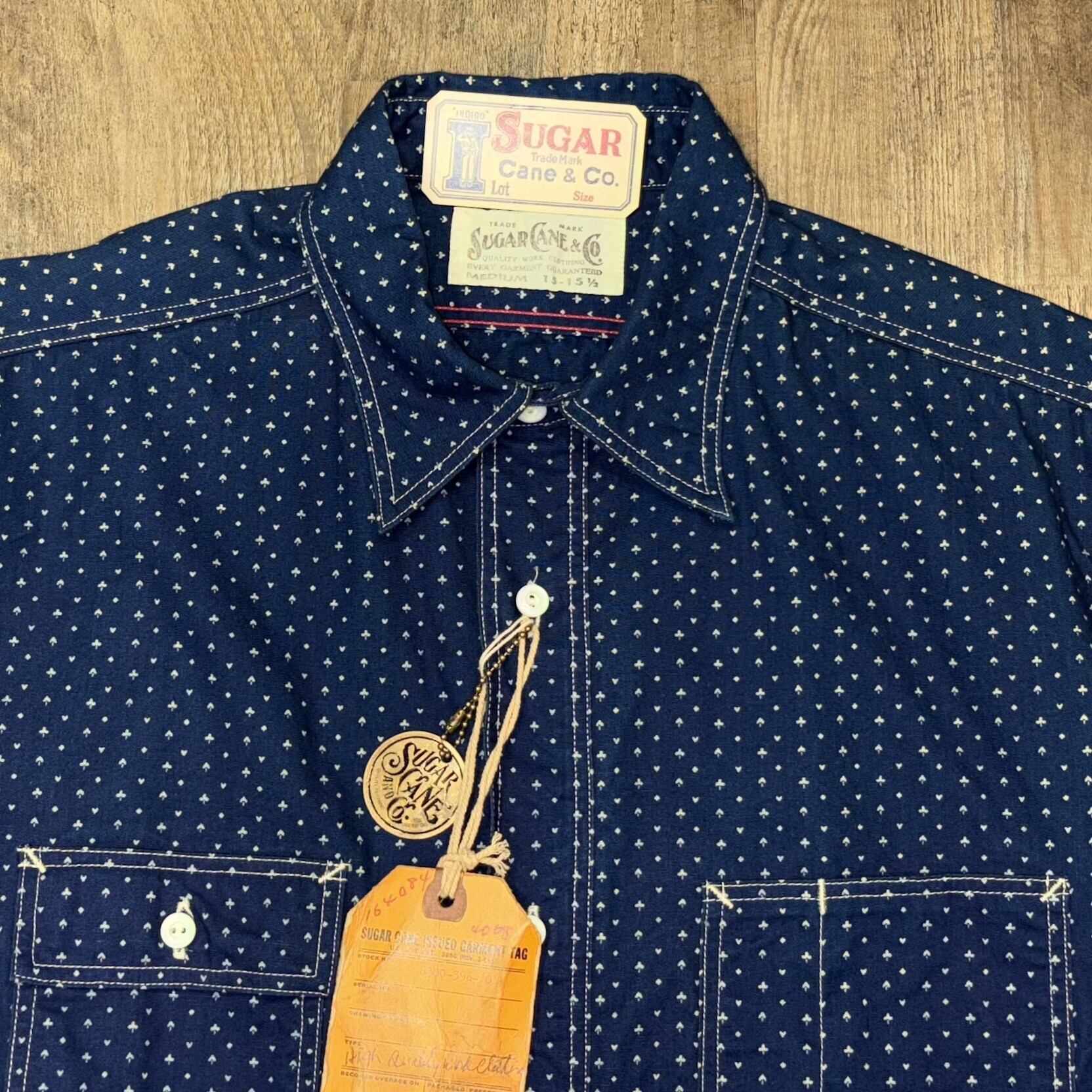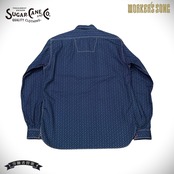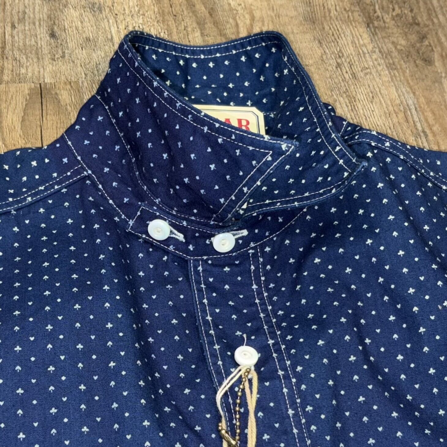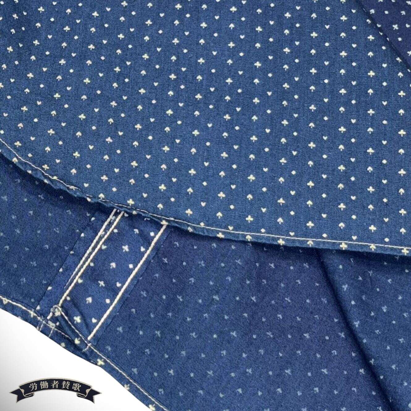 20世紀前半に実在した「カジノストライプ」のキャリコプリント生地を再現。4.5オンスの薄手のインディゴ生地に、♠♦♥♣マークを抜染(生地の色を白く染め抜くプリント手法)しており、軽やかなワークシャツに仕上げた。