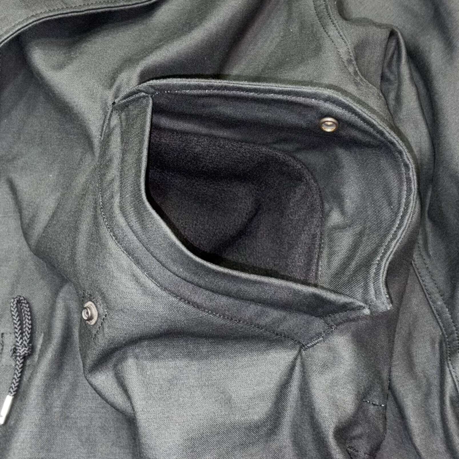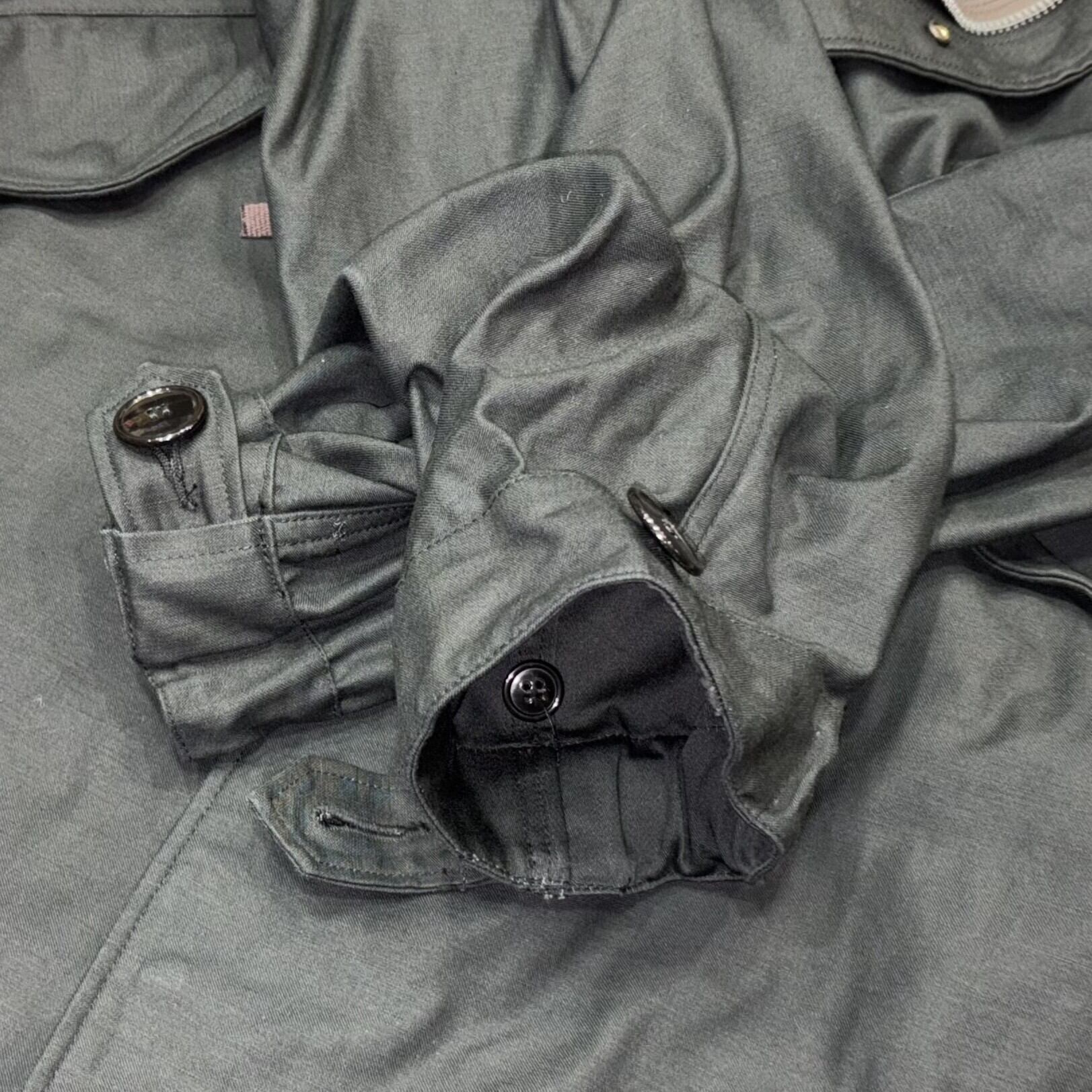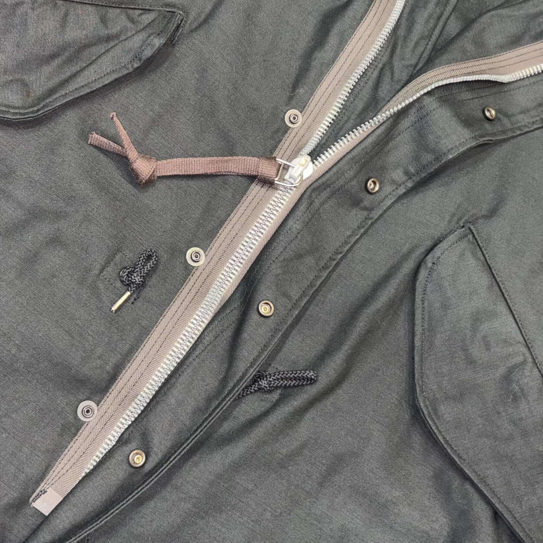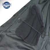 ポケット袋地に用いたウール素材と、袖口のラバーストラップのディテールは官給品と同じ仕様のブラックM-51パーカー。フードのサイズスタンプは一着毎に手押しされる。