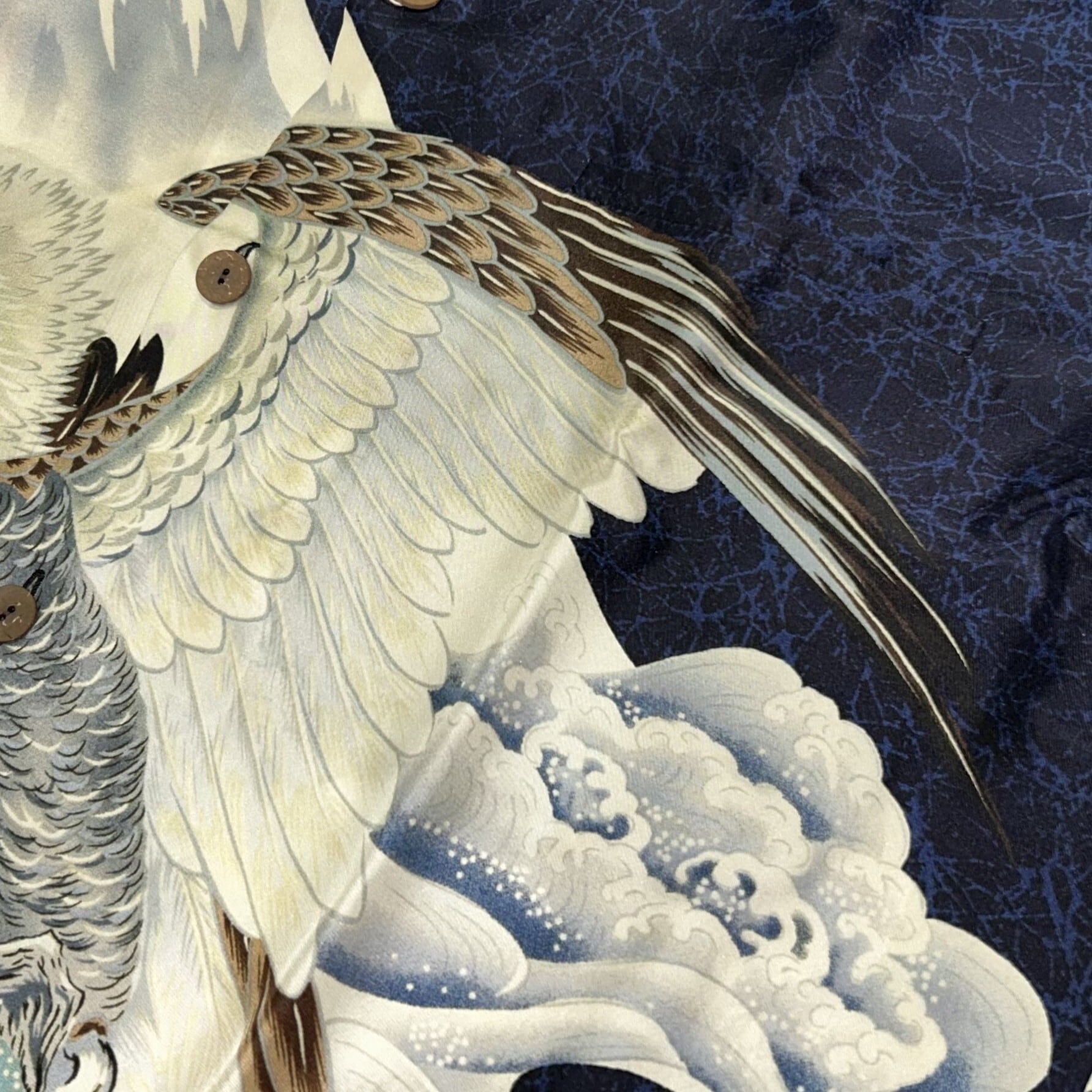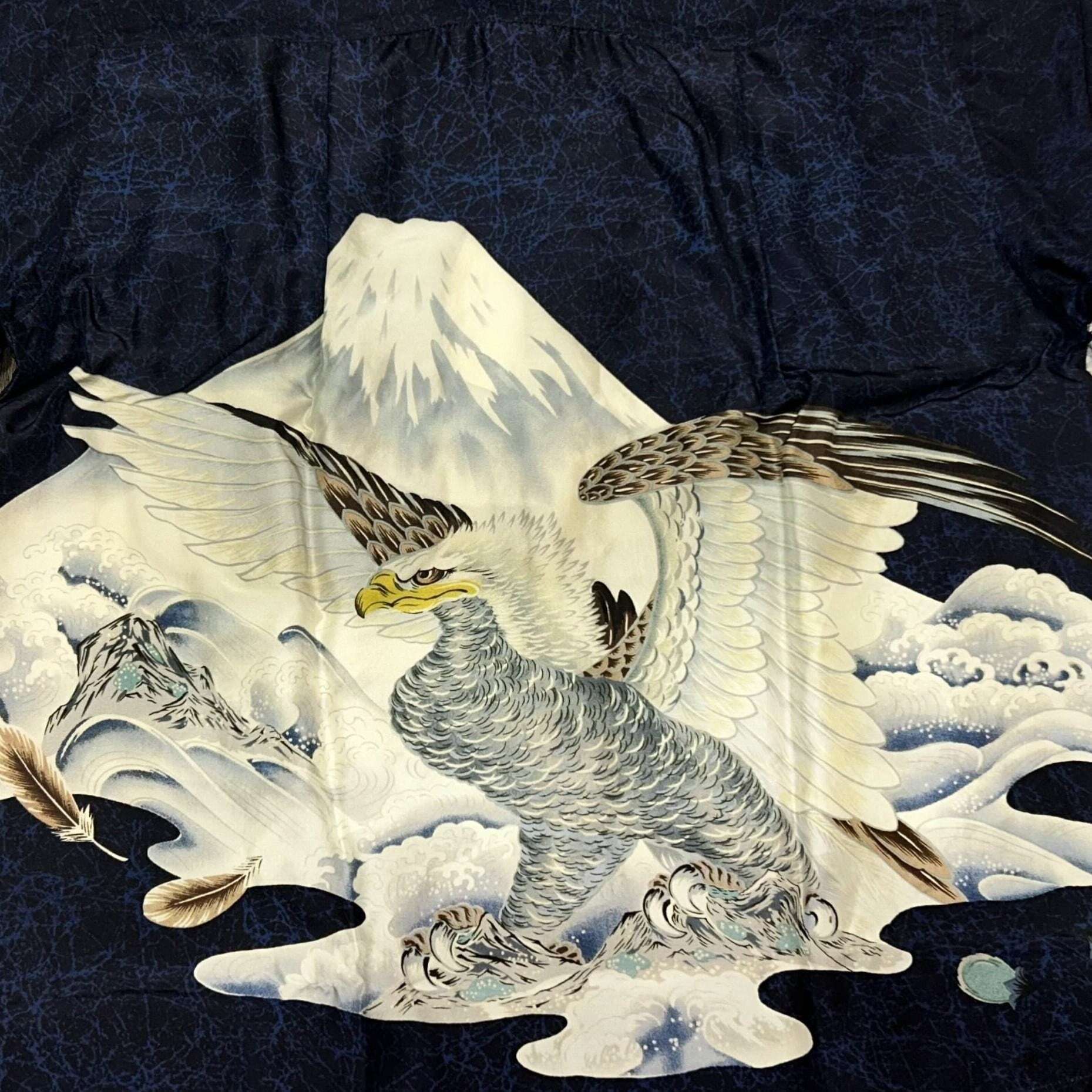 リクエストが絶えない人気の柄。雄大にそびえ立つ富士山をバックに、己を誇示するかの如く翼を広げる鷹。その傍らには茄子(なすび)も描かれている。ハワイに渡り厳しい状況で生活していた当時の日系移民たち。彼らは日本に想いを馳せ、縁起物を好んで身につけていた。その文化を象徴する、まさに歴史を語る一着。
