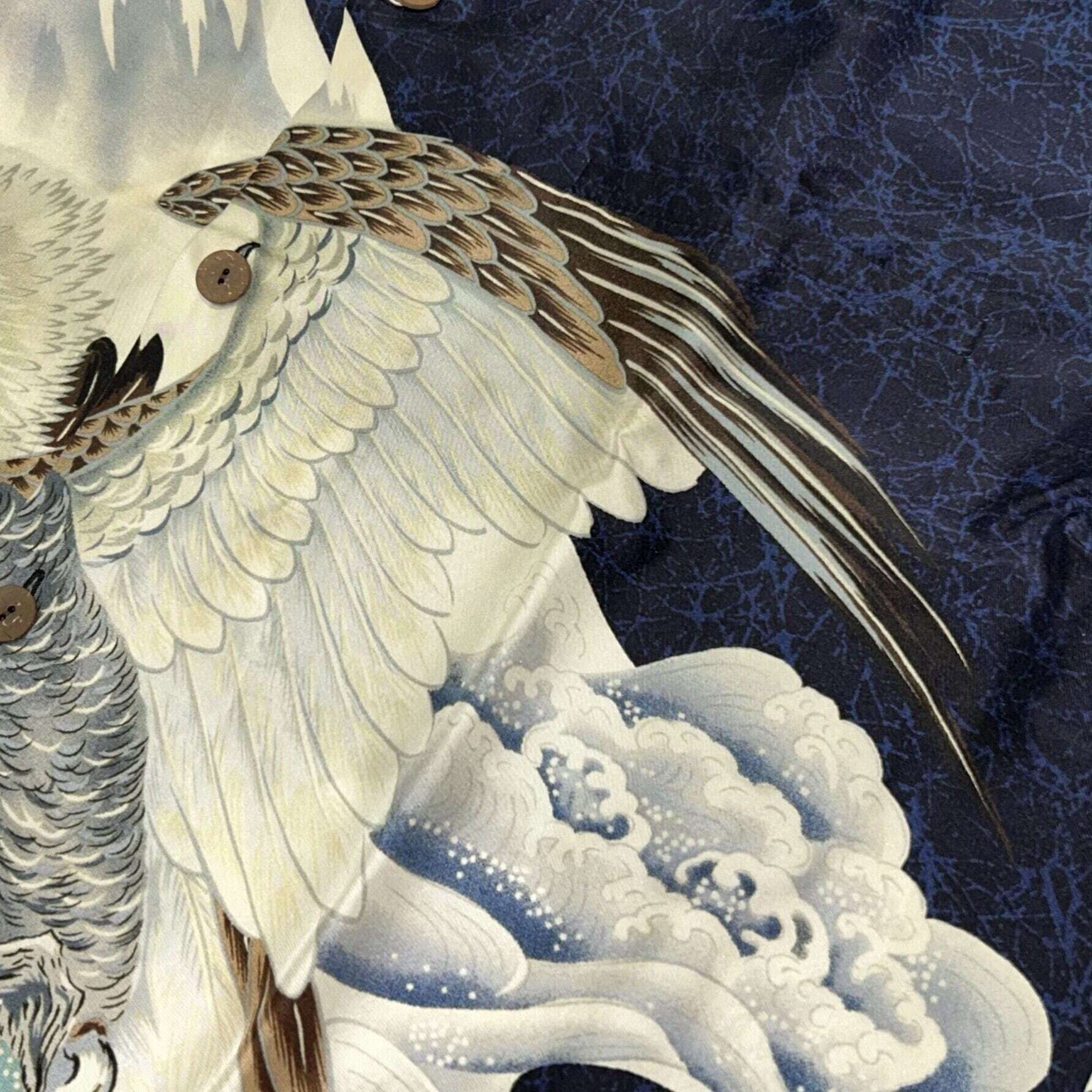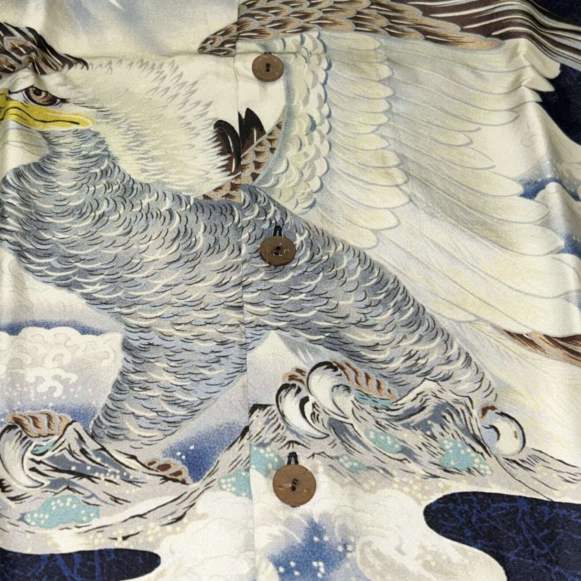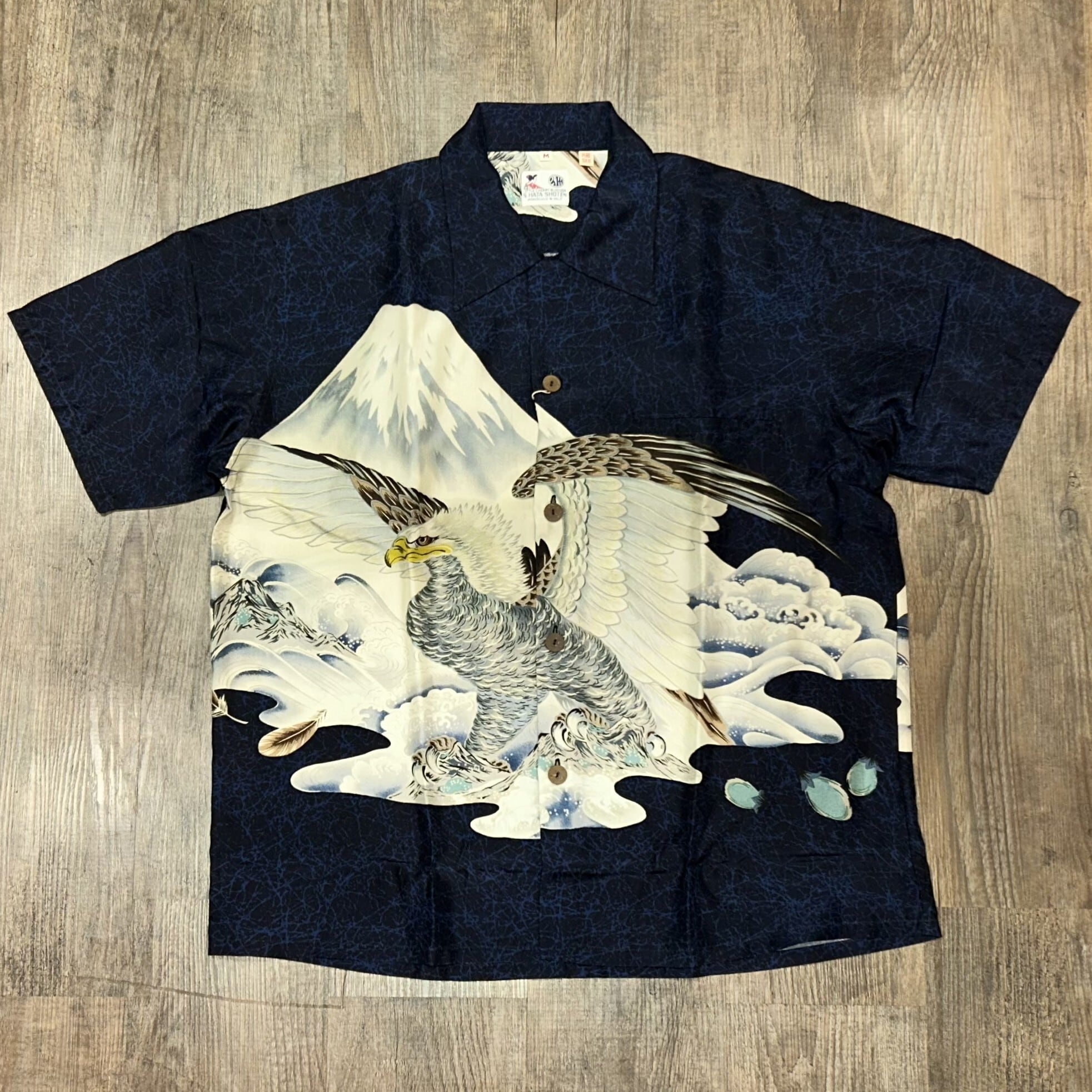 襟元につくラベルは「S.HATA SHOTEN」に漢字の「畑」の文字がデザインされた初期のもの。繊細なタッチで描かれた巨大な鷹を前身頃で柄合わせしており、非常に贅沢な仕様となっている。本作は1950 年代前期に富士絹(シルク)で製作されたオリジナルを元に復刻しているが、ヴィンテージでは他にレーヨン・フジエットやレーヨン壁縮緬で作られた同柄のシャツも確認されている。
