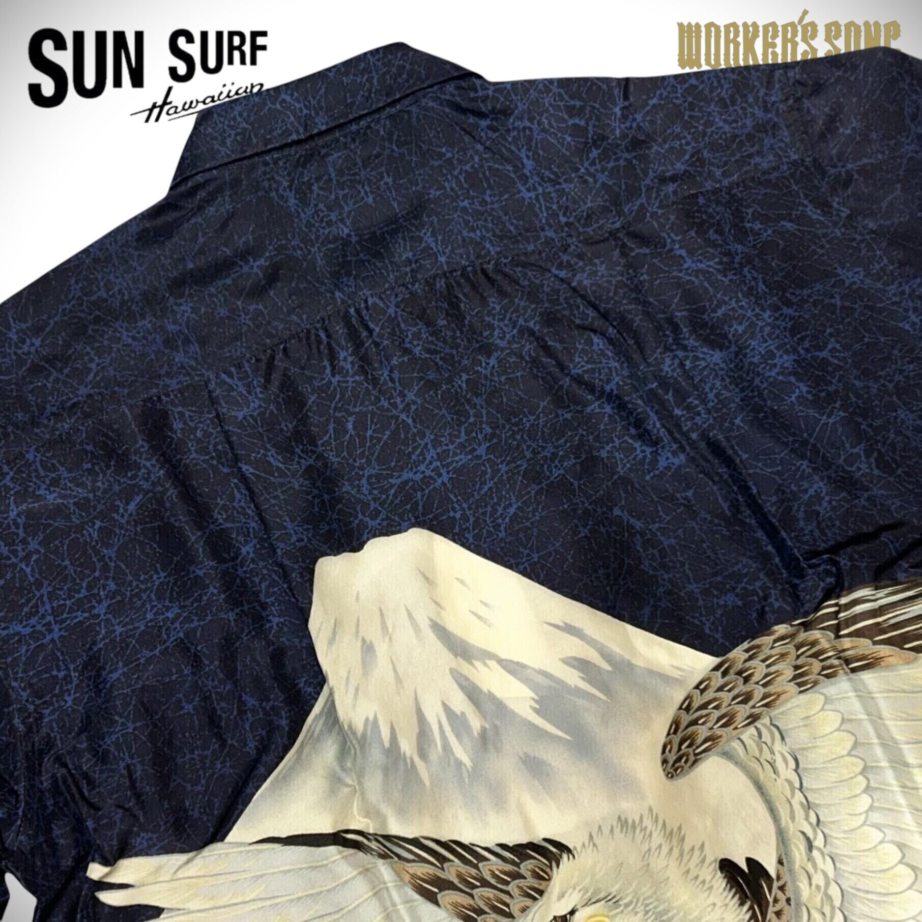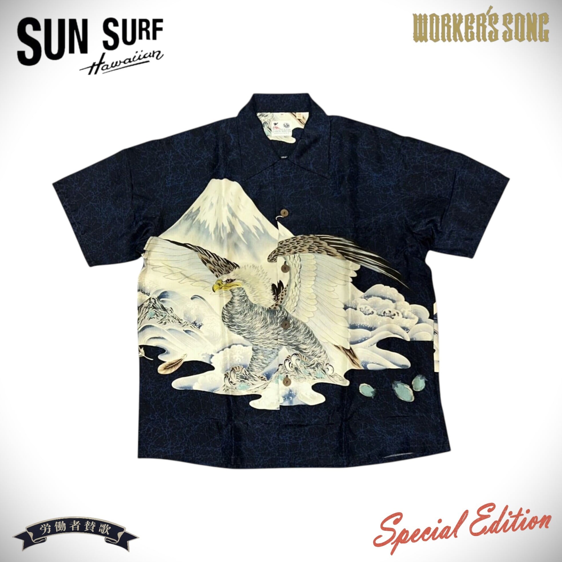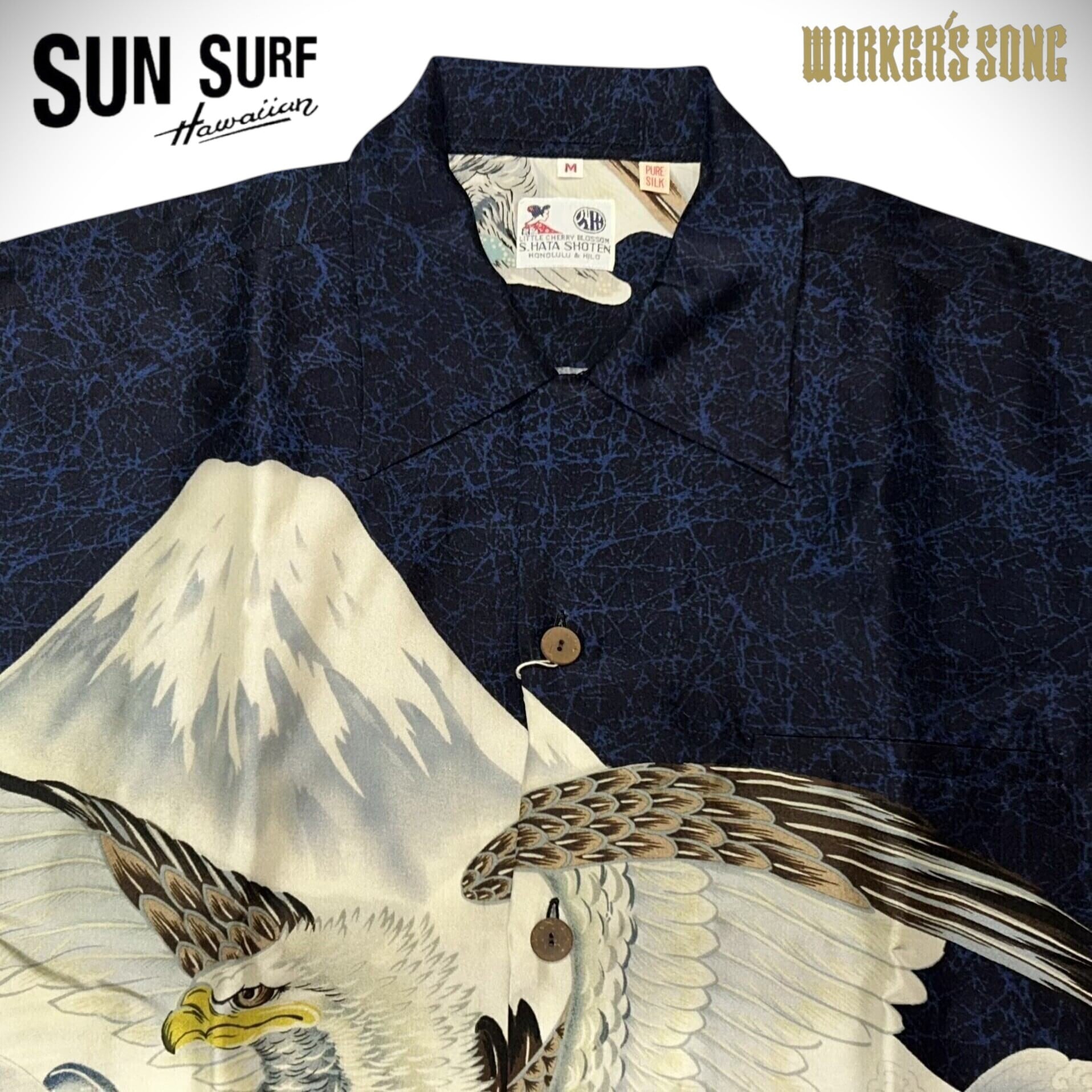 襟元につくラベルは「S.HATA SHOTEN」に漢字の「畑」の文字がデザインされた初期のもの。繊細なタッチで描かれた巨大な鷹を前身頃で柄合わせしており、非常に贅沢な仕様となっている。本作は1950 年代前期に富士絹(シルク)で製作されたオリジナルを元に復刻しているが、ヴィンテージでは他にレーヨン・フジエットやレーヨン壁縮緬で作られた同柄のシャツも確認されている。