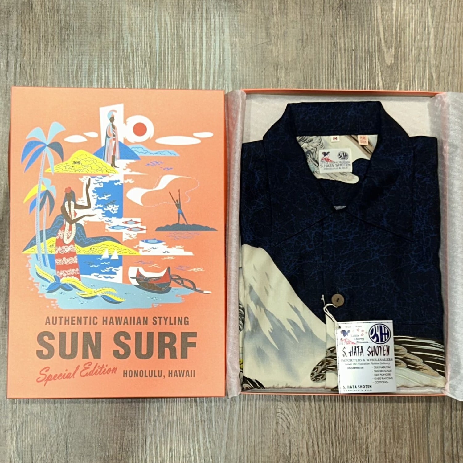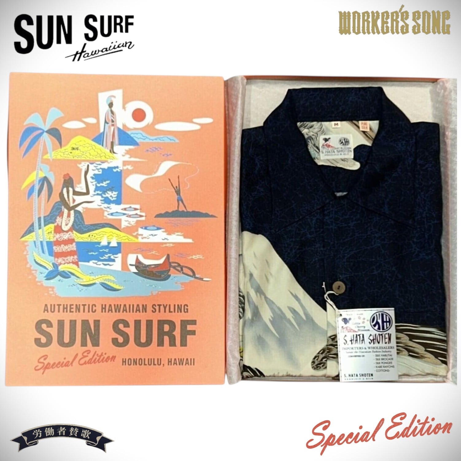 戦前より日本製の生地を扱い、アロハシャツの歴史において大きな役割を果たしてきたブランド、S·ハタ商店。日系の生地コンバーターでもあった同社は日本の大手生地商社「市田」と手を組み、日本製のシルク羽二重、レーヨン壁縮緬、綿、ポリネシア・プリントなどの生地を輸入して、当時のハワイのローカルブランドであったハレ・ハワイ、トロピカーナ、マリヒニなどに卸売をしていた。また自社でもオリジナルのデザインを日本へ発注し、多くの個性的なデザインを世に残している。