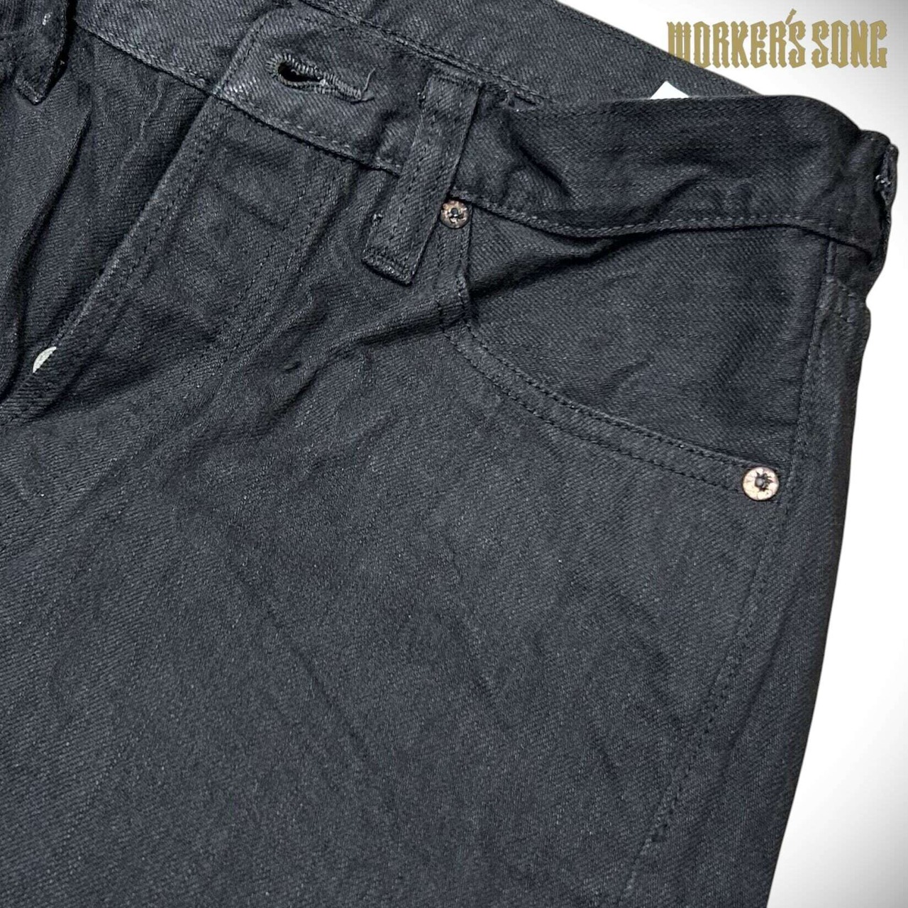 鉄製のボタンや打ち抜き式のリベット、番手の異なるブラックの縫製糸を使い分け、 特に負荷のかかる箇所には太糸を使うなど、1940年代のディテールをベースにしている。