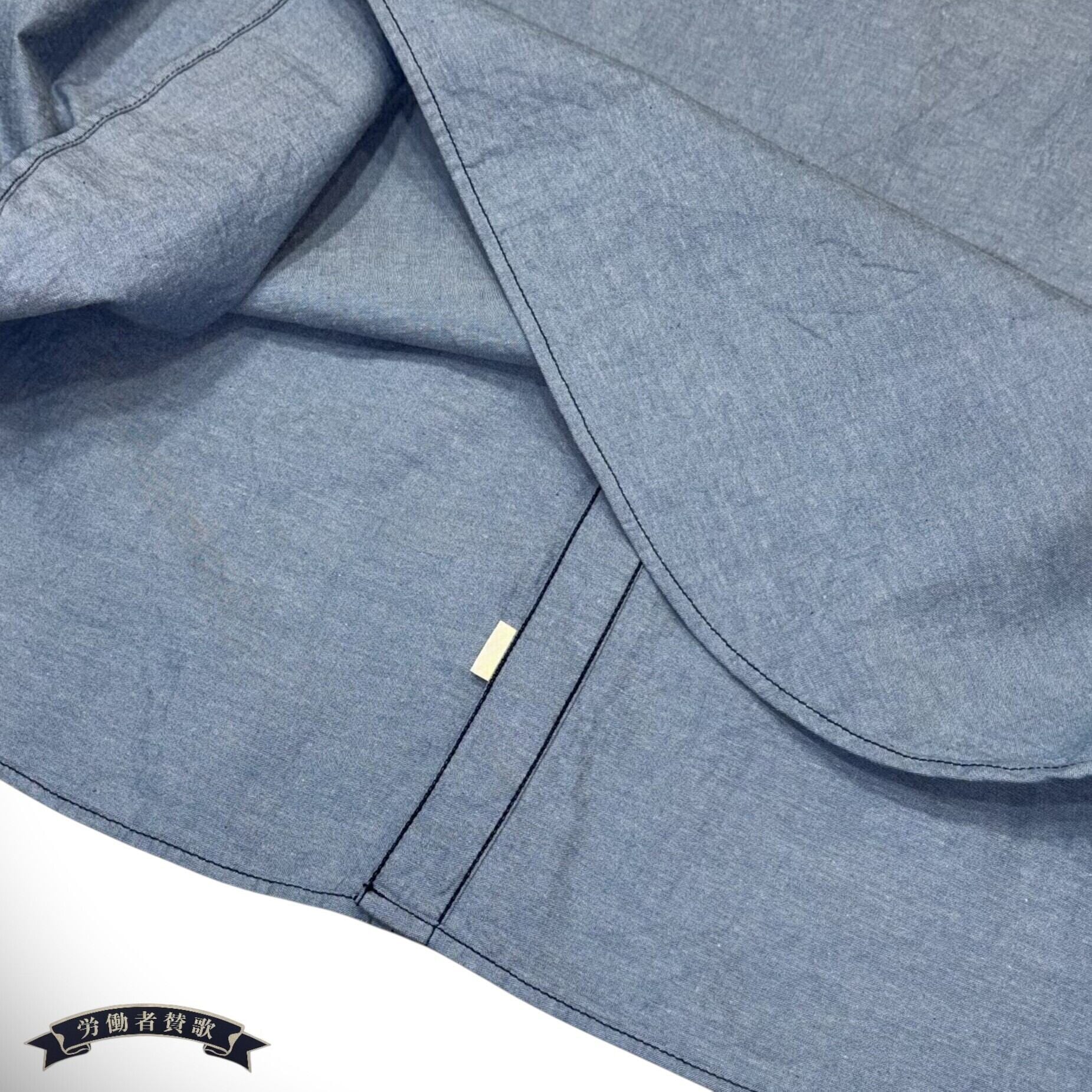 経糸はインディゴブルー、緯糸は経糸と濃度の異なるブルーで織られた1950年代の通称”ベタシャン”ワークシャツ。緯糸に生成の糸を使用している通常のブルーシャンブレーとはまた一味違った経年変化を楽しめる。運針が細かい2本針巻縫い、脇裾のマチと空環仕様、前立てに付けられたユニオンチケットなどのディテールは当時のまま再現している。