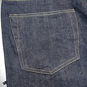 スリムテーパードシルエット。旧式の力織機で織り上げた14.25オンスのセルビッジデニムを採用しており、大腿部のヒゲや膝裏の蜂の巣状のアタリなど、ライトオンスのデニムとは一線を画すエイジングに期待できる。