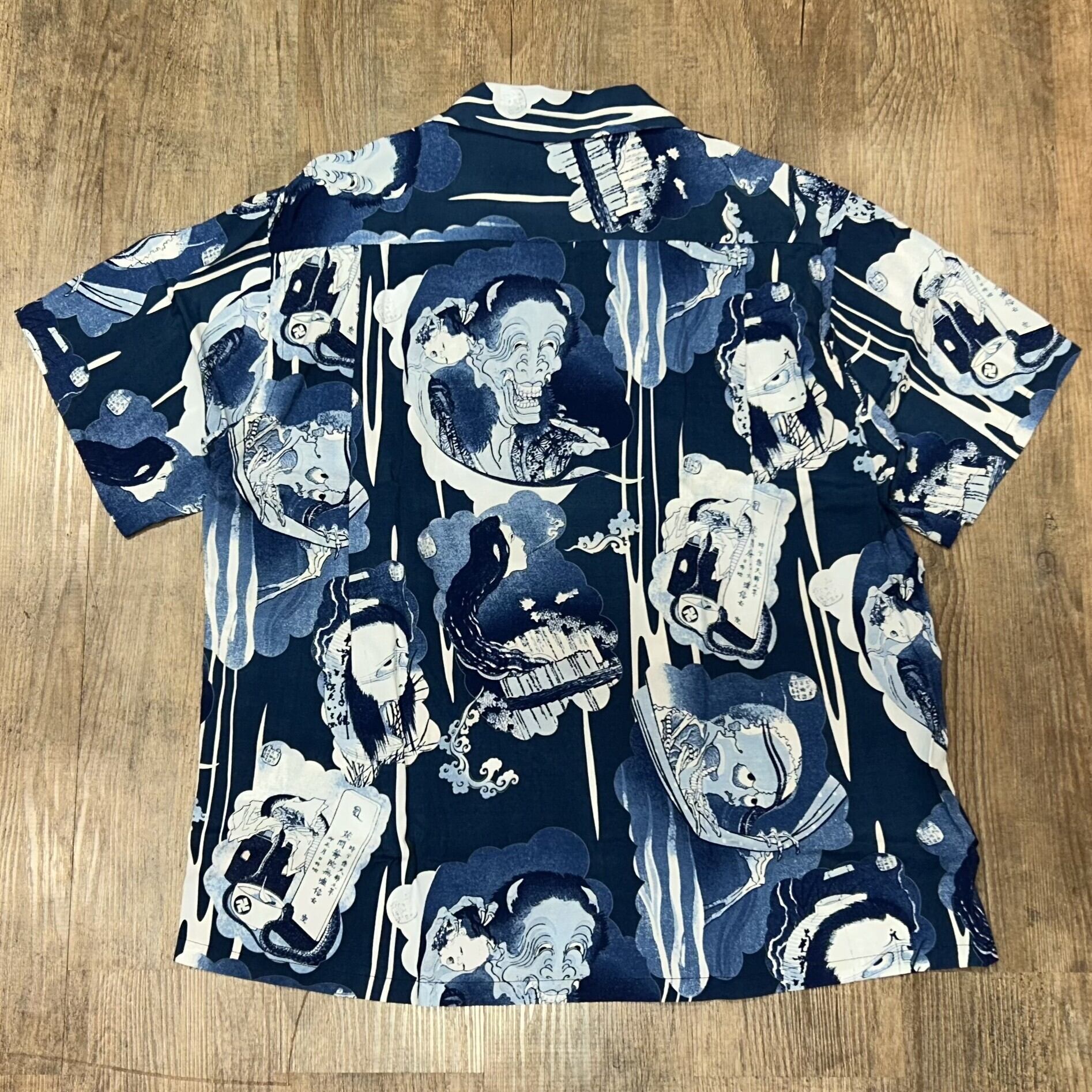 多数ある北斎の百物語シリーズから、今回は代表的な5作をコラージュし、ひとつの作品として展開。北斎が自身の作品のこだわりとして使用していた「藍」を捺染に用いているのもこのアロハシャツの特徴である。
