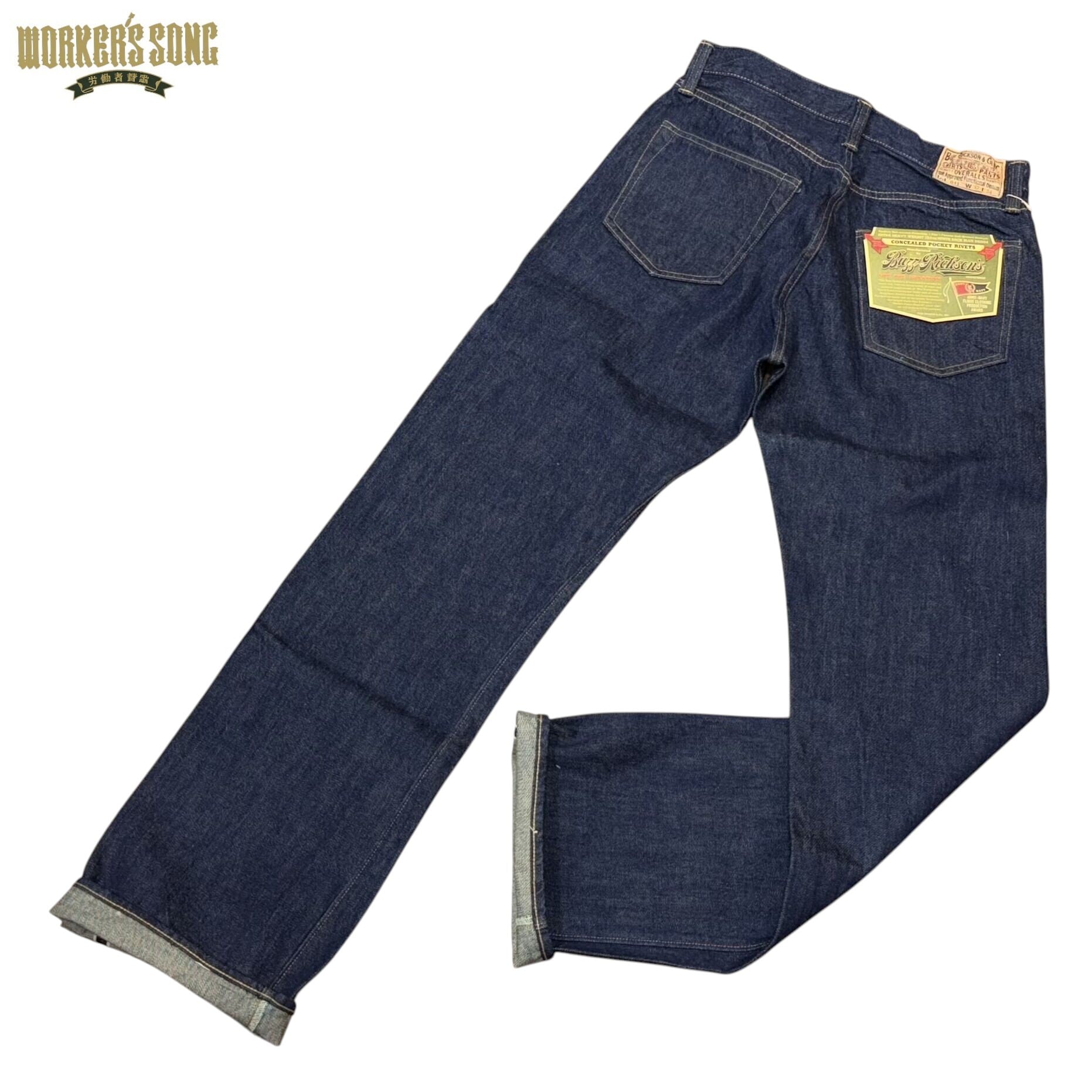 第二次世界大戦の戦時下において物資不足を解消するために統制を受けて誕生したデニムウエストオーバーオールズ。それまでのモデルで付いていたコインポケット口のリベットやヒップポケットのバータックは省略された。フラッシャーに記されている“FOR THE DURATION”とは『戦争の期間中』という意味で、戦争が終わるまでの間、物資統制による仕様変更の旨が記されている。1940年代、米国政府は優秀な軍需品を手掛けた企業に対してその功績を称えてExcellent(優秀)を意味するEペナントを進呈した。大戦当時、バズリクソンズがフライトジャケットのコントラクターを務め、Eペナントを受賞したという夢のフラッシャーが実現されている。
