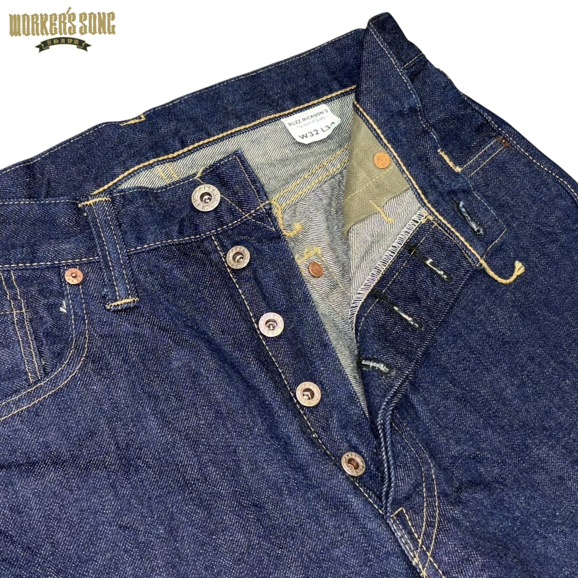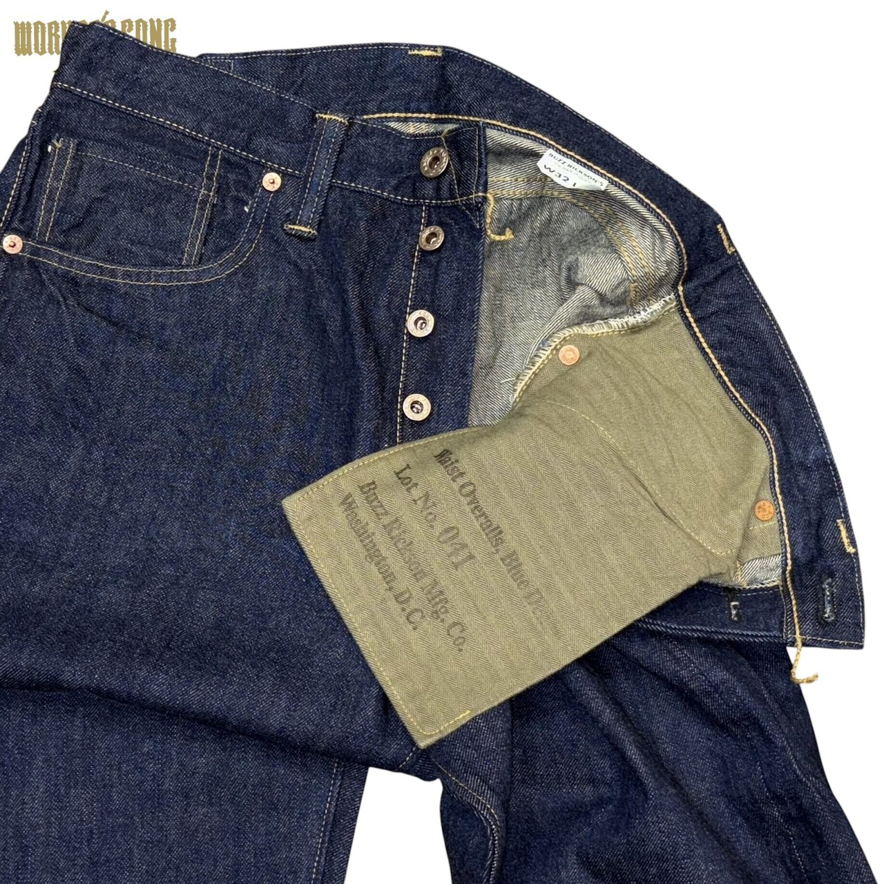 鉄製の唐草柄ドーナツボタン。コインポケットは戦時の物資統制によってリベットが省略されている。熱を与えると縮みが激しいラベルは取り扱いに注意が必要。オリジナルのセルビッジデニムを使用。左右で高低差があり味わい深いバックヨーク。オリーブ色のヘリンボーンツイルを使用。ポケットの中で耳付きを確認できる。隠しリベットの上は通常バータックだが本縫いが大戦モデルの特徴。ざらつきのある13.6oz.のオリジナルデニム。