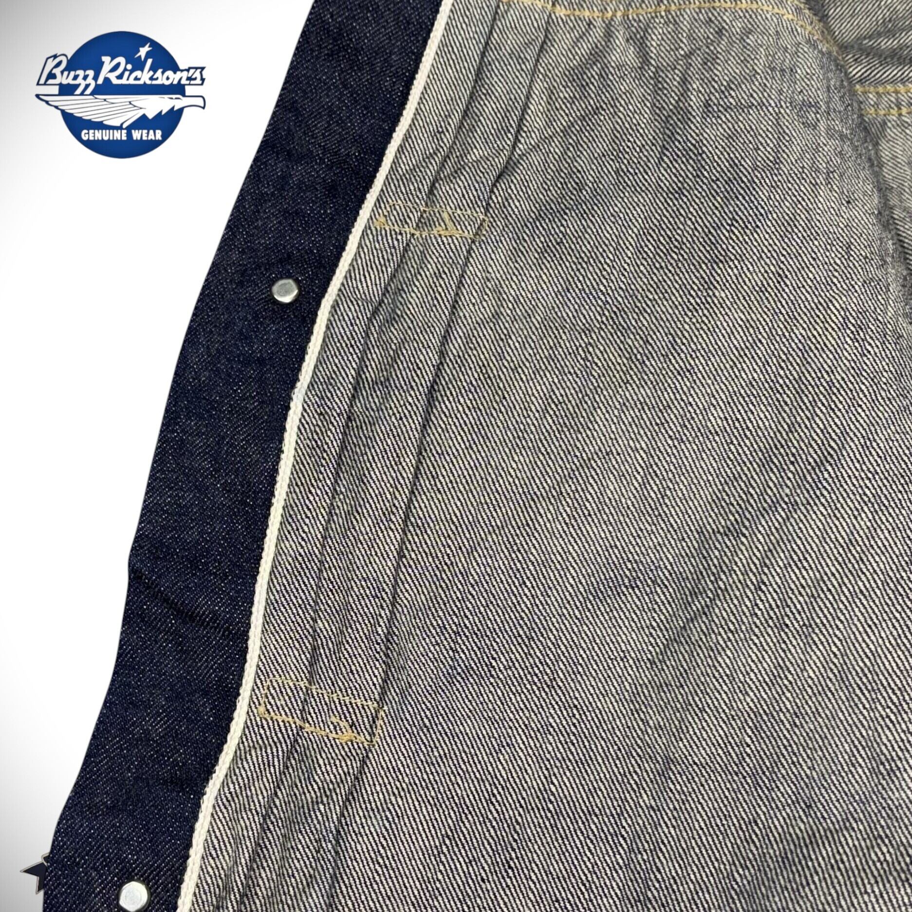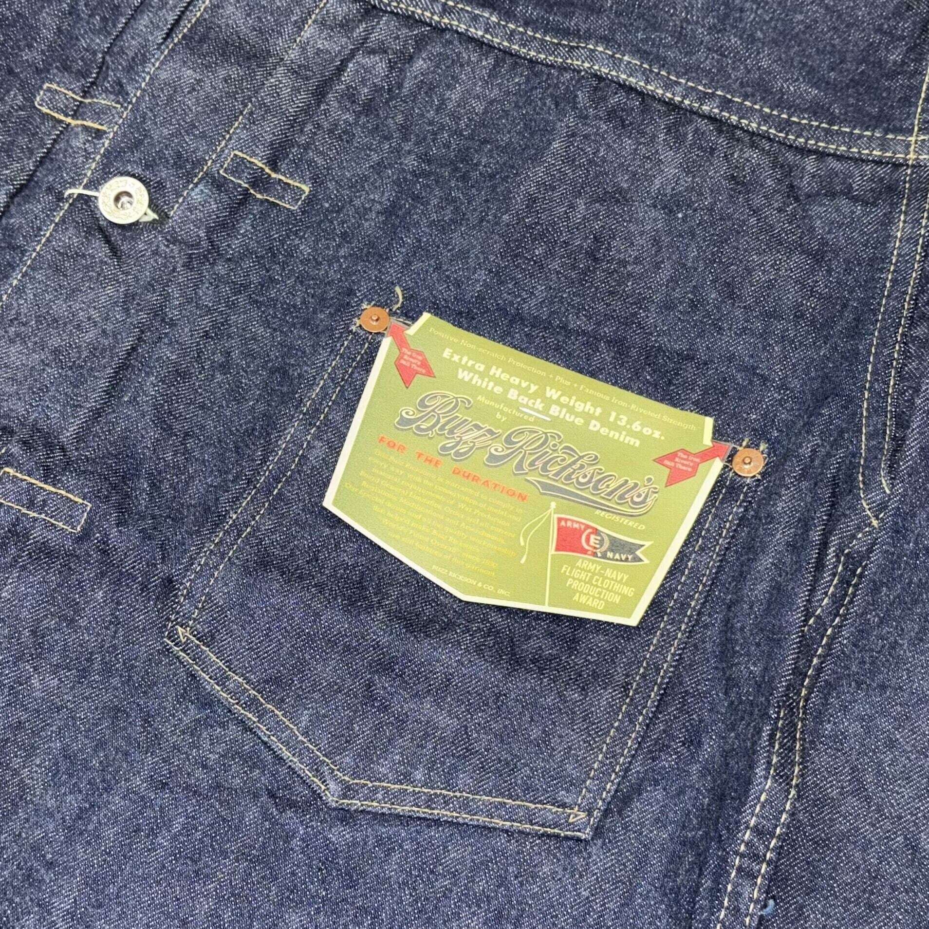ベジタブルタンニングのディアスキンラベル。鉄製の唐草柄ドーナツボタン。左身頃のプリーツステッチは縫い始まりと終わりが上で、右身頃は下が縫い始まりと終わりになる。手作り感のあるポケットステッチ。見返し裏にはセルビッジが見える。運動性を与えるプリーツ。手作り感のあるステッチとリベット位置。地の目を縦使いしたカフス。横使いと表情が変わってくる。ざらつきのある13.6oz.のオリジナルデニム。