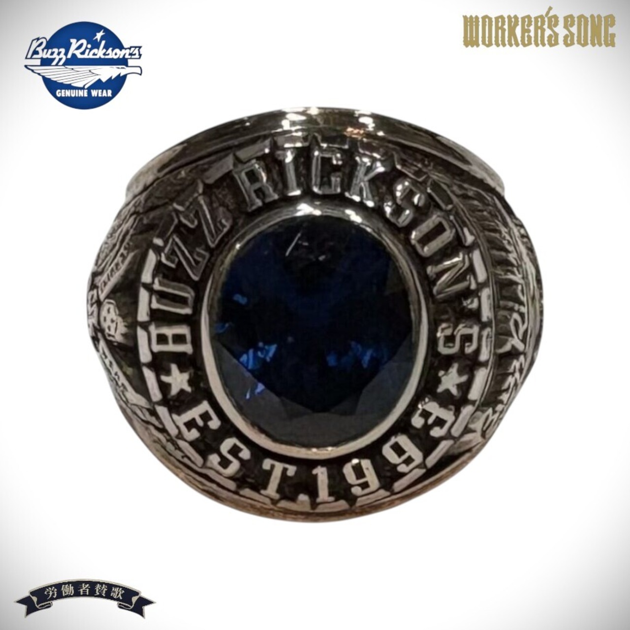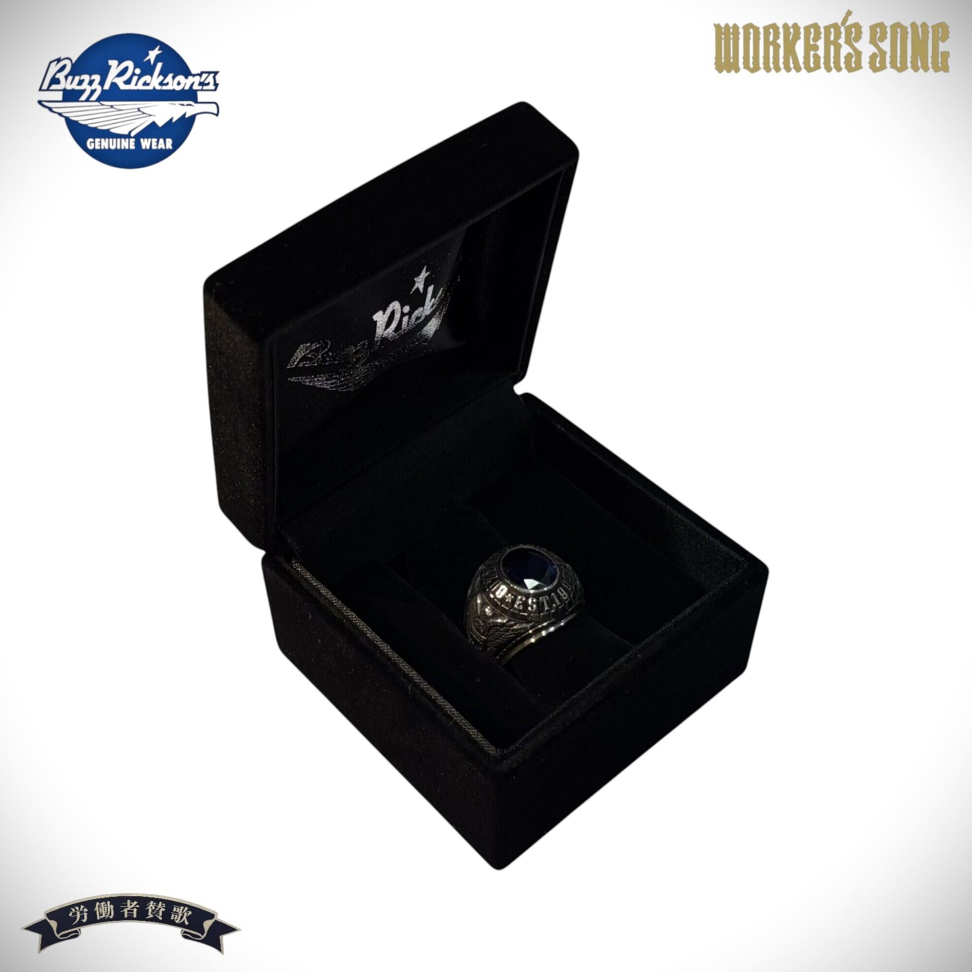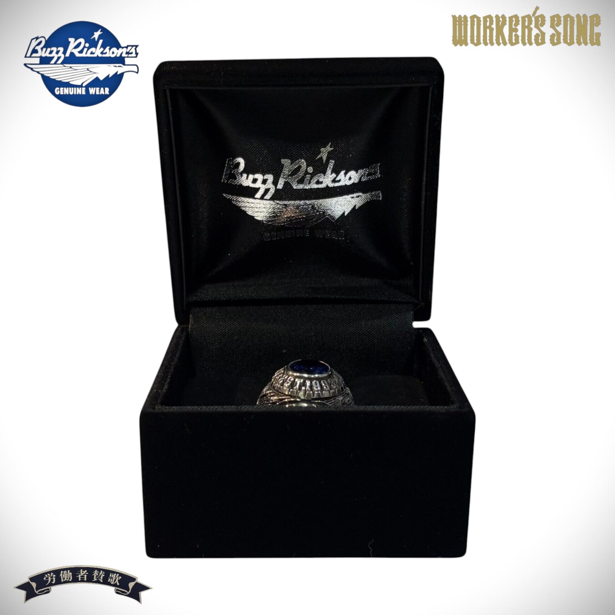 バズリクソンズの30周年記念リングは、その日本プロスポーツのチャンピオンリングと有名大学のカレッジリングを手掛ける確かな技術を持つメーカーに製作を依頼。地金はスターリングシルバー925で、センターストーンにはブランドカラーを彷彿させるサファイヤを起用。古典的な金型にシルバーを鋳造後、熟練職人によって一つづつ手彫り、研磨、黒美仕上げの工程で製作されている。