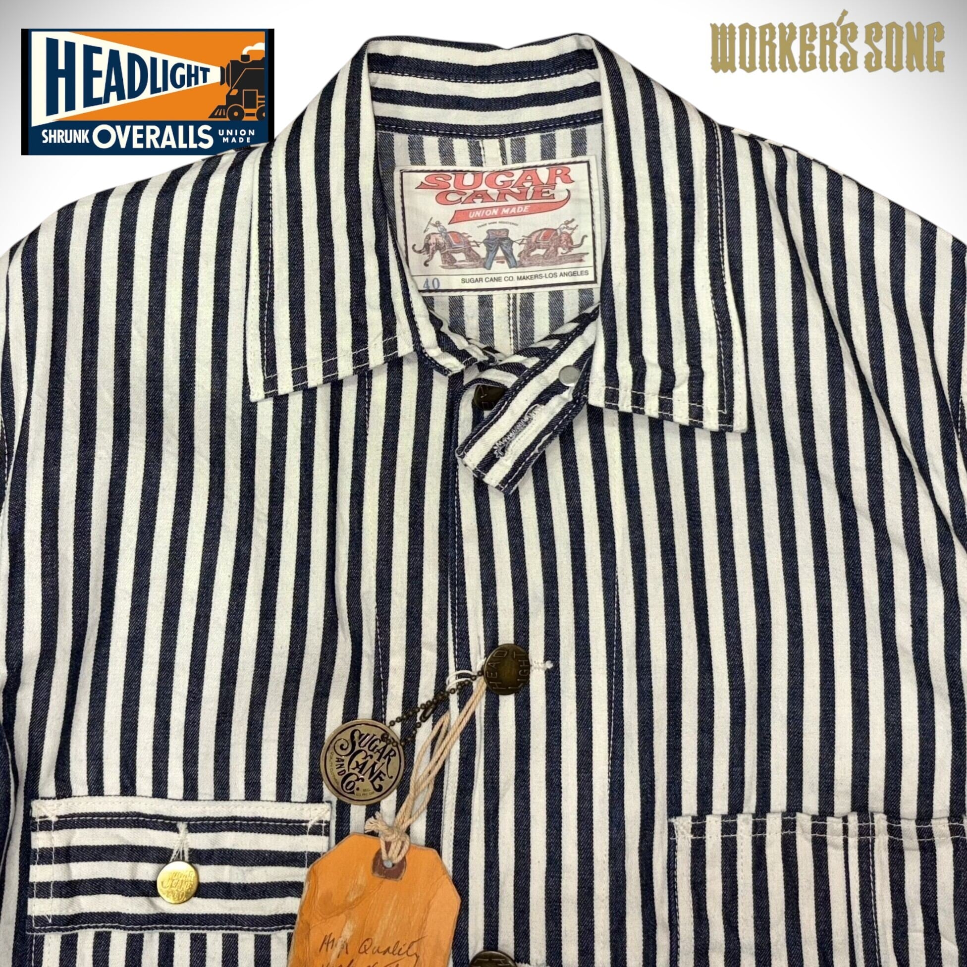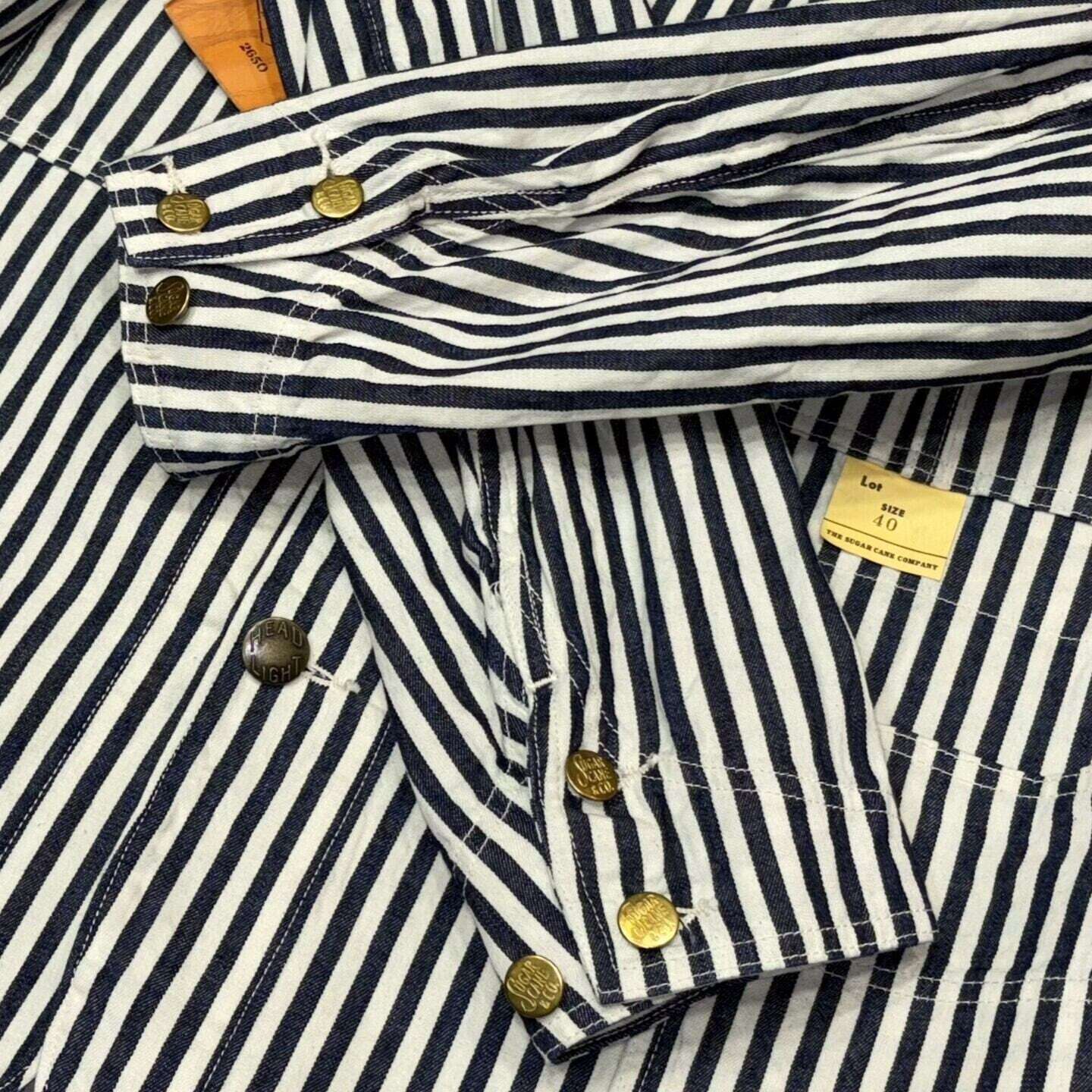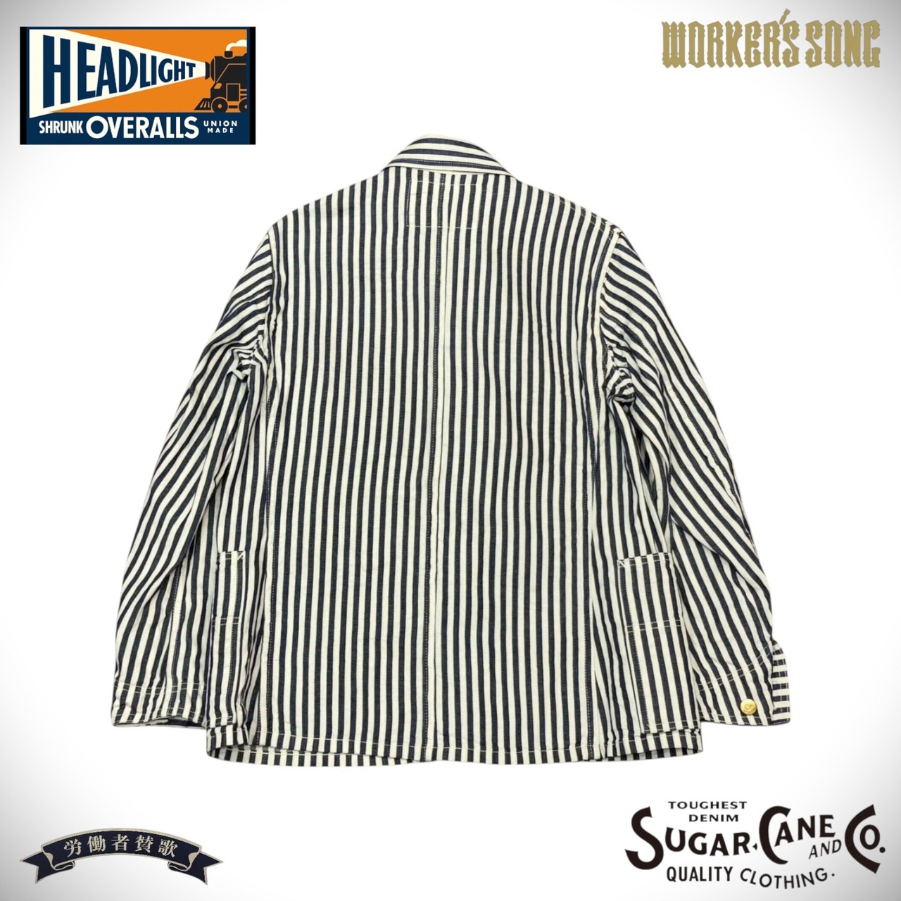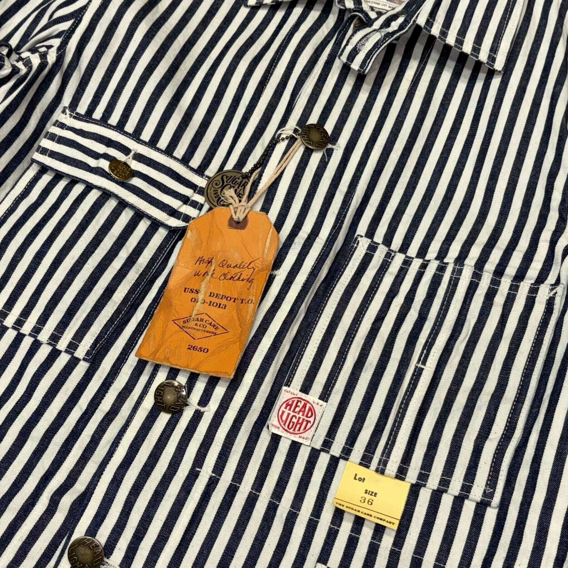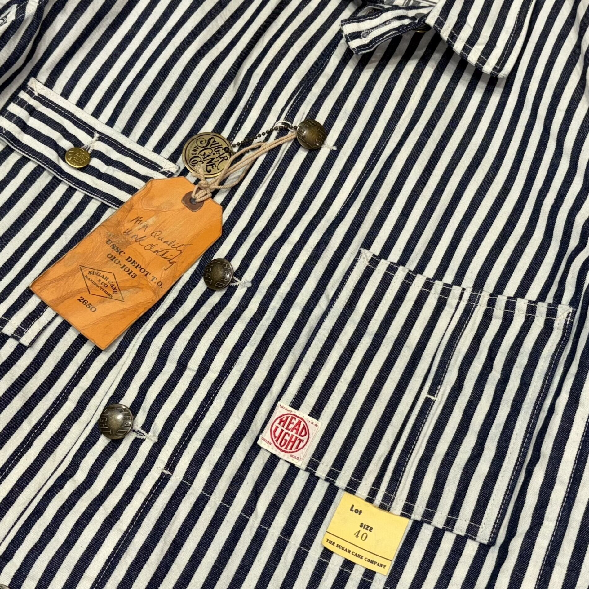 シュガーケーンとヘッドライトのダブルネームで製作されたワークウェア。7オンスの1/2インチ巾や1/4インチ巾のインディゴストライプ生地はNOSで、ミスターフリーダムより入手して日本で縫製している。